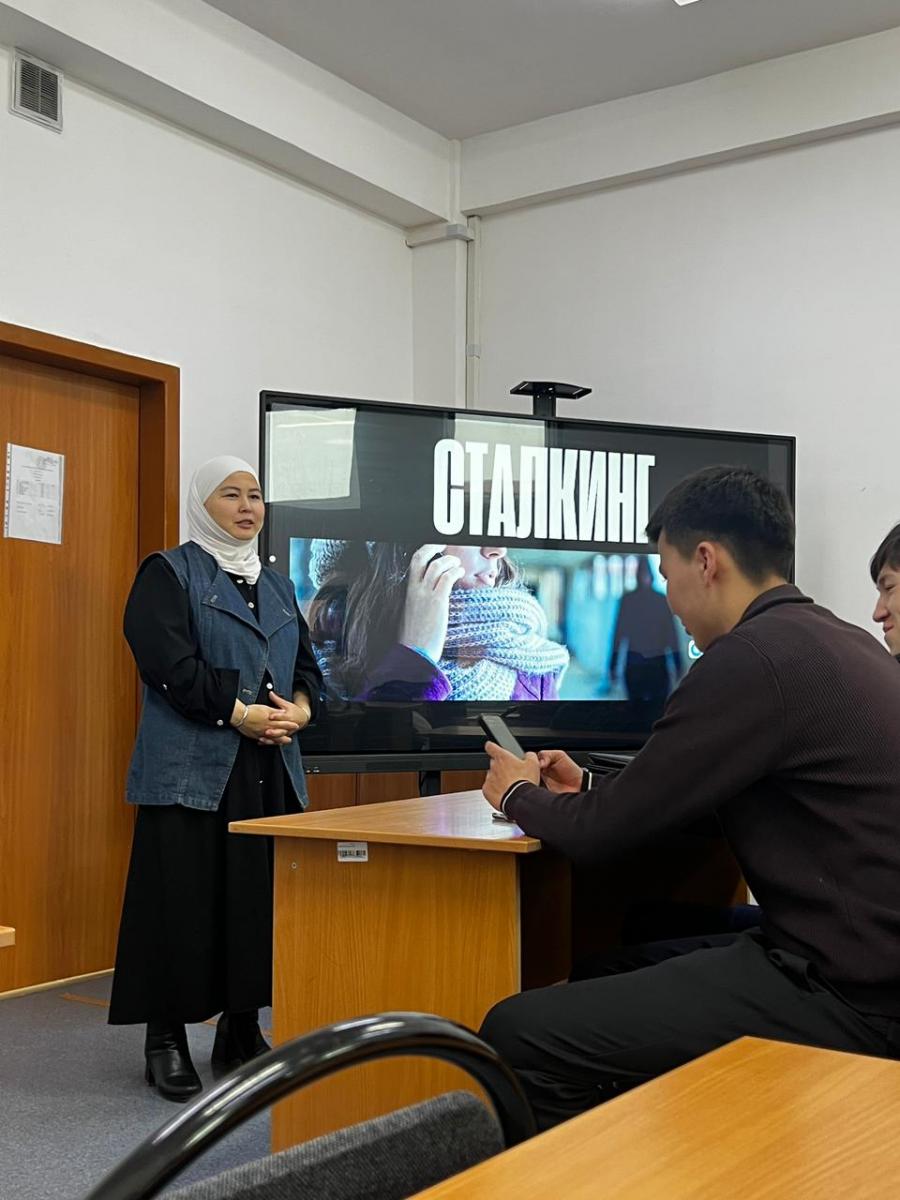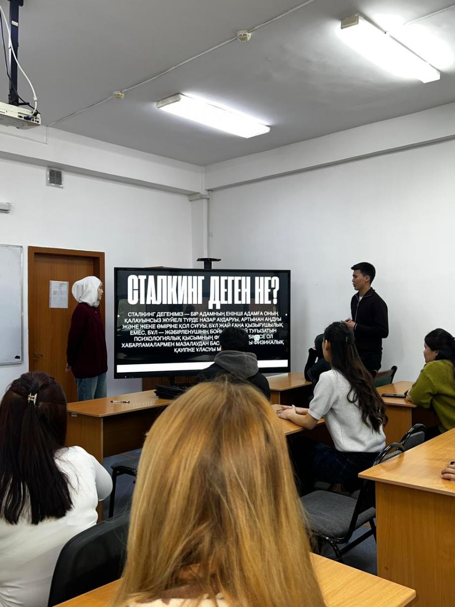 Іс-шараға университеттің кәсіби психологы Лязат Мырзашова арнайы қатысып, сталкингтің психологиялық және әлеуметтік қырларын жан-жақты түсіндірді. ????✨ Ол бұл құбылыстың адам өміріне, эмоционалдық жағдайына және қауіпсіздігіне тигізетін әсеріне тоқталып, мұндай жағдайда өзін қалай қорғау керектігі жөнінде нақты кеңестер берді.