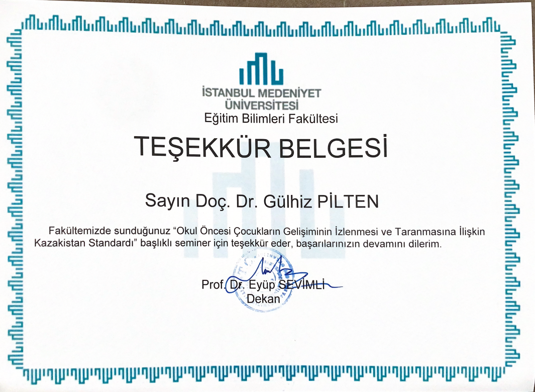 Ыстанбұл Мәдениет университетінің Педагогика факультетінің оқытушы профессор құрамына Білім беру және гуманитарлық зерттеулер факультетінің деканы, Педагогика және психология кафедрасының доценті, PhD Алия Куралбаева және Мектепке дейінгі және бастауышта білім беру кафедрасының доценті, PhD Гүлхиз Пилтен «Мектеп жасына дейінгі балалардың дамуын бақылау және скрининг бойынша Қазақстан стандарты» және «Қазақстандағы мұғалімдердің білімі мен біліктілігін арттыру сағаттары практикасы» тақырыптарында семинар өткізді.