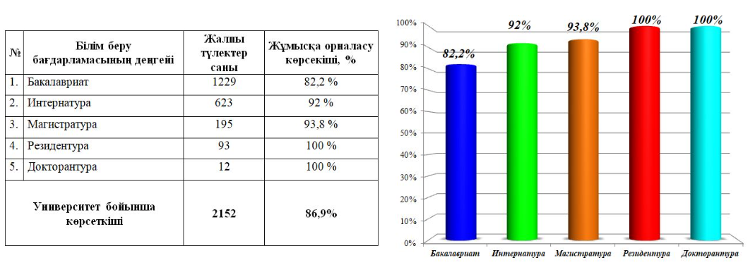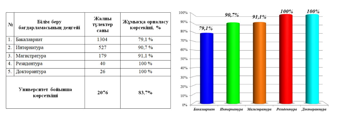 Университет кадрларды даярлау бағыты бөлінісінде бакалавриат түлектерінің бітіру жылы ішінде жұмыспен қамтамасыз етілуі қолданыстағы білім беру қызметіне қойылатын талаптарға сәйкес жүзеге асырылады.