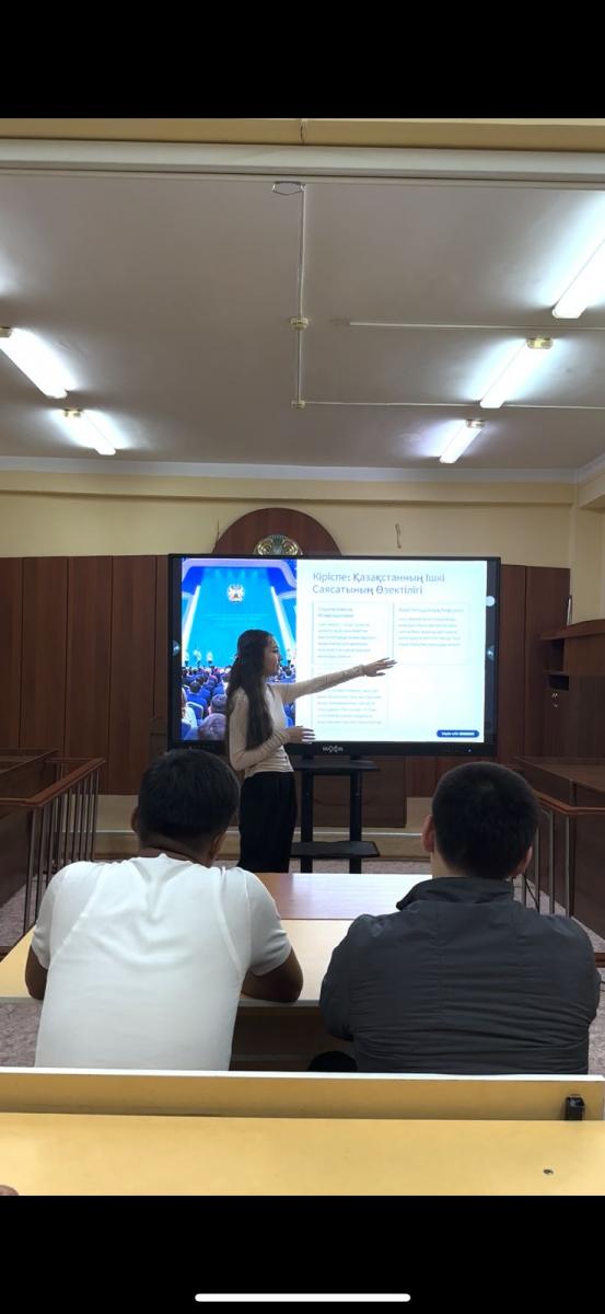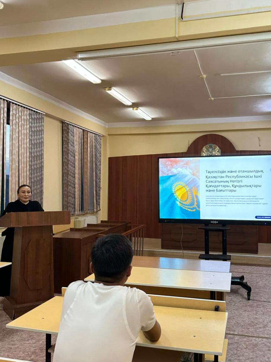 Тәрбие сағат барысында елімізде құқықтық мәдениетті арттыру, сыбайлас жемқорлыққа қарсы күрес, құқық бұзушылықтың алдын алу бағытында жүргізіліп жатқан мемлекеттік шаралар туралы ақпарат берілді. Одан кейін студенттермен еркін пікір алмасу ұйымдастырылды. Әрбір студент өз ой-пікірін білдіріп, қоғамда заң мен тәртіптің сақталмауы қандай салдарға әкелуі мүмкін екені туралы мысалдар келтірді. Кейбір студенттер өмірден алынған нақты оқиғалармен бөлісіп, заңсыздыққа төзбеу мәдениетінің маңыздылығын атап өтті.