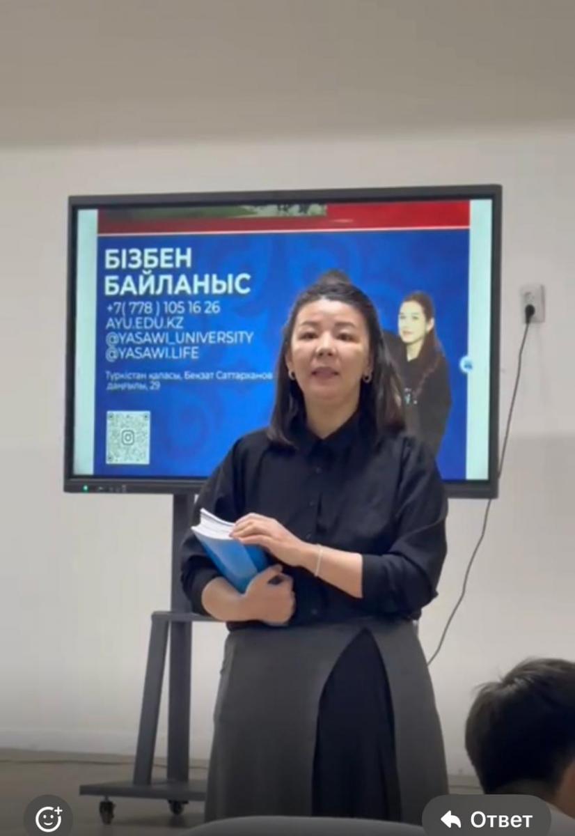 23 Şubat tarihinde, Din Bilimleri Anabilim Dalı Doçent Vekili, PhD Feride Bolatkızı, mesleki yönlendirme çalışmaları kapsamında Türkistan şehrinde bulunan Nomad Okulu’nun 10–11. sınıf öğrencileriyle bir araya geldi.