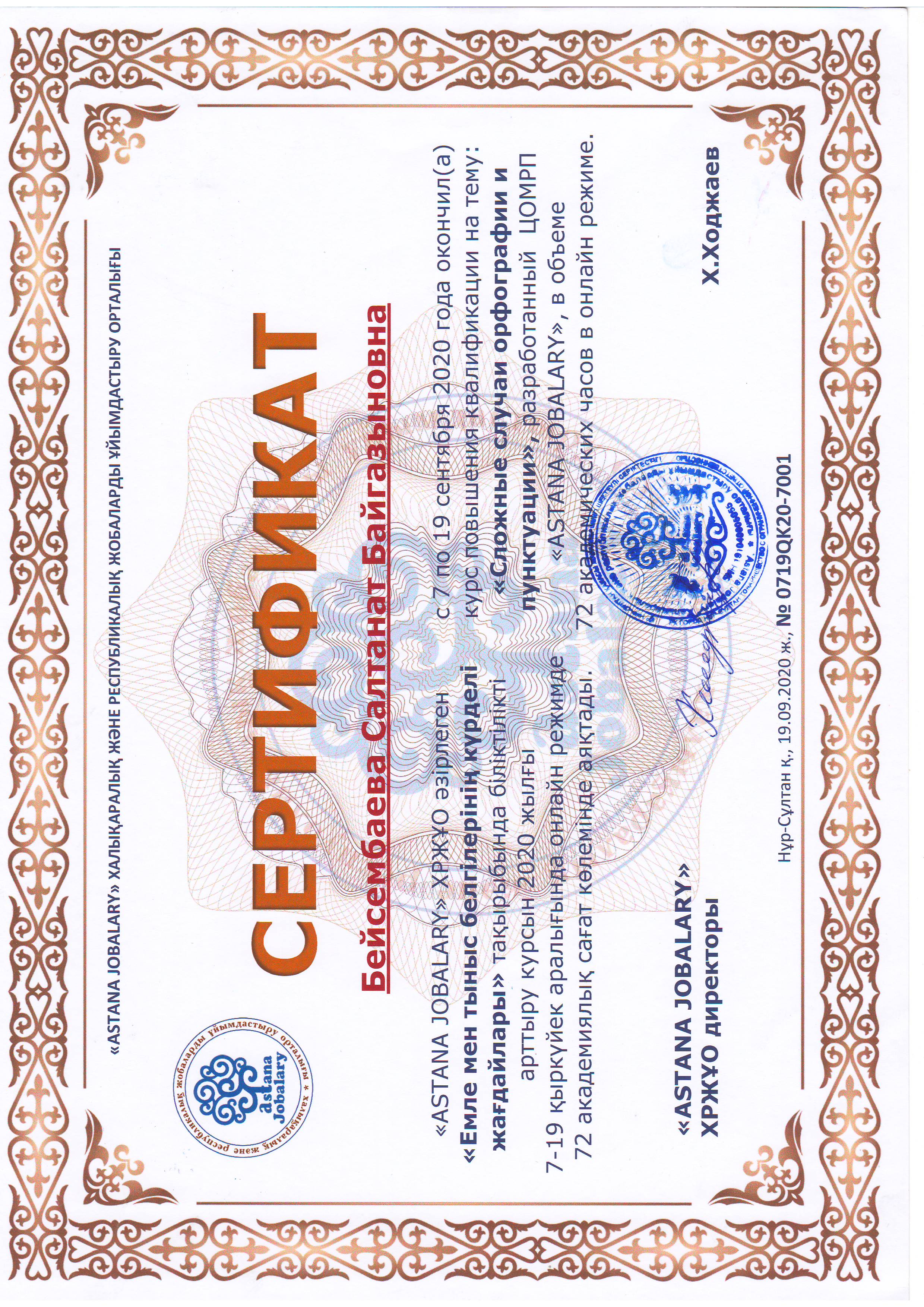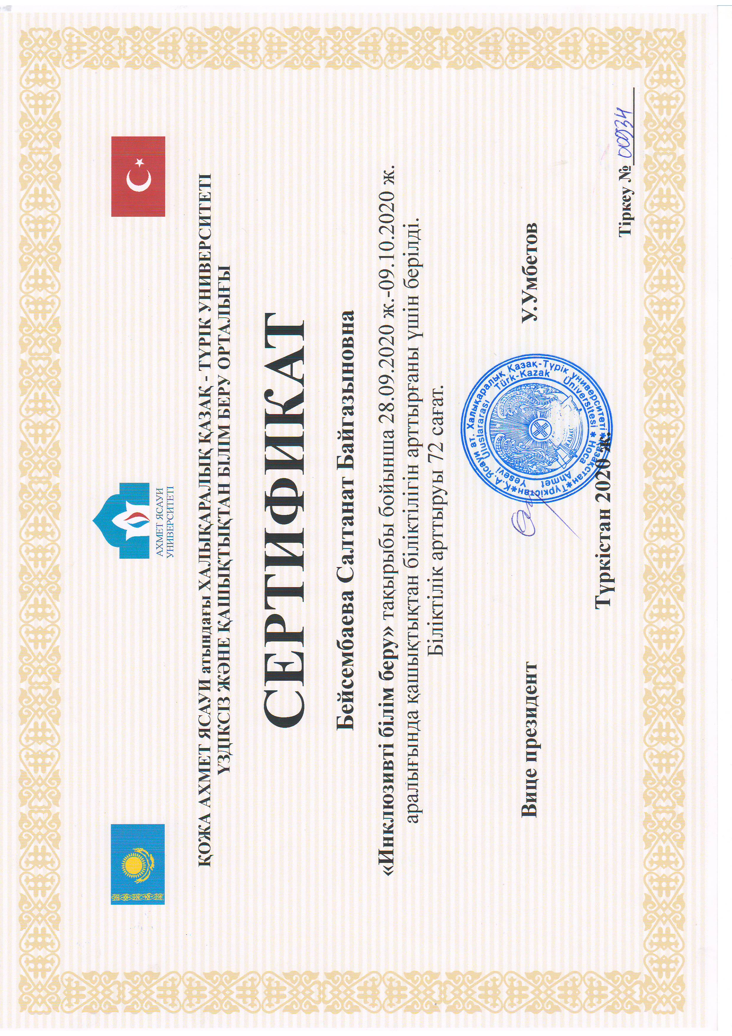 Бейсембаева Салтанат Байғазықызы (11.06. 1973 жылы Шығыс Қазақстан облысы Күршім ауылында туылған) – тіл білімі маманы.Бітірген оқу орны.1991-1996 жж. әл-Фараби атындағы Қазақ мемлекеттік ұлттық университетін ұлттық мектептегі орыс тілі мен әдебиеті мамандығы бойынша үздік бітірген. Ғылыми, көркем шығармашылығы мен саласы, басты жетістіктері мен еңбектері.2003 жылдың қантар айының 8 жұлдызында әл-Фараби атындағы Қазақ мемлекеттік ұлттық университетінің жанындағы диссертациялық кеңесінде «Невербальные компоненты коммуникации в казахском языке» тақырыбындағы диссертациясын қорғап, 2003 жылдың маусым айының 23 жұлдызында ҚР БҒМ Білім және Ғылым саласындағы қадағалау және аттестаттау комитетінің шешімімен 10.02.02 – қазақ тілі мамандығы бойынша филология ғылымдарының кандидаты ғылыми дәрежесіне ие болды.Бейсембаева Салтанат Байғазықызының тіл білімінің өзекті мәселелеріне арналған 50-ден астам ғылыми еңбектері жарияланған (1 сөздік, 1 монография, 5 оқу және оқу-әдістемелік құралдары). Мақалалары Ресей Федерациясы, Америка, Дубай, Қытай, Польша, Қырғызстан және Өзбекстан мемлекеттерінің ғылыми журналдарында жарық көрген.Еңбек еткен жылдары мен жерлері, қызметтері, лауазымдары.2001-2003 Қазақ-Ресей институты “Тіл және әдебиет” кафедрасының оқытушысы қызметін атқарды.2003 Қ.А.Ясауи атындағы Қазақ-түрік университеті “Бастауыш оқыту теориясы мен әдістемесі” кафедрасының аға-оқытушысы қызметін атқарды. 2003-2006 қосымша Қазақ-Ресей институты “Тіл және әдебиет” кафедрасының меңгерушісі қызметін атқарды.2006-2007 қосымша Қазақ-Ресей институтының деканы қызметін атқарды.2007-2008 Қ.А.Ясауи атындағы Қазақ-түрік университеті “Бастауыш оқыту теориясы мен әдістемесі” кафедрасының аға-оқытушысы қызметін атқарды.2009-2010 Қ.А.Ясауи атындағы Қазақ-түрік университеті Филология факультетінде ғылым жұмыстары бойынша декан орынбасары қызметін атқарды.2010-2012 Қ.А.Ясауи атындағы Қазақ-түрік университеті Спорт және өнер факультетінің деканы қызметін атқарды.2013-2015 Қ.А.Ясауи атындағы Қазақ-түрік университеті «Әлем тілдері» кафедрасының доц.м. а. қызметін атқарды.2016 жылдан бүгінгі күнге дейін «Әлем тілдері» кафедрасының меңгерушісі қызметін атқаруда.Бейсембаева Салтанат Байғазықызы ғылыми-педагогикалық еңбектері ескеріліп, университеттің оқу-тәрбие жұмыстарындағы озық жетістіктері мен университеттің халықаралық деңгейде дамуына қосқан үлесі үшін университет Президентінің алғыс хаттарымен марапатталған. Сонымен қатар, Қазақстан Республикасы білім және ғылым министрлігінің грамотасымен, Оңтүстік Қазақстан облыстық мәдениет басқармасының құрмет грамотасымен, Түркістан қаласының білім бөлімінің, Түркістан қаласының сазды-драма театрының алғыс хаттарымен марапатталған. 2017 жылы 2018 жылы желтоқсан айының 10 жұлдызында Қазахстан Республикасының білім беру саласындағы ерекше еңбегі үшін КР Білім және ғылым министрлігінің «Білім беру ісінің құрметті қызметкері» төсбелгісімен марапатталған. 2021 жылы Түркістан облысының Адами әлеуетті дамыту басқармасының алғыс хатымен, 2022 Қазақстан Республикасы Ғылым және жоғары білім министрлігі Тіл комитетінің алғыс хатымен марапатталды.Отбасы жағдайы.Тұрмыста. Бір қыз, бір ұл тәрбиелеуде.Тұрғылықты жері: ОҚО, Түркістан қаласыТел: 87025090916 электронды пошта: saltanat.beysembayeva@ayu.edu.kz