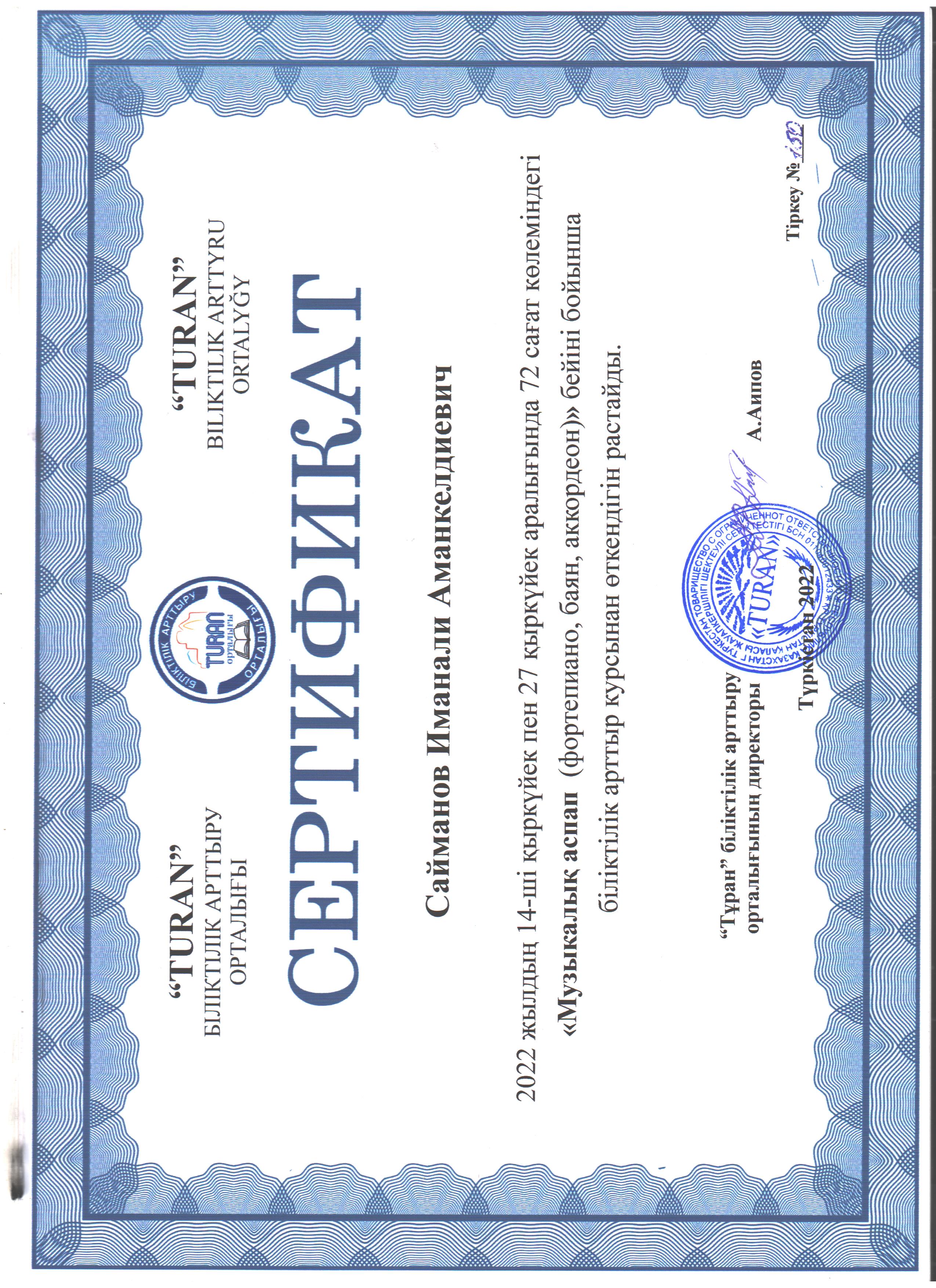 27.07.2019 | .Қ.Р.Мемлекеттік орталық музейі.Алматы,Шілде 2019ж.Сертификат №8-3-19, 72часов .«Елбасының болашаққа бағдар: Рухани жаңғыру» бағдарламасы аясында өткен Қ.Р. Тәуелсіздік күніне орай ЖОО оқытушылары арасындағы «Өнер бағыттары(Дәстүрлі музыка өнері,Театр өнері,Орындаушылық өнер,МузыкаМұғалімдерін даярлау) бойынша заманауи технологияларды тиімді пайдаланудың әдіс-тәсілдері»атты Республикалық байқауда өз біліктілігін.Музыкалық аспап(Домбыра)пәні бойынша. |