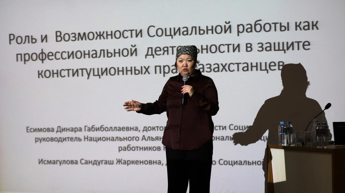 Келесі кезекте, Л.Н. Гумилев атындағы Еуразия ұлттық университеті Әлеуметтану кафедрасының доценті, Әлеуметтік жұмыстар бойынша PhD докторы, Кәсіби әлеуметтік қызметкерлер ұлттық альянсының атқарушы директоры Динара Есимова «Қазақстандықтардың конституциялық құқықтарын қорғаудағы кәсіби қызмет ретінде Әлеуметтік жұмыстың рөлі мен мүмкіндіктері» тақырыбы туралы ойын бөлісті.