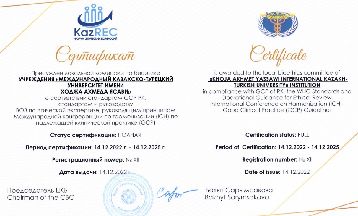 Комиссия была создана в 2022 году приказом ректора МКТУ и прошла официальную сертификацию в соответствии со стандартами надлежащей клинической практики (GCP) Республики Казахстан, а также международными этическими требованиями.