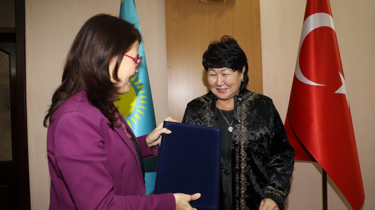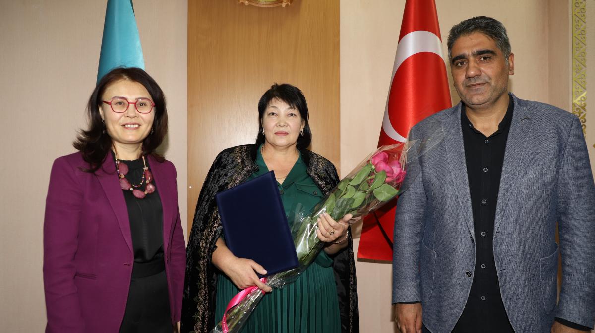 Кроме того, ректор поздравила доцента факультета естественных наук Алию Сарыбаеву с 60-летним юбилеем и старшего лаборанта инженерного факультета Алмагуль Кожахметкызы с 50-летием, вручив им памятные подарки.