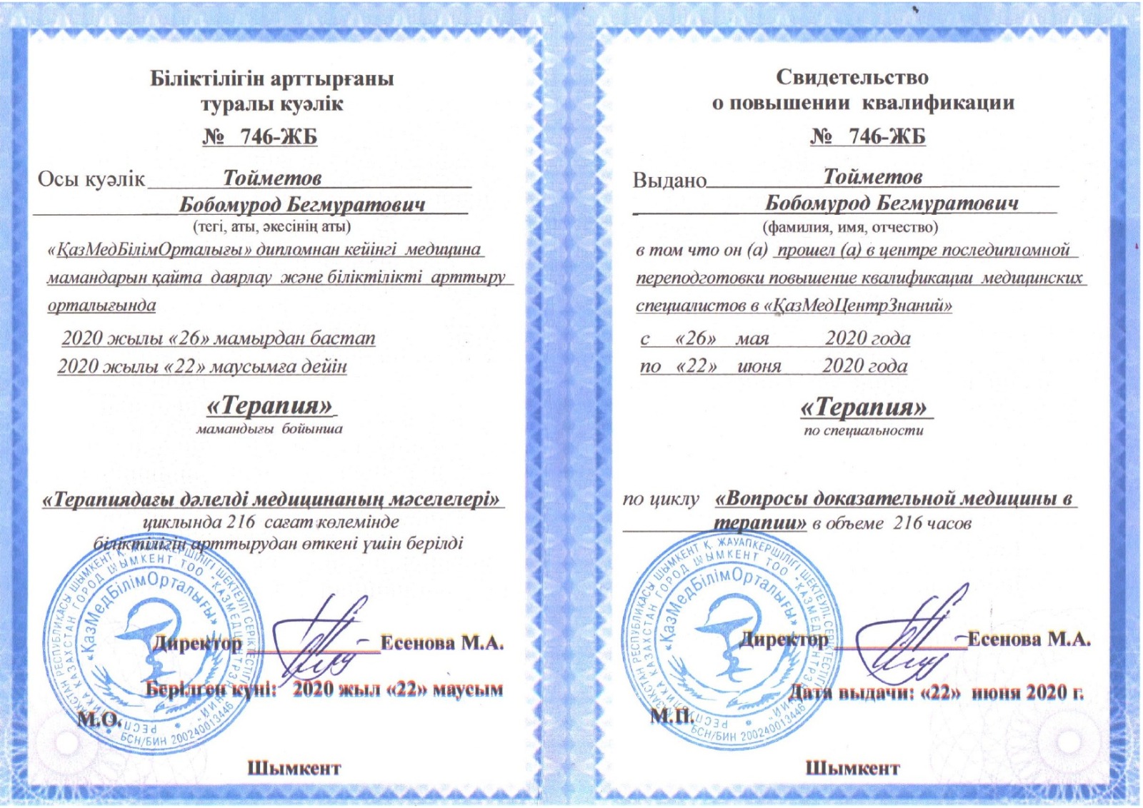 Тойметов Бобомурод Бегмуратович - 2001-2008г. Южно Казахстанская Государственная Медицинская Академия Специальность: Врач терапевт. 2008-2010 гг. Министерство Обороны РК, ГУ-Войсковая часть - врач бригады постоянной боевой готовности. 2011 год Преподаватель Медицинского колледжа «Сайрам». 2011 год Врач эксперт ГККП Сайрамской районной поликлиники «Сайрам» (Далее переименован) в ГККП Шымкентскую городскую поликлинику №12. С января 2017 года по октябрь-врач эксперт-совместно статист в ГККП «Областной детский реабилитационный центр». 2017-октябрь по май 2023г заместитель директора по УПР- в ТОО «Средне-Азиатский Высший медицинский колледж». 2020года февраль по август врач эксперт ГККП «Реабилитационный центр №1». С 2023года май месяця по 2024 год август-Врач эксперт- ГКП на ПХВ «ГП №12». Заместитель декана факультета ПДОВ в условиях МКТУ имени Х.А.Ясави (2 сентября 2024года).
