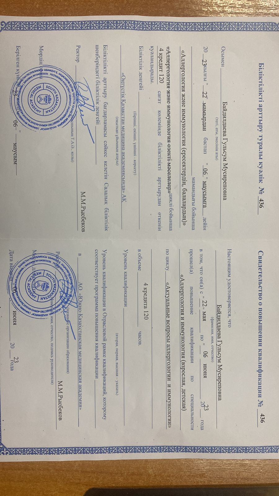 Автобиография.Я, Байдилдаева Гульсум Мусиреповна, родилась 25.03.1977 года в г.Кентау, Южно-Казахстанской области.В 1984 году пошла в СШ села Кыргызсай, Алматинской области, в 1994 году окончила ее с отличием.В 1994 году поступила в МКТУ г. Кентау ЮКО, в 1995 году ВУЗ перевели в г.Шымкент ЮКО.В 2000 году окончила МКТУ в г.Шымкент, поступила в интернатуру, в 2001 году окончила ее.В сентябре 2001 года началась моя трудовая биография. В сентябре 2001 года приступила на работу в Кентаускую станцию СМП врачом, в ноябре 2001 года перевелась в поликлинику клинику МКТУ г.Шымкент- участковым врачом.С 2002 года- прошла первичную специализацию по аллергологии, и стала работать там же врачом аллергологом отделения аллергологии-пульмонологии.В 2018 году прошла первичную специализацию по пульмонологии.С 2018 года по настоящее время заведую отделением аллергологии и пульмонологии Городской больницы № 2 г.Шымкент, являюсь главным внештатным специалистом ГУЗ.В настоящее время проживаю в г.Шымкент, мкр Нурсат 29/2- 1 корпус, квартира 79.В разводе, имею одну дочь, проживающую со мной.Ахмедова Жанель Гуламовна-18.07.2006 гр, студентка 1 курса Международного Университета Туризма и гостеприимства г.Туркестан.Не судима, состою в партии Аманат, мусульманка.