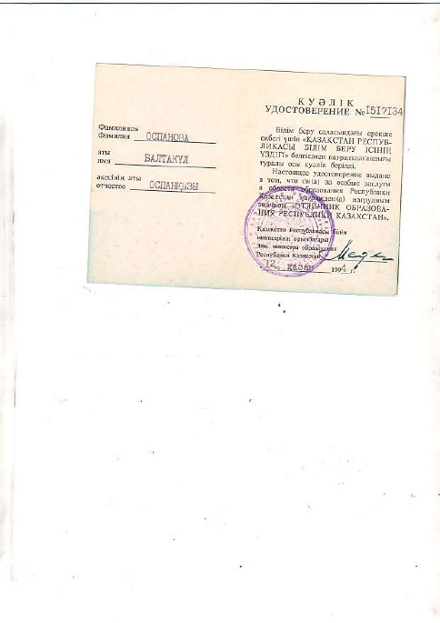 Қазақ,орыс тілдері бөлімінің доценті, ф.ғ.к. Оспанова Б.О.- «Оқу-ағарту ісінің үздігі»