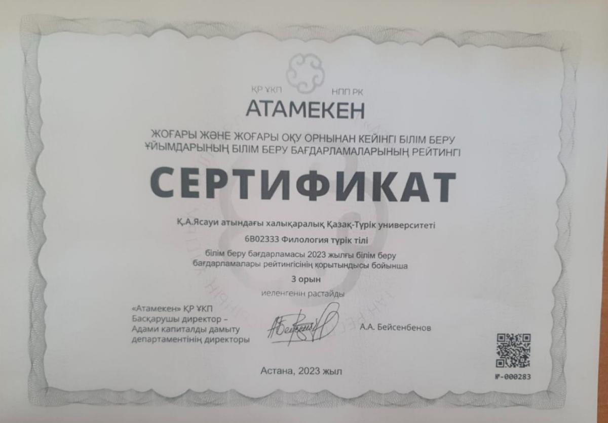 2023 жылғы Жоғары оқу орындарының білім беру бағдарламалары «Атамекен» ҰҚП рейтингінің қорытындысы бойынша унивеситеттен қатыстырылған 44 ББ арасында 6В02333-Шетел филологиясы : түрік тілі білім беру бағдарламасы 3,26 ұпаймен жүлделі 3 орынды иемденді. Түрік филологиясы түрік тілі білім беру бағдарламасының көрсеткіштері салыстырмалы түрде жақсы және өте жақсы ББ қатарына еніп отыр.