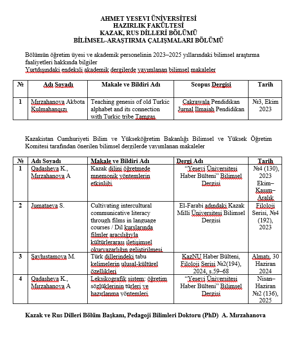 6 Akimtayeva Gaziza Abdilhamitkizi "Öğrenme ve araştırma faaliyetlerinde yapay zekaya dayalı dijital teknolojilerin uygulanmasına yönelik metodoloji" Türkistan, 4-8 Ekim 2024 Nazarbayev Üniversitesi, Ahyau'da ileri eğitim programı 72 saat Sertifika No. 2024/014