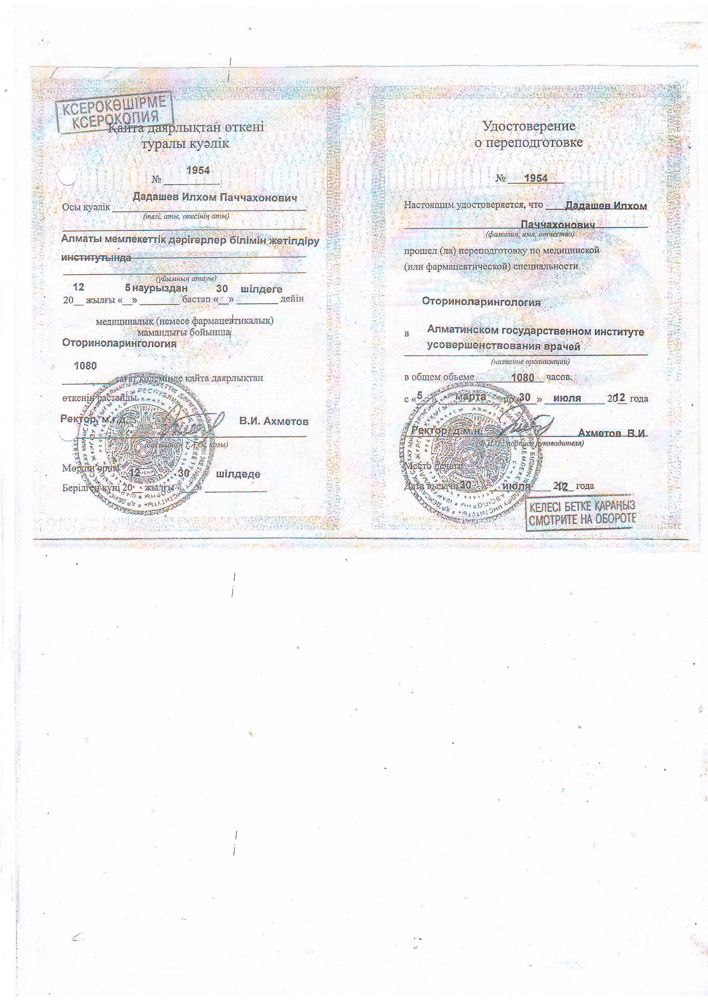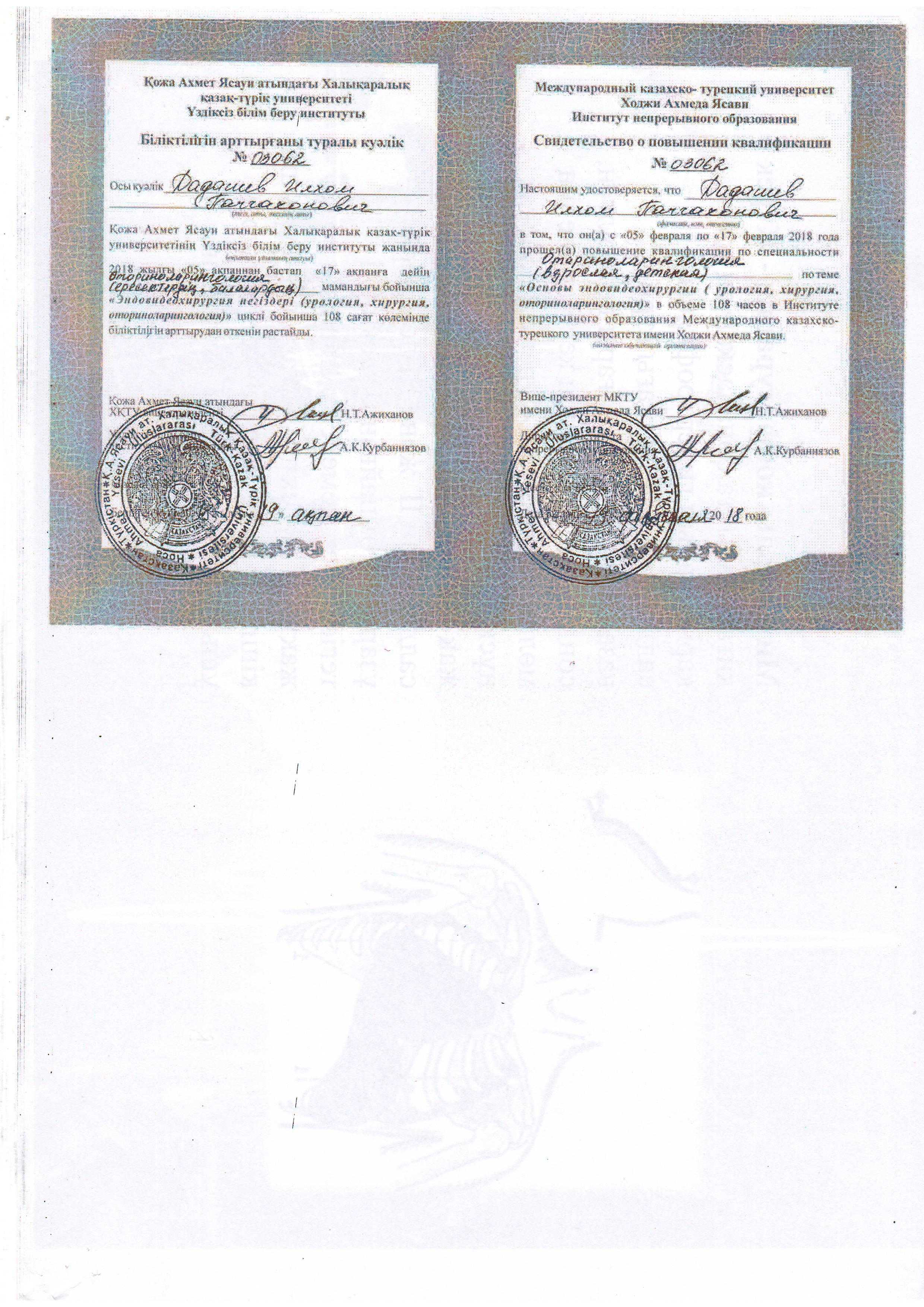 Резюме профессорско-преподавательского составаФ.И.О.:Дадашев Илхом ПаччахановичОбразование: высшийПериод: 2004-2010г.г.Период: Профессиональная квалификация - врач- оториноларингологОпыт работы:12 летАкадемический: 7 летРабота в данной организации 7 летПериод: медицинский факультет, преподватель, «Оториноларингология» по совместительствуПериод: Перечень преподаваемых дисциплин Хирургические болезни (модуль оториноларингология)Период: Занятость (полный / неполный рабочий день) неполныйПредыдущие места работы в организациях образования:2011-2015 гг Кентауская городская поликлиника. Врач хирург и оториноларинголог2012 году прошел специализация по оториноларингология АГИУВ г АлматыС 2015- по ностящее время работает врач оториноларингологом в Клинике МКТУ2016 – 2017 гг стажировка по теме «Хиургия ухо, горло и носа» Республика Турция г Анкара университет ГАЗИС 2015 г по ностящее время работает по совместительстве преподователем кафедре «Хирургический болезни»Период: Должность и место работы в организации кафедра «Хирургические болезни» преподователь кафедры по совместительствуПериод: Перечень преподаваемых дисциплин «Общая хирургия»Период: Занятость (полный / неполный рабочий день) неполныйНеакадемический: полныйПериод: Должность и место работы в организации: С 2015- по ностящее время работает врач оториноларингологом в Клинике МКТУПериод: Краткое описание положения. В настоящее время неакадемическая работа. Врач оториноларинголог КДЦ МКТУ им Х.А.Ясауи.Период: Занятость (полная / работа по совместительству) полнаяПовышение квалификации: Маман сертификаты "Оториноларингология" (сурдология, эндоскопия по профилю основной специальности) (взрослая, детская) №KZ95VBM01992163-17.03.2023-17.03.2028; І-ші санатты «Оториноларингология» (сурдология) (ересектердің, балалардың) №: KZ03VBM11272624-12.11.2020-11.11.2025 Период: Свидетельства/сертификаты о повышении профессиональной квалификации с указанием даты или профессиональная регистрация (по профилю образовательных программ и преподаваемых дисциплин). 1. Emergency Management and Organization-08.04.2019-13.04.2019-Қ.А.Ясауи атындағы ХҚТУ-№04872-54 сағат. Членство в профессиональных организациях: нет Период: нетНаграды и премии: Период: Деятельность в сфере услуг: медицинаПериод: (В пределах и за пределами учреждения) - нетПубликации и презентации:Период: (Наиболее важные, за последние пять лет, не более пяти публикации попрофилю образовательных программ и преподаваемых дисциплин) – название, соавторы (если имеются), место, дата издания/презентации. Новые научные разработки:Период: (Краткое перечисление новых профессиональных, опытно-конструкторских разработок, авторство или соавторство в научных илиопытно-конструкторских разработках). Свидетельство о государственной регистрации прав на объект авторского права «Комбинированная аутоаллопластика ахиллово сухожилия» №1093 13.04.2018г.Период: (Если есть дополнения, то можно указать те важные виды деятельности,которые не отмечены в списке резюме). Примечание: данные по повышению квалификации, научные публикации и разработки, следует представить за последние 5 лет.