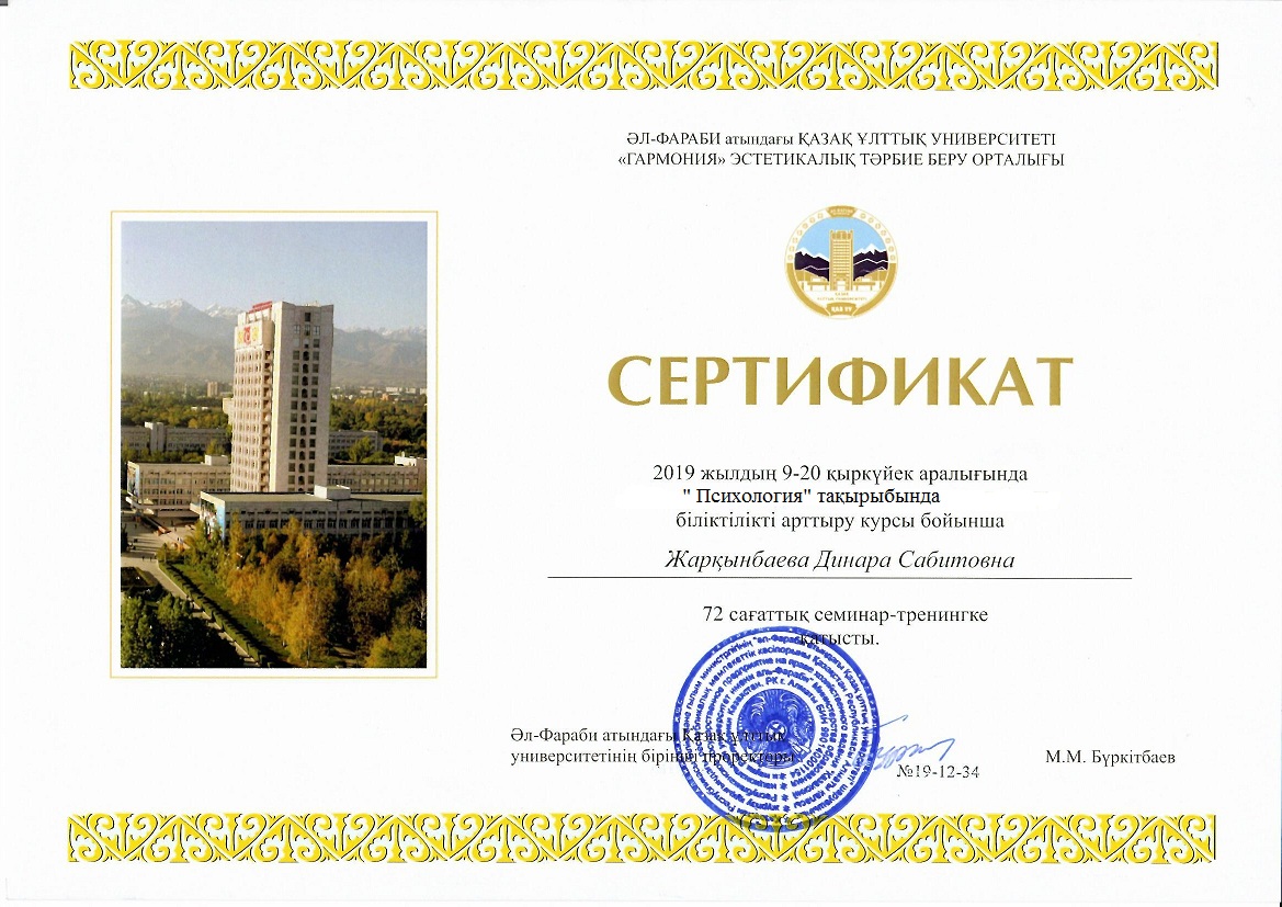 Өмірбаян Мен, Жаркинбаева Динара Сабитовна 01.01.1980 жылы Жамбыл облысы, Жамбыл ауданы, Айша бибі ауылында дүниеге келдім. Ана тілім-қазақ тілі. Орыс тіліңде еркін сөйлеймін. 1986 жылы қыркүйек айында Жамбыл ауданы, Айша бибі ауылындағы Айша бибі орта мектебінің 1- сыныбына қабылдандым. 1997 жылы аталған оқу орның 11 сыныбын бітірдім. 1997 жылдың қыркүйек айында Тараз педагогикалық институтына оқуға түстім. 2001 жылы М.Х. Дулати атыңдағы Тараз мемлекеттік университетің «Психология» мамандығы бойынша тәмамдадым. 2001 жылдан бастап 2004 жылға дейін Тараз қаласы, №45 қазақ классикалық гимназияда психолог, психология және логика пәндер бойынша мұғалім болып жұмыс істедім. 2004 жылдан бастап 2009 жылға дейін ТарМПИ, Педагогикалық факультеті, Психология кафедрасына оқытушы қызыметің атқардым. 2006-2009 жылдар аралығында Қырғыстан, Бишкек қаласы, И.Арабаев атындағы Бишкек мемлекеттік университеті, «Психология» мамандығы бойынша магистратура бітірдім. 2009 жылдың қазан айында тұрмыс құруыма байланысты Түркістан қаласына көшіп келдім. 2010 жылдың қыркүйек айынан бастап Қ.А.Ясауи атыңдағы Халықаралық қазақ-түрік университеті, «Жалпы психология» кафедрасына оқытушы қызметіне қабылдандым. 2017-2021 жж. аралылында Қ.А.Ясауи атыңдағы Халықаралық қазақ-түрік университеті, Кәсіби даму институтының жетекші маманы,психолог-практик қызметің атқардым.2021-2024жж. аралығында Қ.А.Ясауи атыңдағы Халықаралық қазақ-түрік университеті, Әлеуметтік-гуманитарлық ғылымдар факультеті деканыныңоқу ісі жөніндегі орынбасары,"Психология"кафедрасының оқытушысы қызметің атқардым.2024 ж. осы күнге дейін Қ.А.Ясауи атыңдағы Халықаралық қазақ-түрік университеті, Теология факультеті деканының оқу ісі жөніндегі орынбасары,"Философия"кафедрасының оқытушысы қызметің атқарамын. Отбасы жағдайым-тұрмыс құрғам. Бір қызым бар.Мен және менің жақын туыстарым сотты болмаған.Тұрғылықты мекен-жайым: Түркістан қаласы, Сырғақ батыр көшесі 11/1. Ұ.т.87716960430