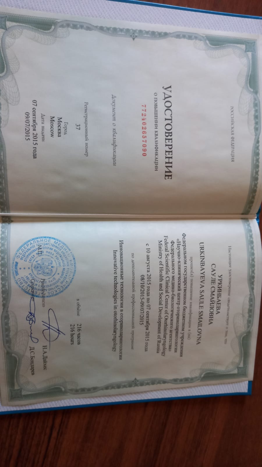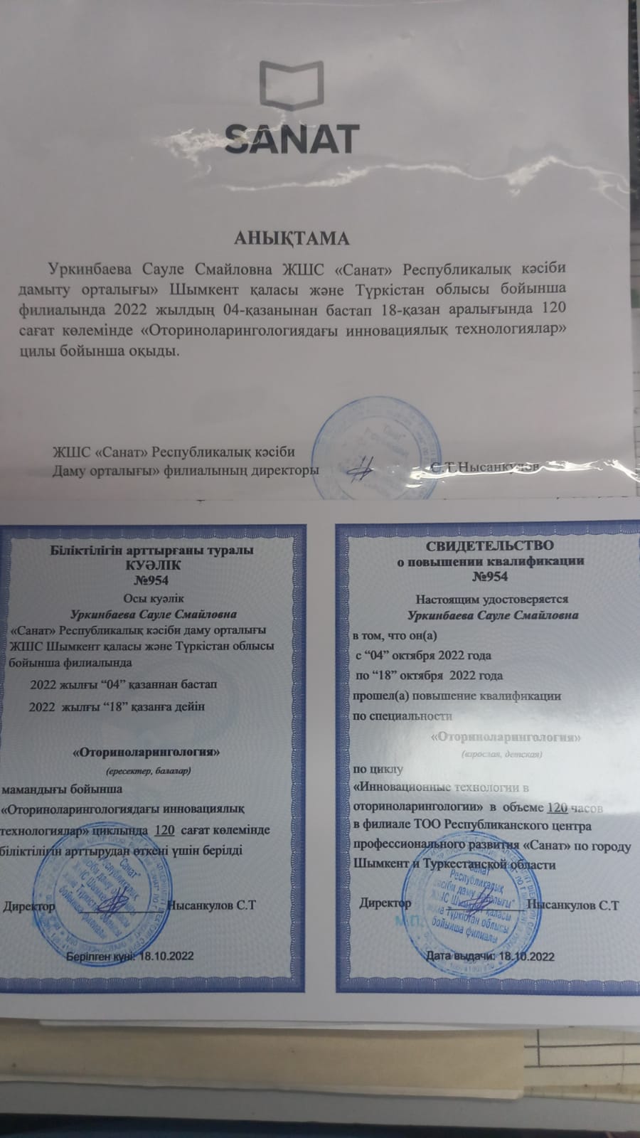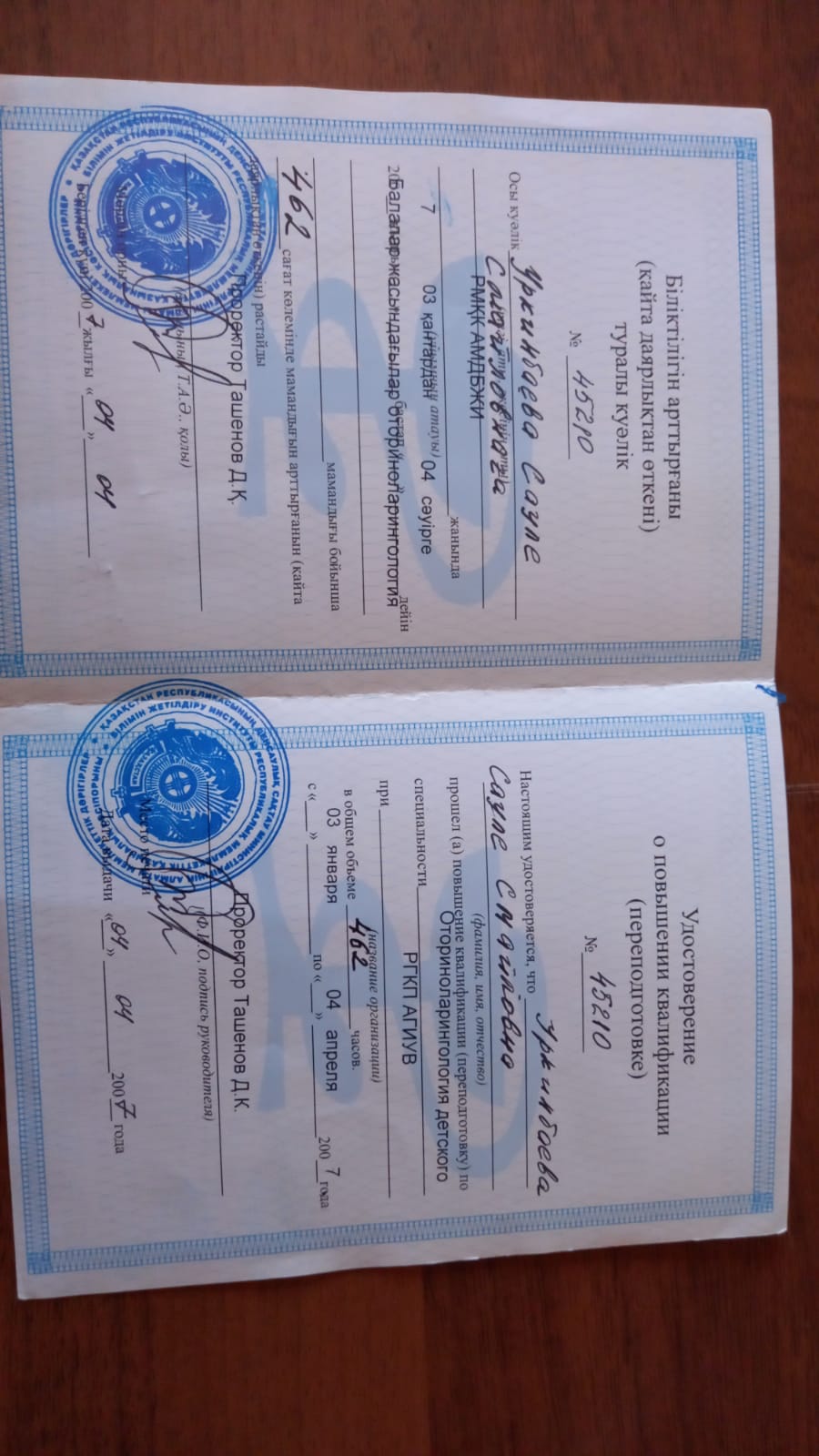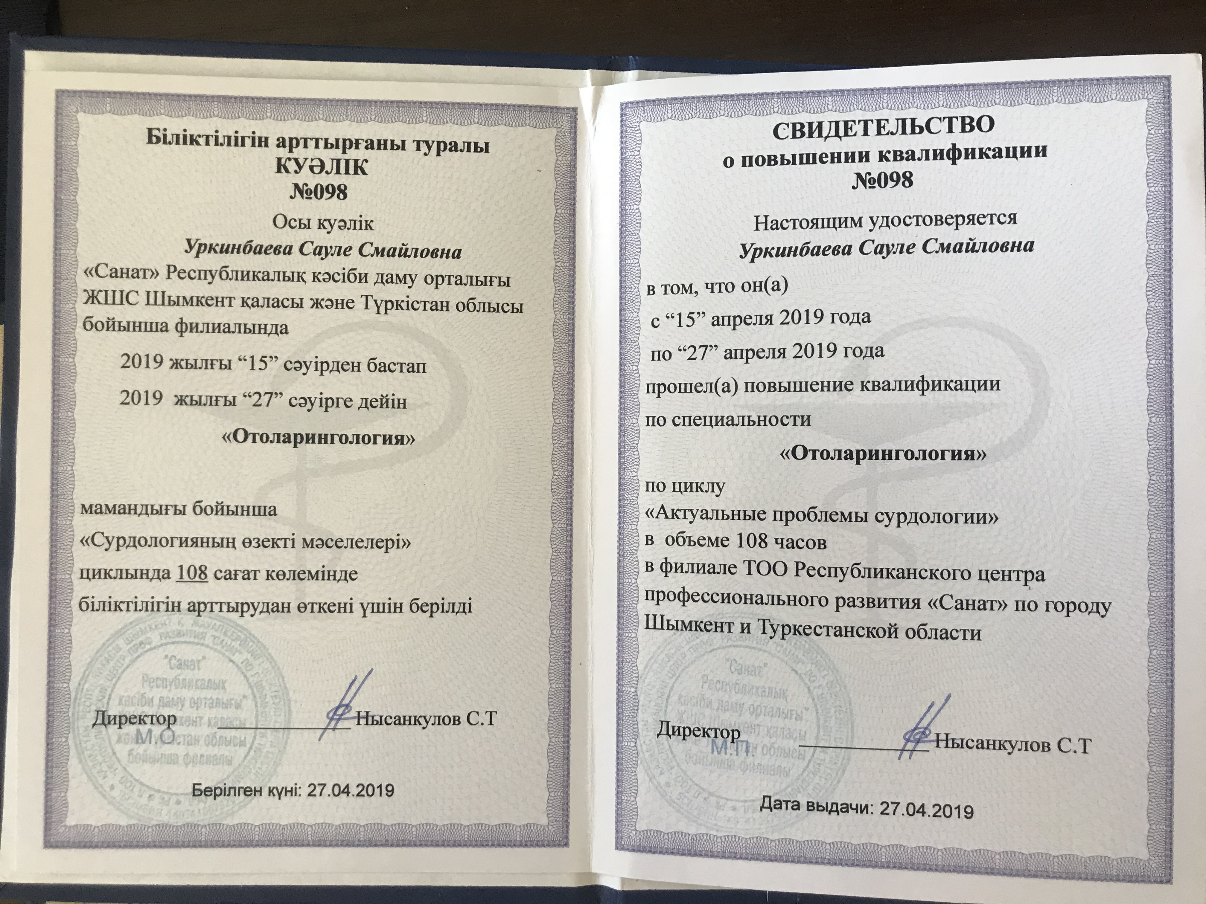 Уркинбаева Сауле Смаиловна Лауазымы: «Хирургиялық аурулар» кафедарысының оқытушысы, дәрігер-оториноларинголог.Ғылыми дәрежесі: жоқ ОҚЫТУ КУРСЫ:ЕҢБЕК ЖОЛЫ: Оториноларингология негіздері 1993-1997жылы «Кентау қалалық перзентханасында дәрігер-неонатолог қызметін атқарды.1998-2000жылы «Тараз қалалық» емханасында дәрігер- педиатр қызметін атқарды.2021 жылы ХҚТУ «Хирургиялық аурулар» кафедарсына «Оториноларингология» пәні оқытушысы қызметіне қабылданып, қызметін атқаруда.2000-2022 қазігі уақытта Түркістан қалалық емханасында дәрігер- оториноларинголог қызметін атқаруда. БАЙЛАНЫС АҚПАРАТЫ: Қожа Ахмет Ясауи атындағы Халықаралық қазақ-түрік университетіМедицина факультеті«Хирургиялық аурулар» кафедрасы 2-ші корпус, кафедра-207 Түркістан обл. Түркістан қаласы. Б.Саттарханов көшесі 29Тел.: 8 (725 33) 3-36-36 / 404e-mail. saule.urkinbaeva@ayu.edu.kzЖЕТКЕН ЖЕТІСТІКТЕРІ:1987-1993ж.ж. Семей мемлекеттік медицина институты « Педиатрия » мамандығы дипломы берілді. 1998 ж.ж. АГИУВ университеті, ИК №0013987 «Врач общей практики» және ЖБ № 0255562 «Дәрігер-терапевт» біліктілігі берілді. 2004 Алматы қаласы АГИУВ базасында первичная специализация өткені тұралы №1164 құжат берілді.2005ж. «Оториноларингология» « Балалалар жоғарғы тыныс жолдары ауруларының ерекшеліктері» циклы бойынша, біліктілігін арттырғаны туралы №256құжат берілді.22.02.2019ж. «ЯМИК-терапия – синуситтің оптимальды емдеу әдісі» атты курсты аяқтауына байланысты ООО «Яртек Мкдикал» Котомин В.В. ұйымынан сертификат берілді.2019ж Алабама университетінің хюнцвильколледжі денсаулық сақтау Саласында Білімін Жетілдіру сертификаты Ересектер,балалар және нәрестелердің жүрек-өкпе реанимациясы тренингі бойынша берілді20-24мамыр.2019ж. «Ересектерді өлімнен құтқарудың жетілдірілген тәсілдері тренингі сертификаты» циклі бойынша, құжаты берілді.21-29 қараша 2021Этика- деонтология.Қақтығыстарды басқару негіздері,эмоцианалды күйзелістің алдын алу біліктілігін арттыру куәлігі 2245 берілді.15.05.2019ж. № KZ19VBM00892581 «Оториноларинголог /сурдология/» мамандығы бойынша маман сертификаты берілді СЕРТИФИКАТ №228. ЖАРИЯЛАНЫМДАРСоңғы академиялық басылымдар: