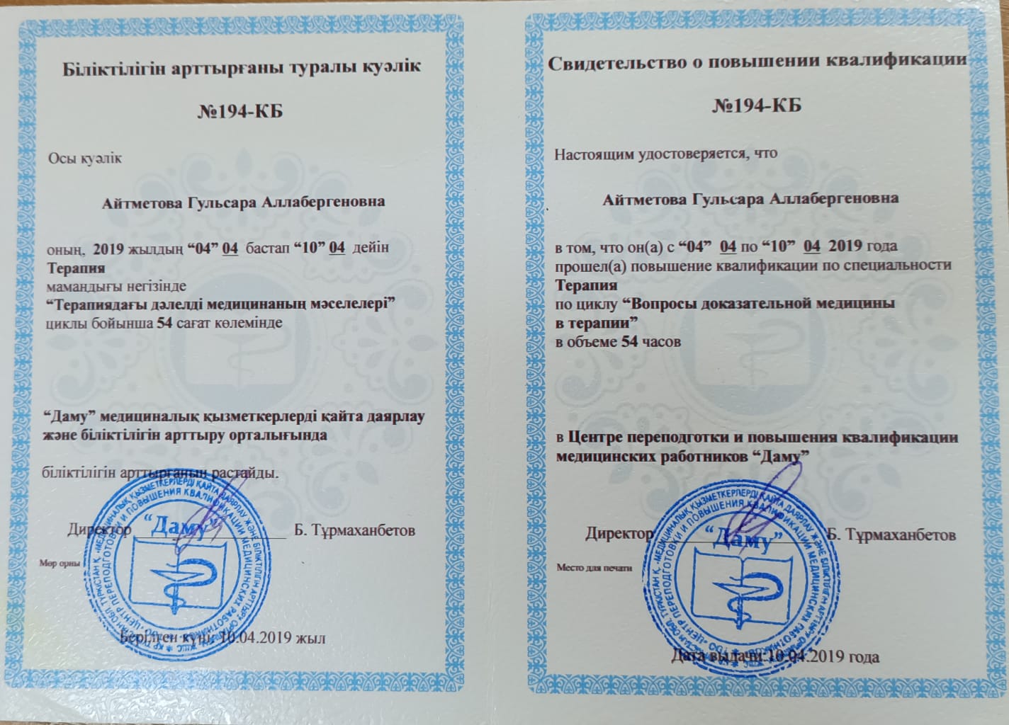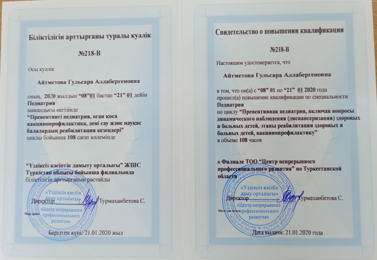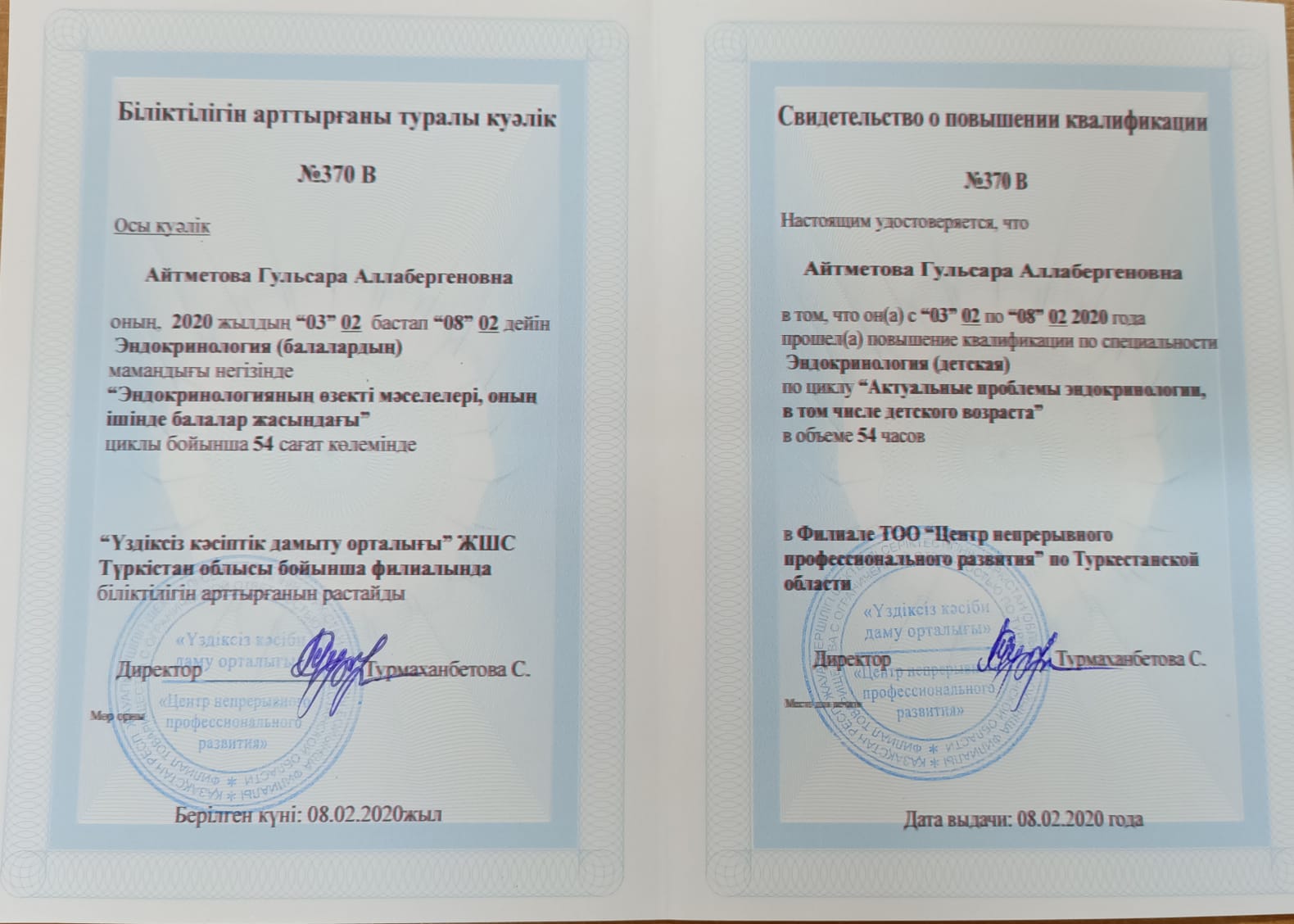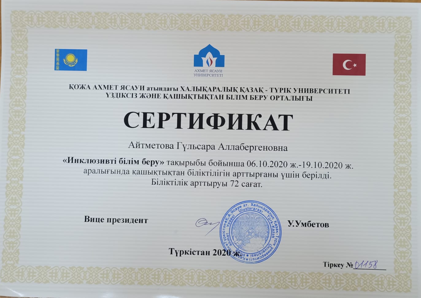 Я, Айтметова Гульсара Аллабергенкина, родилась 28 августа 1966 года в Кокане, Узбекистан. В 1983 году я окончил среднюю школу №4 города Туркестана. В июле того же года я поступила на сестринское отделение Туркестанского медицинского училища и окончила его в июне 1985 года. В октябре того же года я поступила на работу в указанное училище лаборантом кафедры фармакологии. В июле 1993 года я окончила этот институт по специальности «Педиатрия». В августе-декабре того же года прошла интернатуру в Туркестанской городской больнице.С 1 января 1994 года работала в детской филиальной поликлинике Туркестанской городской больницы 1 месяц и 0,5 месяца. Начала работать врачом в детской больнице, проработала в этой больнице до июня 1997 года. В 2009 году по причине моей специализации по специальности эндокринолог, в этой клинике 0,5 м.п. До марта 2012 года работала врачом-эндокринологом. С 12 января 2012 года и по сей день работаю преподавателем кафедры «Пропедевтика и внутренняя медицина» Международного Казахско-Турецкого университета. Несколько раз получал благодарственные письма и награды. Мое семейное положение: мой муж Рахматуллаев Али, 1961 года рождения, казах по национальности, не работает. У меня два сына. 1983-1985 Туркестанское медицинское училище, специальность медсестра.1985-1987 Туркестанское медицинское училище, лаборант. 1987-1993 гг., Ташкентский медицинский педиатрический институт, врач-педиатр.1994-2012 Туркестанская городская детская больница, областной врач-эндокринолог.С января 2012 года и по сей день является преподавателем кафедры пропедевтики и внутренних болезней медицинского факультета Международного казахско-турецкого университета имени К.А.Яссауи.