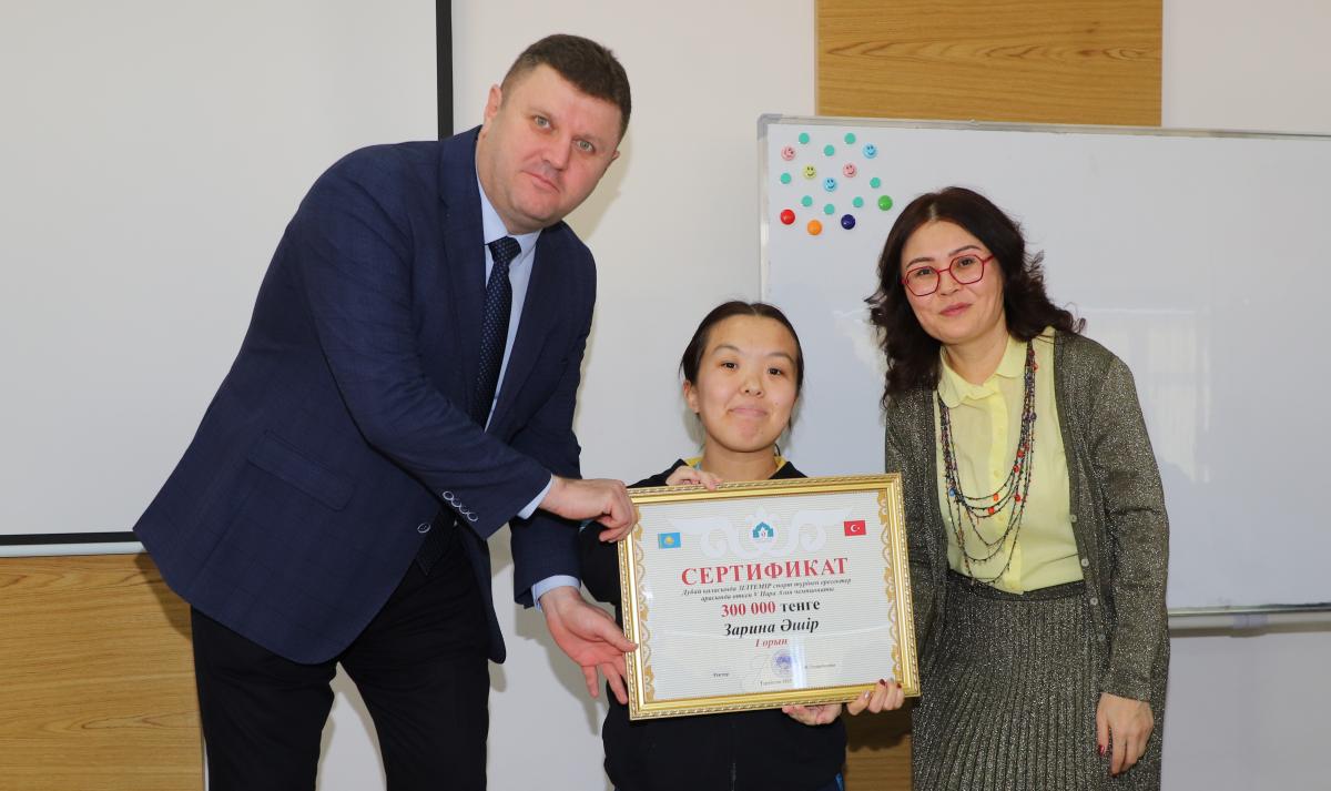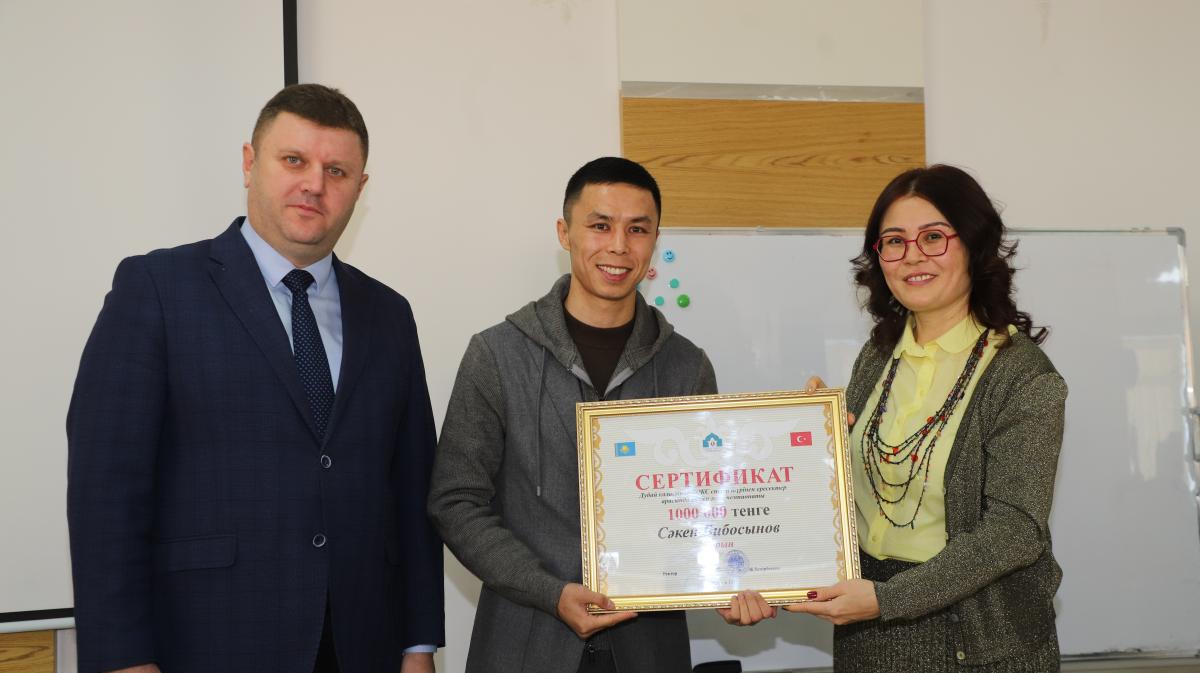 Ректор Жанар Темірбекова Қазақстанның туын желбіретіп, әнұранымызды асқақтатқан студенттерімізге университет атынан ақшалай сыйақы мен арнайы сыйлықтар табыстады.