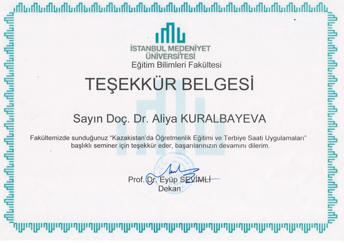 Ыстанбұл Мәдениет университетінің Педагогика факультетінің оқытушы профессор құрамына Білім беру және гуманитарлық зерттеулер факультетінің деканы, Педагогика және психология кафедрасының доценті, PhD Алия Куралбаева және Мектепке дейінгі және бастауышта білім беру кафедрасының доценті, PhD Гүлхиз Пилтен «Мектеп жасына дейінгі балалардың дамуын бақылау және скрининг бойынша Қазақстан стандарты» және «Қазақстандағы мұғалімдердің білімі мен біліктілігін арттыру сағаттары практикасы» тақырыптарында семинар өткізді.
