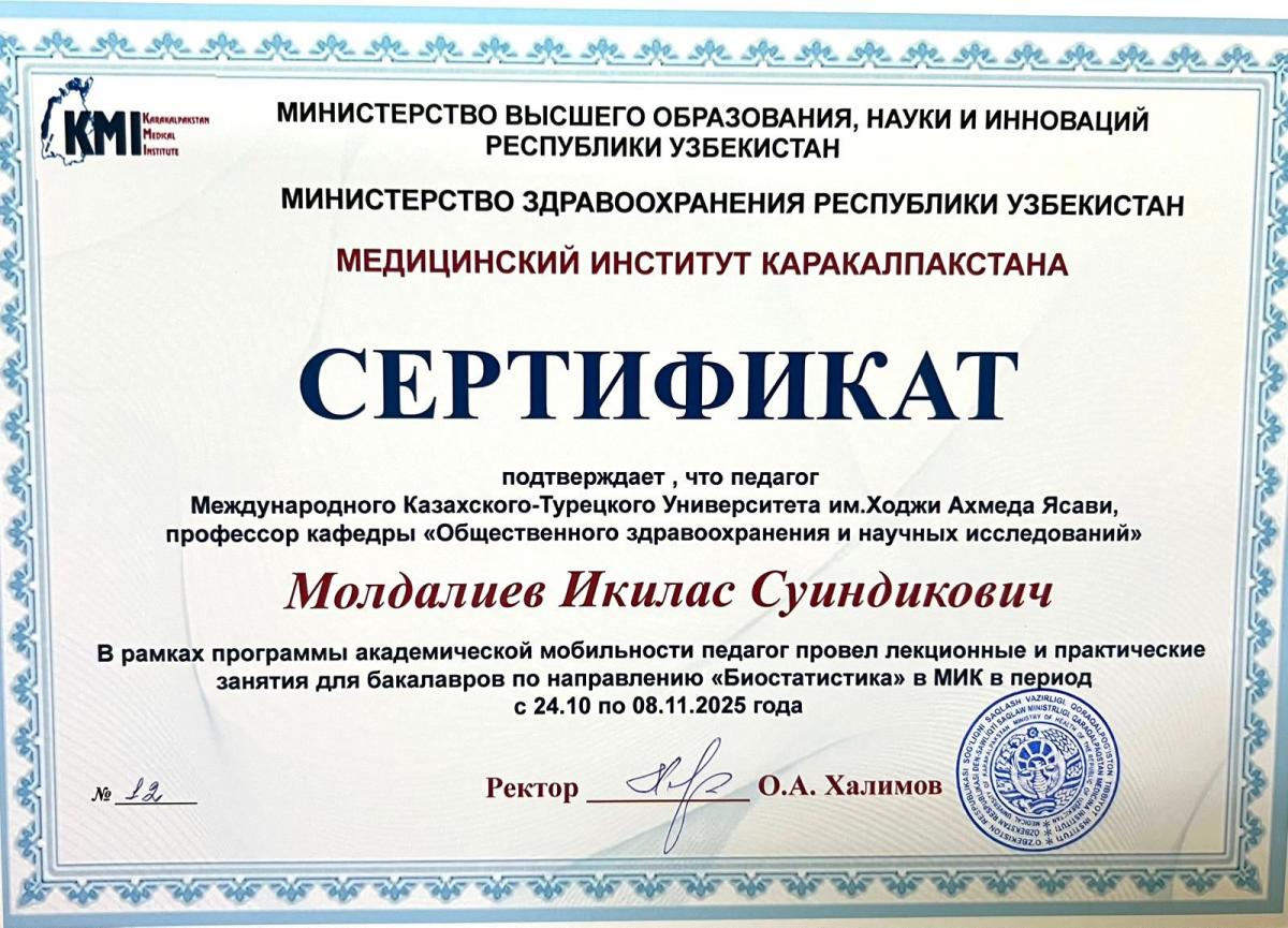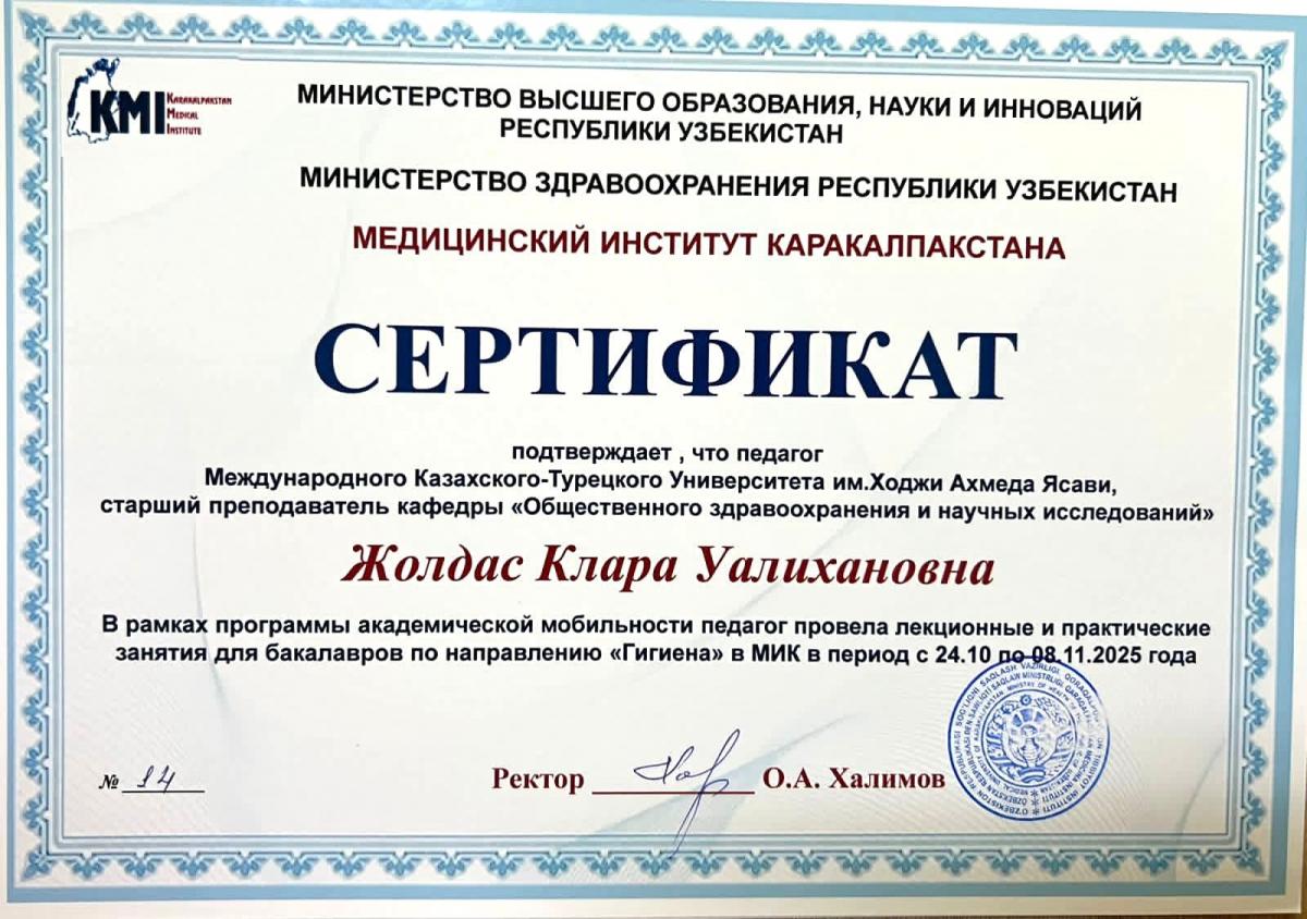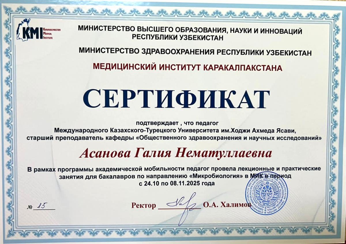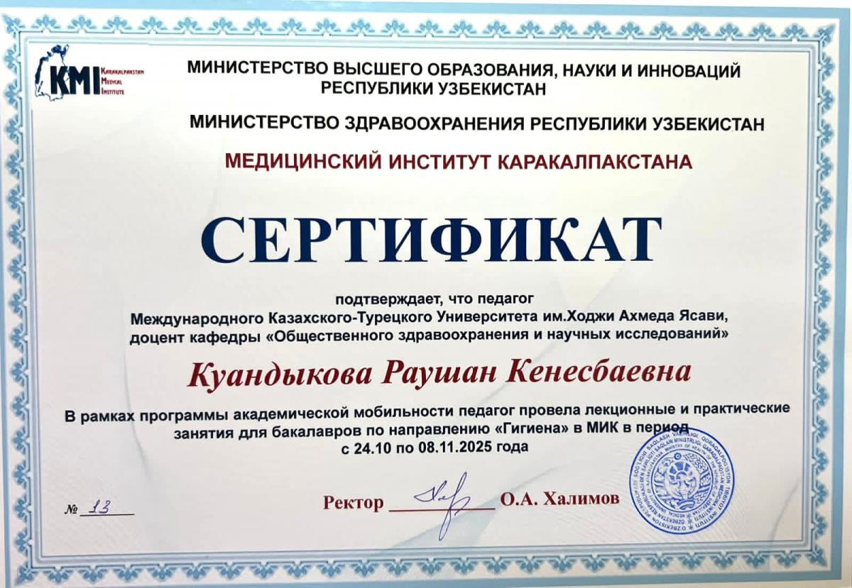 Қ.А.Ясауи атындағы Халықаралық қазақ-түрік университеті. Медицина факультеті. Қоғамдық денсаулық сақтау және ғылыми зерттеулер кафедрасының оқытушы профессор құрамы Қарақалпақстан медициналық институтында академиялық ұтқырлық бағдарламасы аясында 2025 жылғы 24 қазан мен 8 қараша аралығында бакалавр білім алушыларына дәрістік және практикалық сабақтар өткізді.
