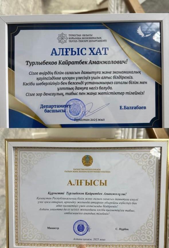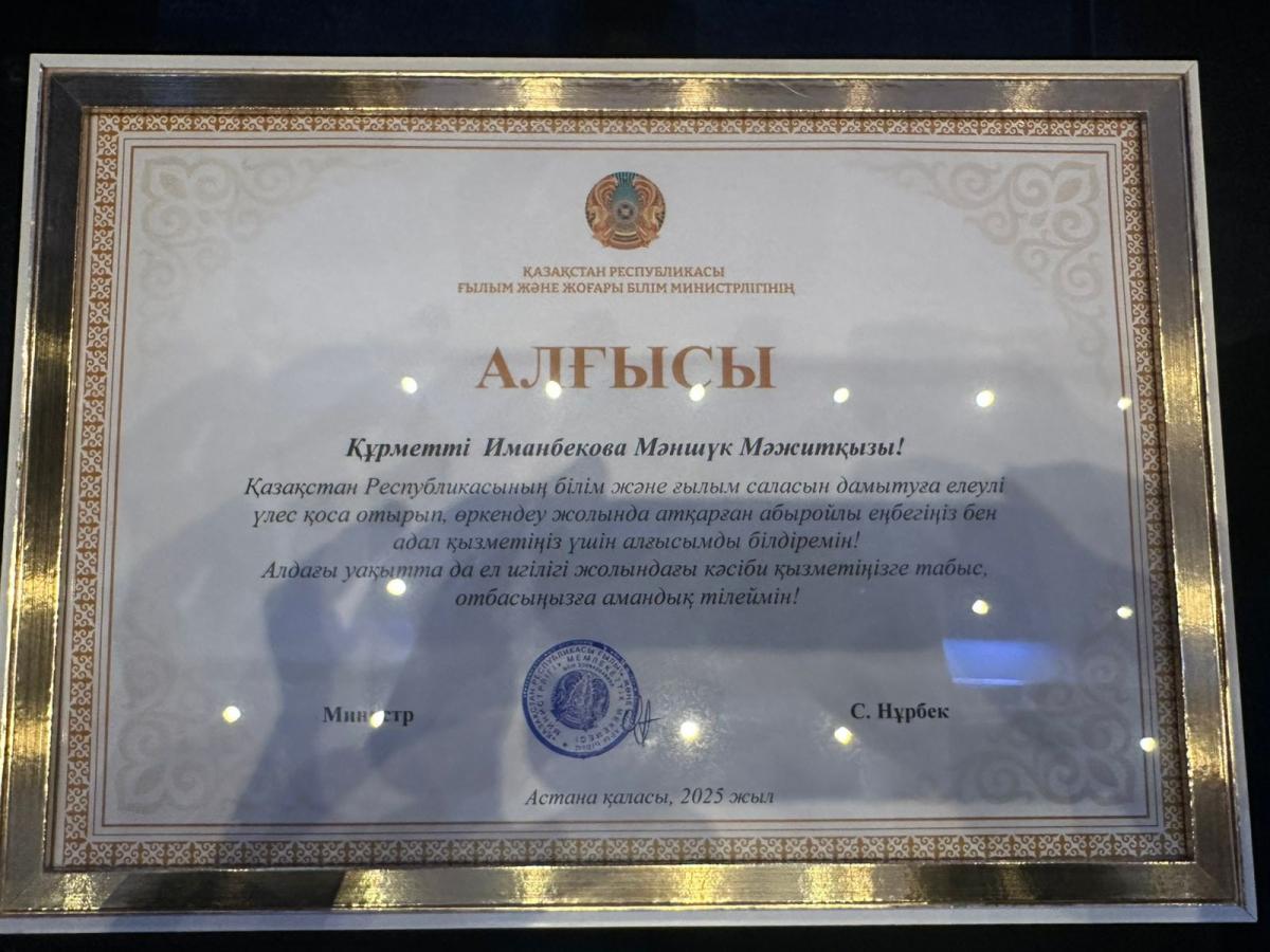 Қазақстан Республикасының білім және ғылым саласын дамытуға елеулі үлес қоса отырып, өркендеу жолында атқарған абыройлы еңбегіңіз бен адал қызметіңіз үшін алғысымды білдіремін!
