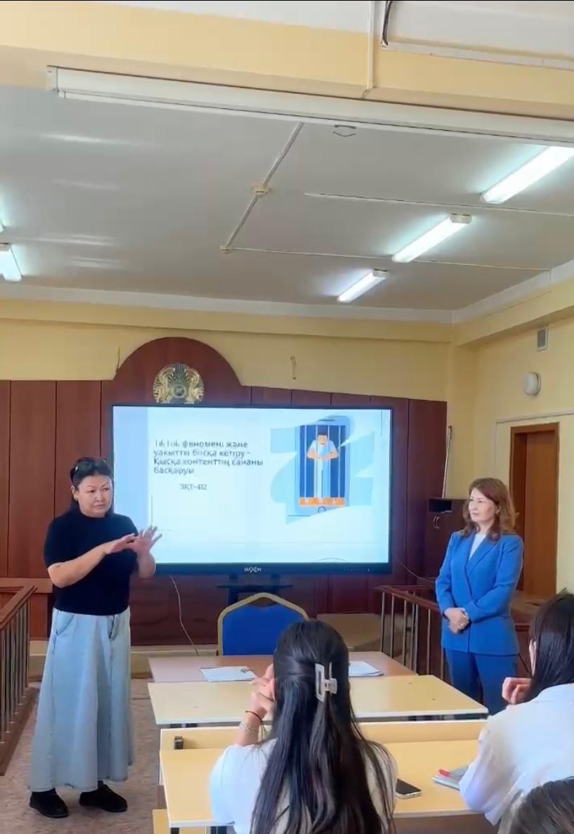 Гүлшат Нұрлыбекқызы студенттермен өз өмір жолын, адвокаттық кызметтің, коғамдағы орнын және кәсібіндегі жауапкершілікті терең, толғай отырып, жастарға адал еңбек пен уздіксіз дамудың маңызын айрықша атап өтті.