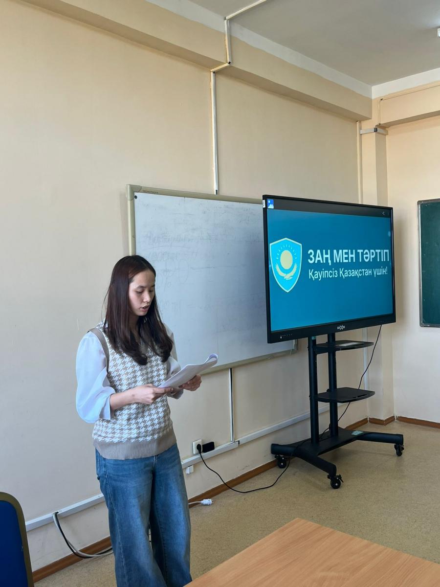 Қазақстан Республикасының ішкі саясатының негізгі қағидаттарын, құндылықтары мен бағыттарын бекіту туралы ҚР Президентінің 05 қараша 2025 Жарлығыны орындау мақсатындағы іс шара жүргізу жоспарына сәйкес, 13.11.2025ж. күні, Бас ғимарат 524 дәрісханасында, сағат 12.30-13.20 аралығында “Қылмыстық құқық” кафедрасының аға тәлімгері, заң ғылымдарының магистрі, аға оқытушы Баймахан Нұртас Саттарұлының ұйымдастыруымен “Заң және тәртіп қағидаты” атты тақырыбында іс-шара өтті. Іс-шара барысында ЗХҚ-511 тобының студенті Жұматхан Нұрзада “«Заң мен тәртіп» қағидатының қазіргі құқықтық саясаттағы рөлі, жүзеге асу тетіктері мен өзекті мәселелері” атты тақырыбында баяндама оқыды.