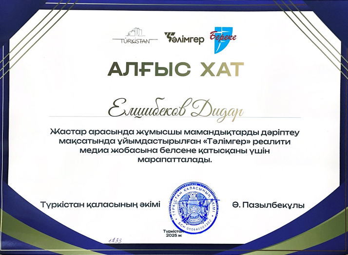 Экономика және басқару факультетінің “Мемлекеттік және жергілікті басқару” мамандығының 3-курс студенті Елшибеков Дидар Сәкенұлы Түркістан қаласының әкімі Ә.Пазылбекұлының алғыс хатымен марапатталды