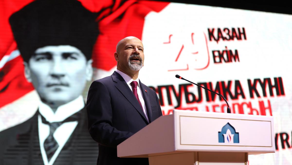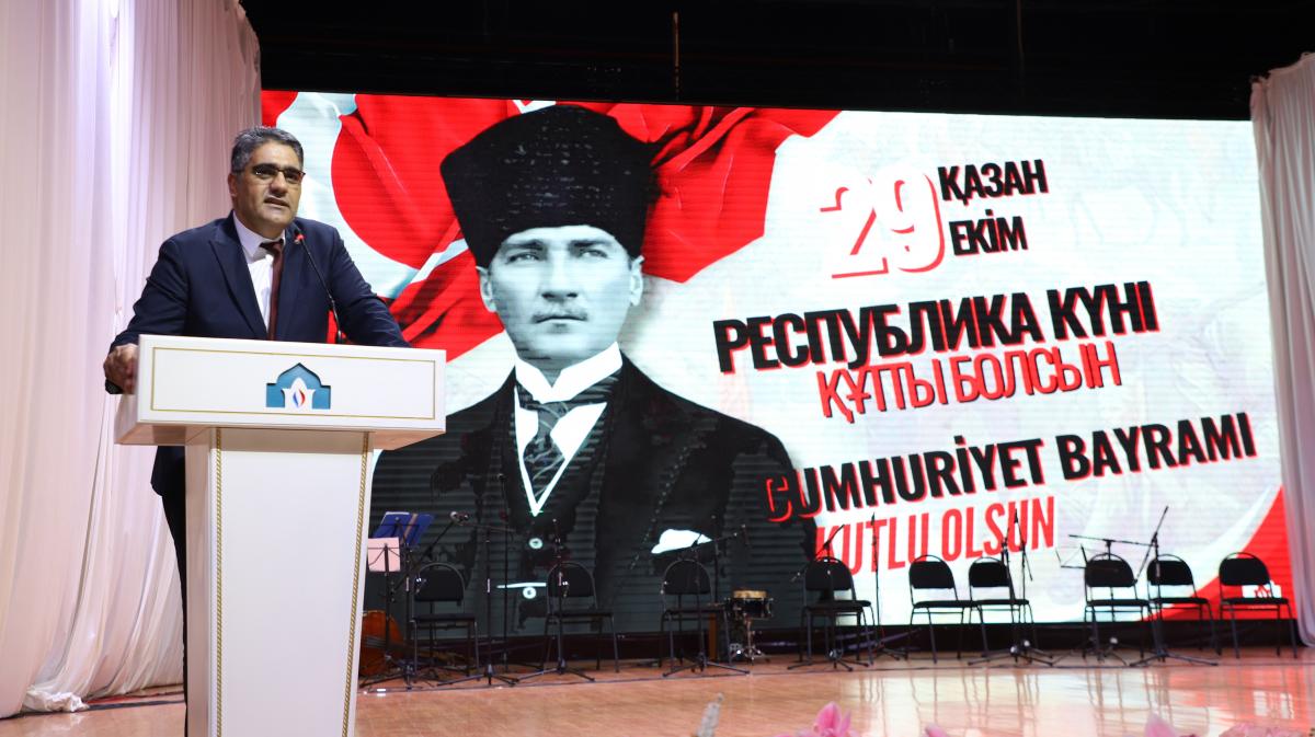 “Kıymetli misafirler ve sevgili öğrenciler! Cumhuriyetimizin 102. yıl dönümünü ata yurdumuz Türkistan’da, üniversitemizde birlikte kutlamak bizim için büyük bir mutluluk. Bu vesileyle tüm Türk dünyasının Cumhuriyet Bayramı’nı kutluyorum. Cumhuriyeti kuran Gazi Mustafa Kemal Atatürk ve silah arkadaşlarının aziz hatıraları önünde saygıyla eğiliyoruz. Devletimiz daim, bağımsızlığımız ebedî olsun.”
