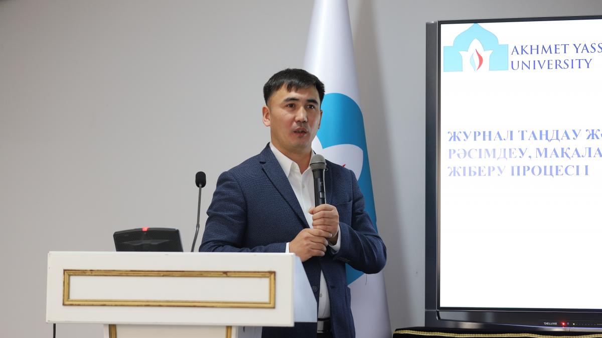 After that, Alibek Ydyrys, Professor and Researcher at the Botanical Garden Research Institute, delivered a presentation on “Journal Selection and Manuscript Preparation, and the Process of Submitting an Article to a Journal.” He explained the key principles of the scientific publishing process, highlighted the importance of scientific publications in shaping a researcher’s academic reputation, and provided detailed information on the quartile system of journals indexed in international databases (Scopus, Web of Science), the concept of Impact Factor, and the specifics of journal quality assessment.