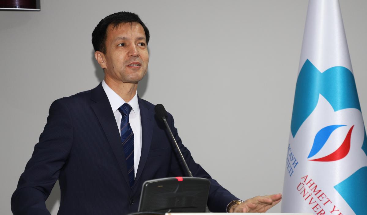 The Vice-Rector also conveyed congratulatory messages from University Rector Zhanar Temirbekova and Rector’s Representative Naci Genc. In accordance with Kazakh tradition, Professor Turmetov was honored with a ceremonial shapan and presented with gifts.