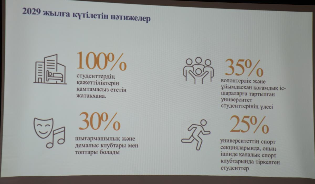 Спикер академиялық үстемдікке қол жеткізу тек білім сапасымен шектелмей, студенттердің көшбасшылық қабілетін, шығармашылығын, денсаулығын және қоғамдық белсенділігін дамыту арқылы жүзеге асатынын жеткізді. Университетте шығармашылық клубтар санын арттыру, спорт секцияларына қатысатын студенттер үлесін көбейту, еріктілер қозғалысын дамыту сынды өзге де тың жоспарлар ұсынды.