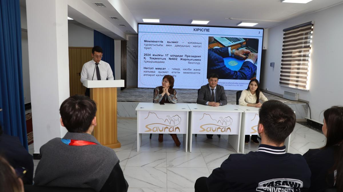 Сауран аудандық әкімдігі аппаратының басшысы Бекзат Абубакиров те студенттермен кездесіп, қазіргі таңдағы мемлекеттік қызметтің ерекшеліктері туралы кеңінен ақпарат берді.