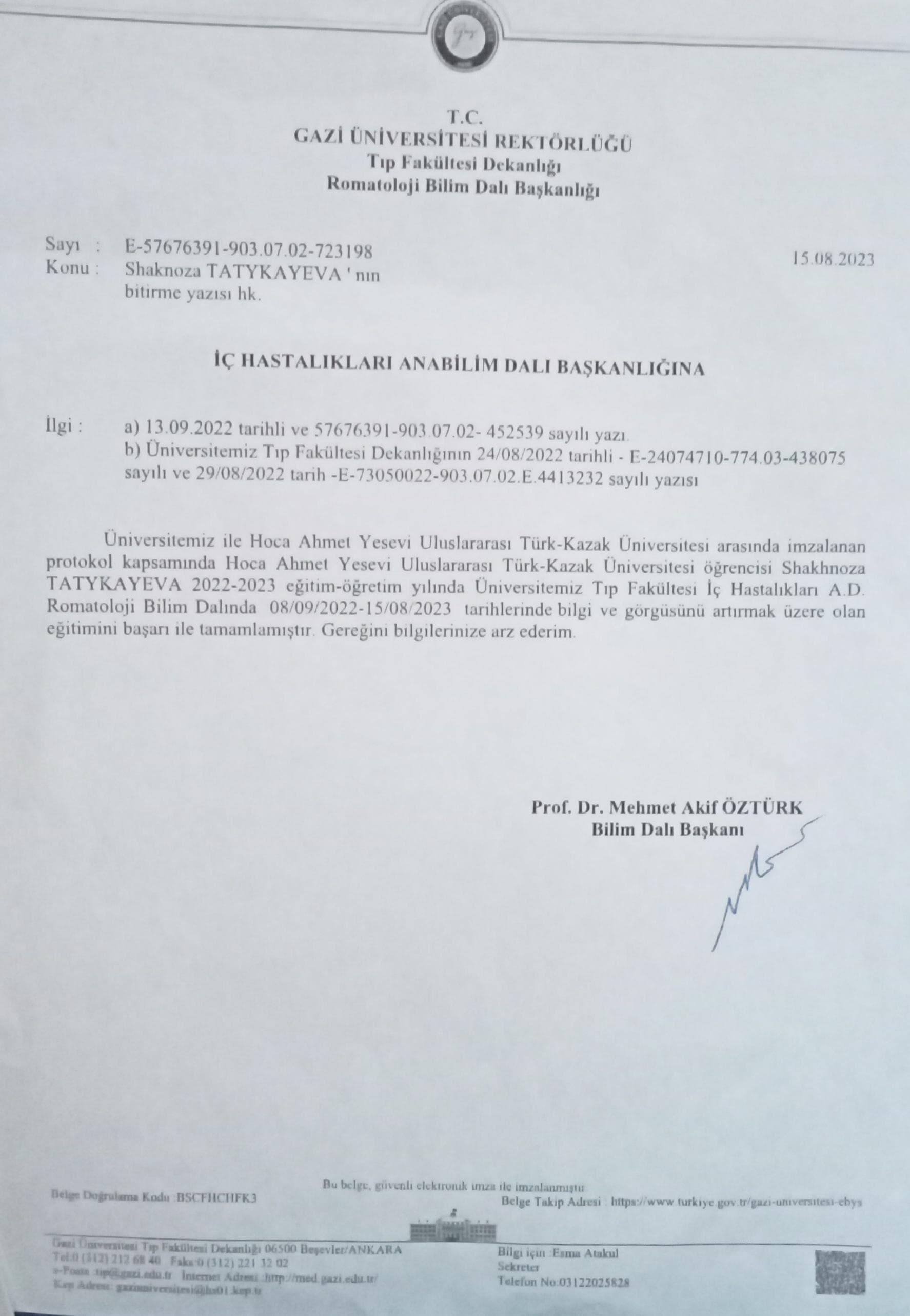 Ф.И.О.: ТАТЫКАЕВА ШАХНОЗА БУРХАНОВНАОбразование:2004-2010:«Лечебное дело».МКТУ имени Х.А.Ясави 2016-2018: «Магистр экономики и бизнеса».МКТУ имени Х.А.Ясави 2011:2019-2020: 2022-2023: Врач-терапевтВрач-кардиологВрач-ревматологОпыт работы:Академический:Работа в данной организации 2012-2023:магистр-преподаватель медицинского факультета МКТУ имени Х.А.Ясави2012-2023:преподавание дисциплин иммунология,проблемно-ориентиванное обучение,основы скорой помощи,основы скорой неотложной медицинской помощи2012-2023:полный рабочий деньНеакадемический:2011-2012:Врач-терапевт.Узунагачская районная поликлиника Алматинская область 2011-2012:полный рабочий деньНеакадемический:2023:Врач-кардиолог, врач-ревматолог.Поликлиника Акзере г.Кентау2023:Неполный рабочий деньПовышение квалификации:18.09- «Кардиология». В филиале профессианального 31.12.2019 гг: развития «Санат»по городу Шымкент и Туркестанской области; 20.07-01.08.2020 гг:08.09.2022-15.08.2023 гг:«Скорая и неотложная медицинская помощь». Центр подготовки медицинского персонала г.Туркестан;«Ревматология». Университет Гази, Турция.