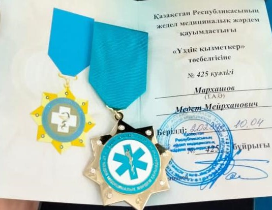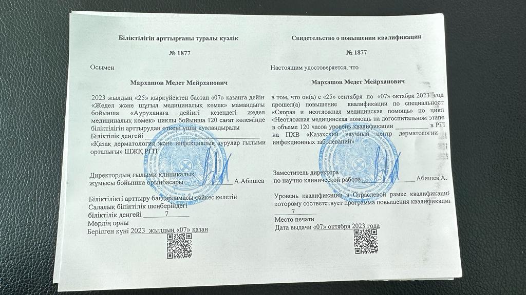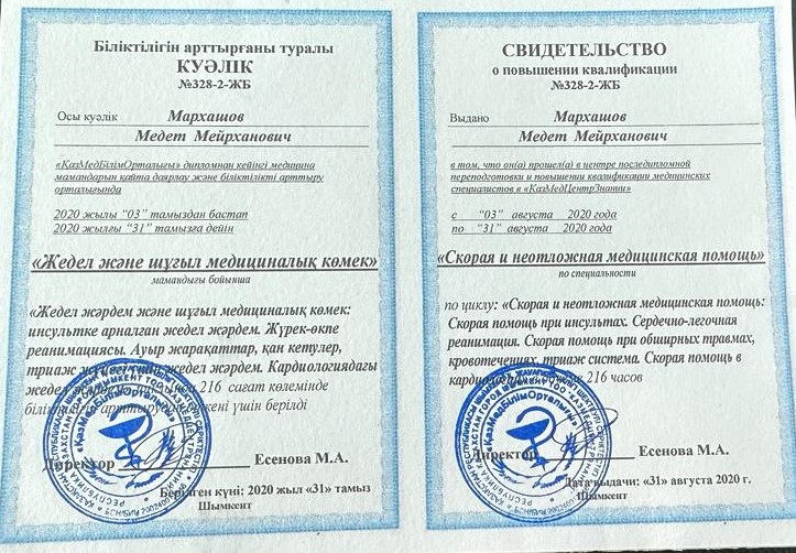 Мархашов Медет МейрхановичДата рождения04.11.1983НациональностьКазахМесто рожденияКазахстан, г.ТуркестанАдресГ.Туркестан, ул. Базар Жырау №52 ОбразованиеВысшее 2000-2003гг. – Туркестанский медицинсий колледж по специальности «Фельдшер»2004-2009гг.- МКТУ по специальности «Лечебное дело»2009-2010гг – МКТУ Интернатура по специальности «Терапии»2010г – Переподготовка скорой медицинской помощии2015г – Переподготовка общественное здравоохранение2019г – Переподготовка кордиология2019 – 2020гг Казахском медицинском университете непрерывного образования обучался в магистратуре «Общественное здравоохранение» Дополнительная информацияЗнание языков: казахский-родной, русский – свободноЗнание ПК: MS Office, Word, Excel, Power Point.Internet и E- mailПовышения квалификации: скорая и неотложная медицинская помощь; Терапиий; Независимая экспертиза; Сердечно-легочная реанимация; курсы повышения акушерство и гинекология; Опыт работы: с 2009- Преподователь ТМК г.Туркестан (совместитель)с 2010 по 2012 врач скорой медицинской помощи г.Туркестан с 2012 по 2018 врач скорой медицинской помощи г.Туркестан (совместитель)с 2011 по 2014 врач терапевт в клинике «Талғат» г.Туркестан (совместитель)с 2012 по 2016 врач эксперт скорой медицинской помощи г.Туркестанс 2016 по 2018 заведующий под.станции скорой медицинской помощи г.Туркестанс 2018 по 2018 заведующий отделений скорой медицинской помощи г.Туркестанс 2018 по 2020 главный врач Туркестанской областной службы скорой медицинской помощи г.Туркестанс 2020 - заведующий отделений скорой медицинской помощи г.Туркестан Личные качестваПроизводительность, аккуратность, ответственность, умение работать в команде.