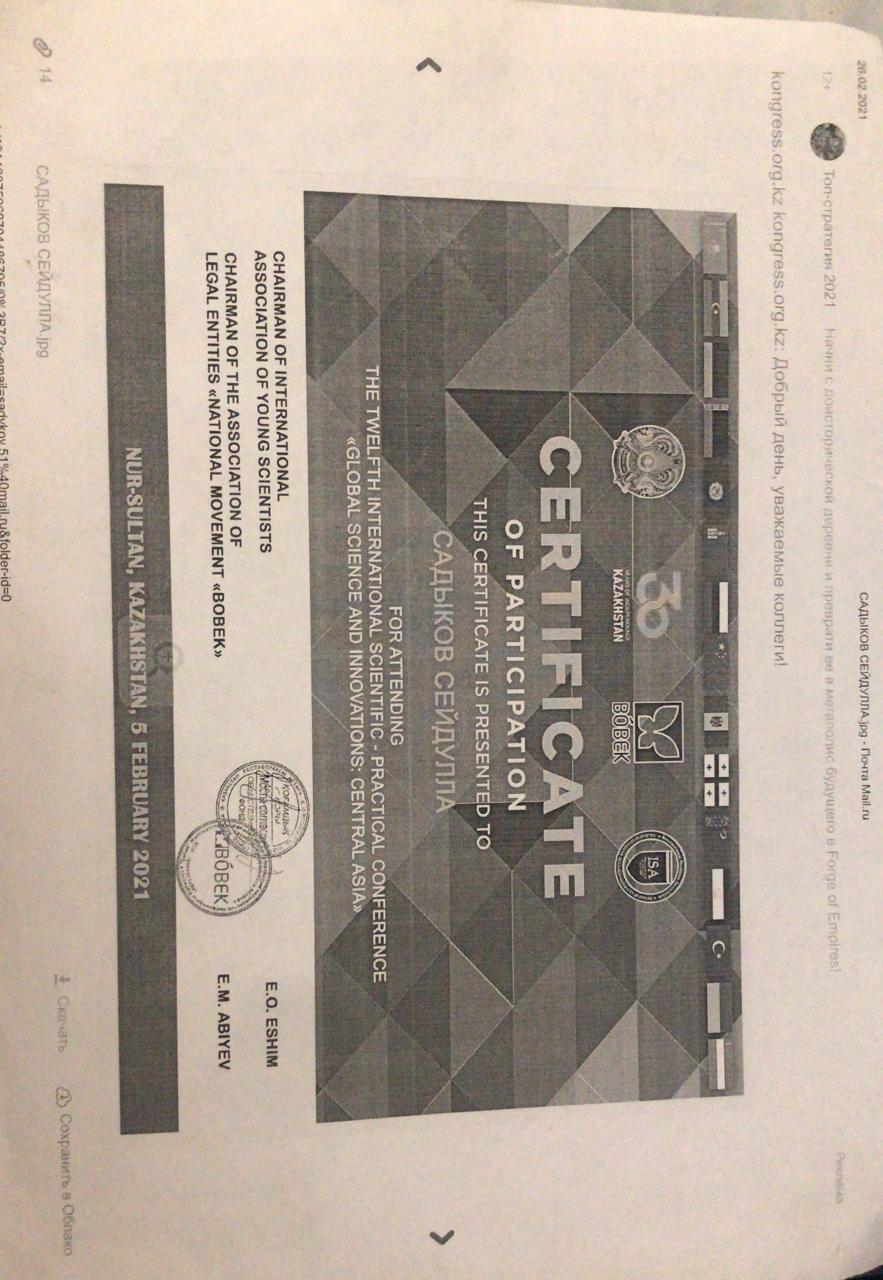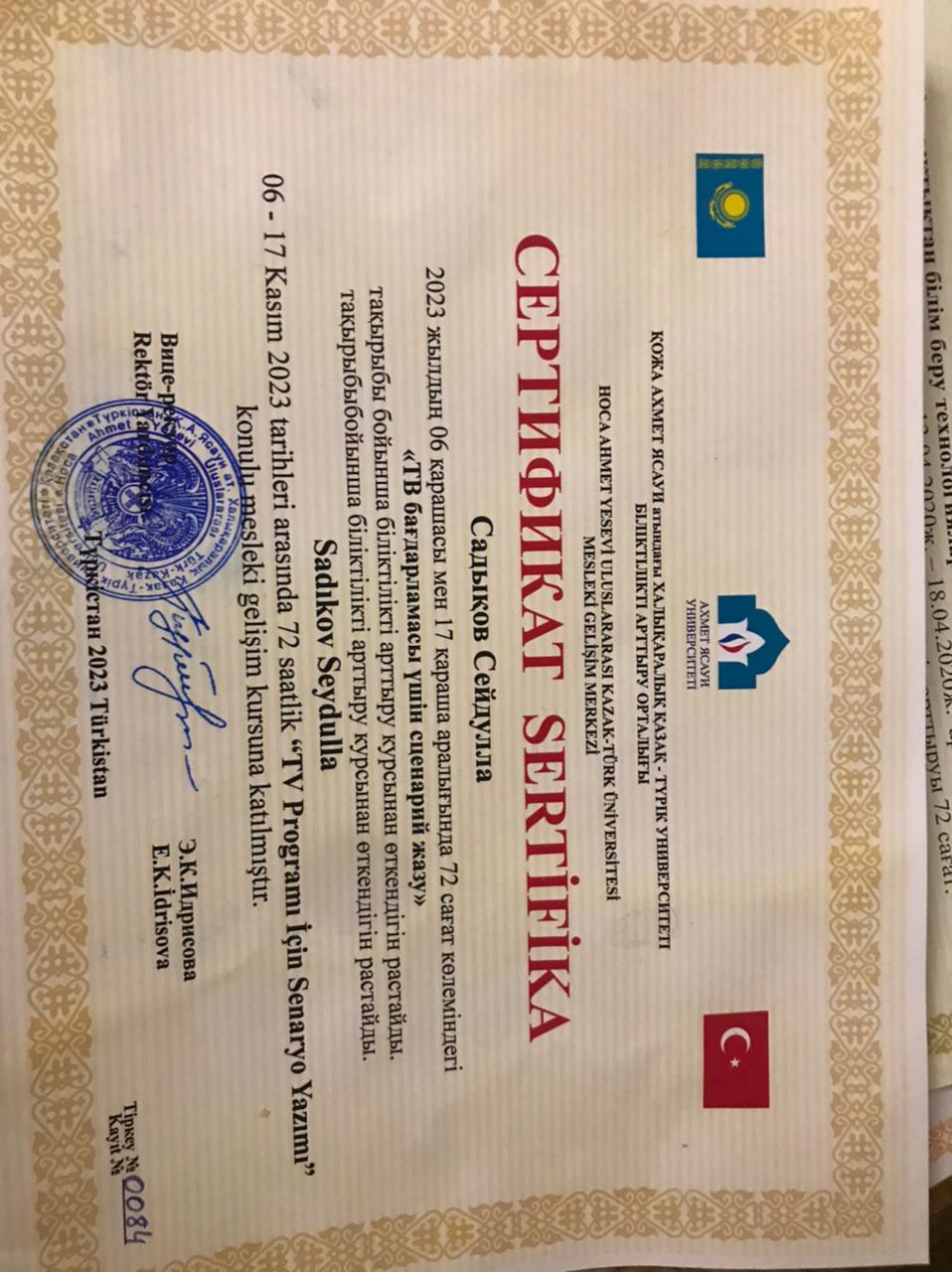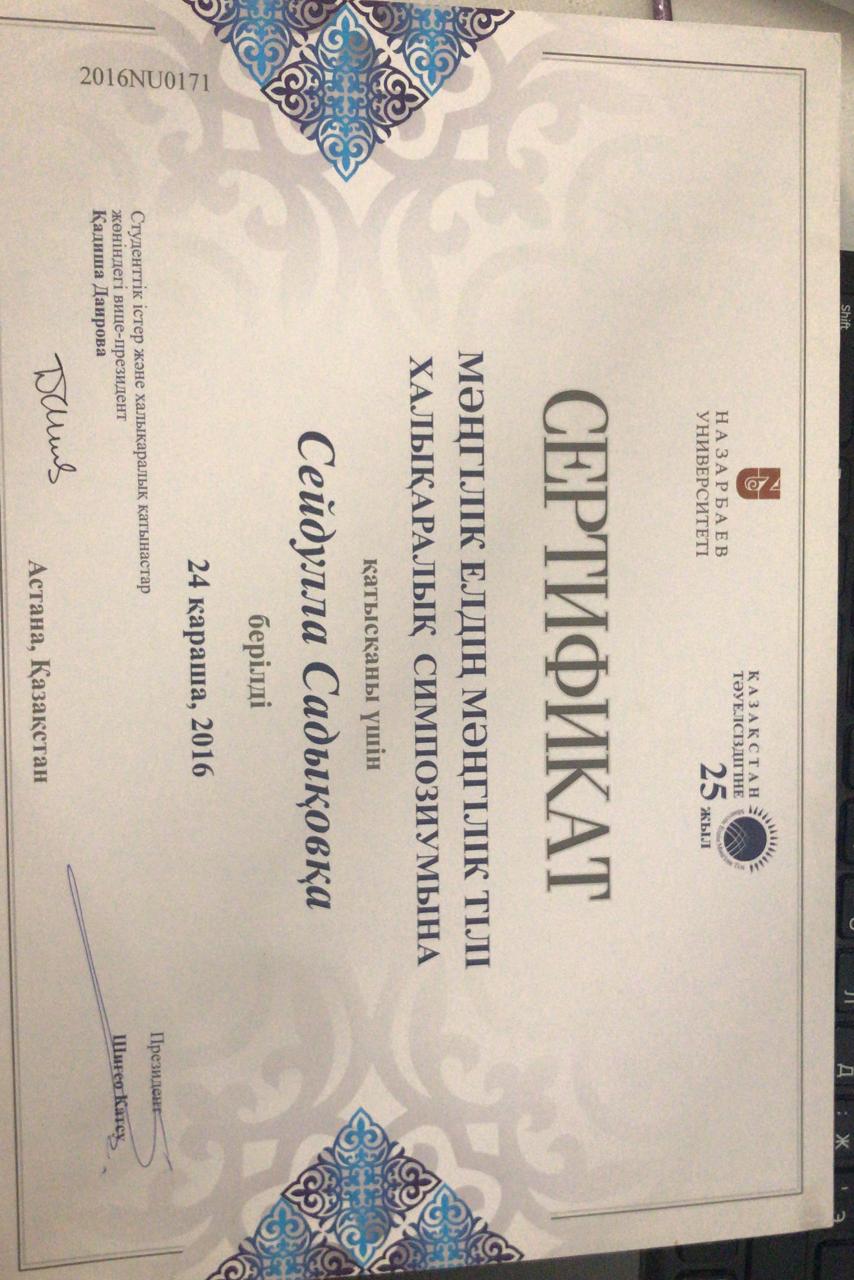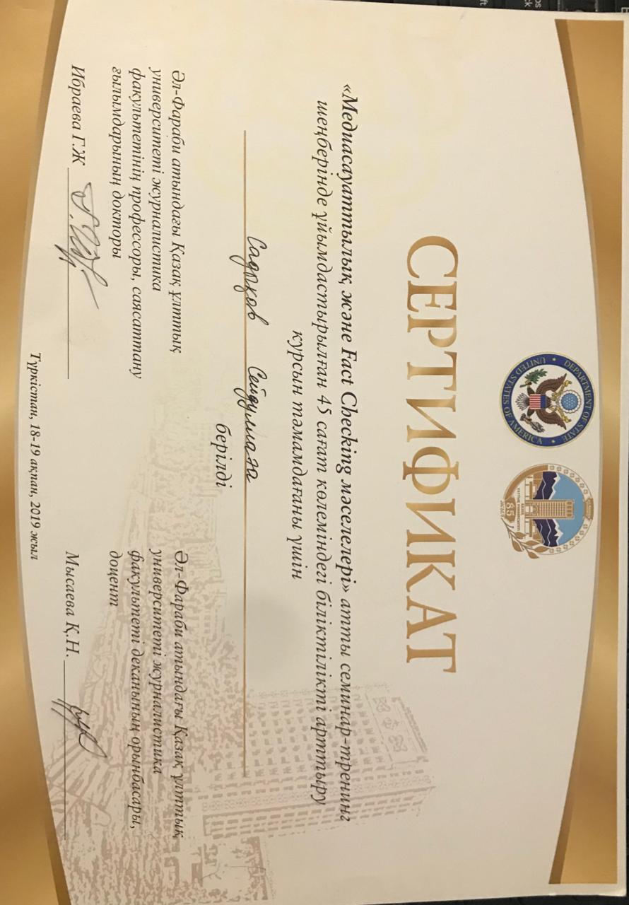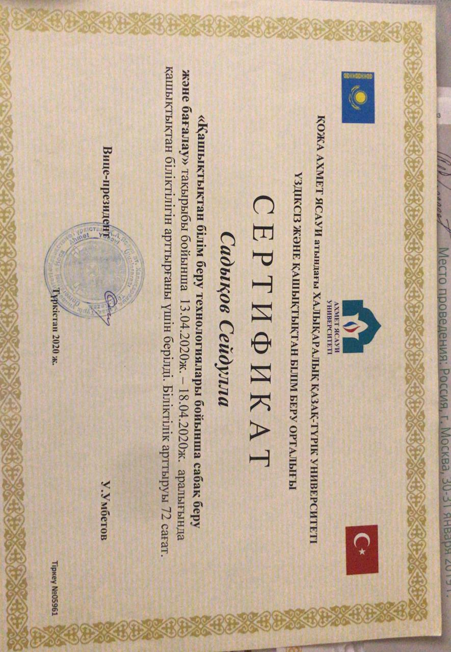 Аты жөні: Садықов СейдуллаМекен жайы: Түркістан облысы, Түркістан қаласы, Т.Озал көшесі, №14 үйТелефоны: (моб.: 8-702-477-20-56, 8-771-793-81-31), seidulla.sadykov@ayu.edu.kzТуған жылы және жері: 27. 09. 1951 ж. Түркістан облысы, Жетісай ауданы, Мақталы ауылы• Ұлты: қазақ• Жанұя жағдайы: отбасылы• Азаматтығы: ҚРБілімі: Жоғары 1972-1977 жж. Алматы қаласы, С.М.Киров атындағы Қазақ Мемлекеттік университеті, Журналистика факультетінің студенті.Мамандығы: журналист Жалпы еңбек стажы: 55 жыл.Журналистік қызметі: 1977-1987 жж. Қазақстан КП насихат және үгіт бөлімінің жолдамасымен Алматы облыстық «Жетісу» газетінде меншікті тілші. Педагогикалық стажы: 36 жыл; 1987-1994 жж. Әл-Фараби ат. ҚазҰУ Журналистика факультетінің аға оқытушысы; 1994 жылдан Қожа Ахмет Ясауи ат. Халықаралық қазақ-түрік университетінің доценті; кафедра меңгерушісі, университет профессоры.Кафедрасы: Журналистика, Әлеуметтік-гуманитарлық ғылымдар факультеті.Ғылыми дәрежесі, атағы: 1993, 26.06. – Ресей Федерациясы, М.В.Ломоносов ат. Мәскеу Мемлекеттік университетінің диссертациялық кеңесінде 10.01.10 – Журналистика саласы бойынша кандидаттық диссертация қорғаған; 2012, 29.03. - Мирзо Улугбек атындағы Өзбекстан Ұлттық университетінің диссертациялық кеңесінде 10.01.10 – Журналистика саласы бойынша докторлық диссертация қорғаған; 2014, 16.06. – Бақылау комитетінің шешімімен Әдебиеттану мамандығы бойынша қауымдастырылған профессор (доцент) ғылыми атағы берілген.Тілдерді білуі: қазақ тілі – өз тілім, орыс тілі - еркін, өзбек, түрік тілдері – сөздікпенҰстанымы, қызығушылығы: Қазақ елінің, қазақ халқының мәртебесі. Президент Жолдаулары мен еңбектерінің үздік насихатшысы.Ғылыми еңбектері: Америка, Қытай, Германия, Нидерланды, Ресей, Түркия, Өзбекстан, Әзербайжан, Қырғызстан елдерінің ғылыми басылымдарында жарияланған. Импакт-фактор журналдарында 8 мақаласы жарық көрген. Ғылыми еңбектерінің саны 100-ден астам, оның ішінде 3 оқулық, 3 монография, 5 оқу құралы, әлем тілдерінде жарық көрген 7 ғылыми мақалалар жинағының авторы. Халықаралық, республикалық конференциялар мен Халықаралық симпозиум, конгрестерде 20-дан астам баяндама жасаған. 2015 жылы «Казахи. Вопросы идентификации и идентичности и печать Казахстана» атты монографиясы Германияның «Palmarium Academic Publishing» академиялық баспасынан жарық көрген. Монографиялар топтамасы үшін ҚР Жоғарғы оқу орындары Қауымдасығы 2017 жылы жариялаған конкурста «Үздік монография» номинациясы бойынша ІІ дәрежелі Дипломмен марапатталды. Мамандығы бойынша марапаттары:Қазақстан Журналистер одағы сыйлығының лауреаты – 2002; республика «ЖОО үздік оқытушысы – 2012», ТУРКСОЙ-дың А.Байтұрсынов медалінің иегері.Қоғамдық жұмыстары: «Аманат» партиясының мүшесі, университет ардагерлер кеңесі мен сыбайлас жемқорлыққа қарсы күрес ұйымының мүшесі.