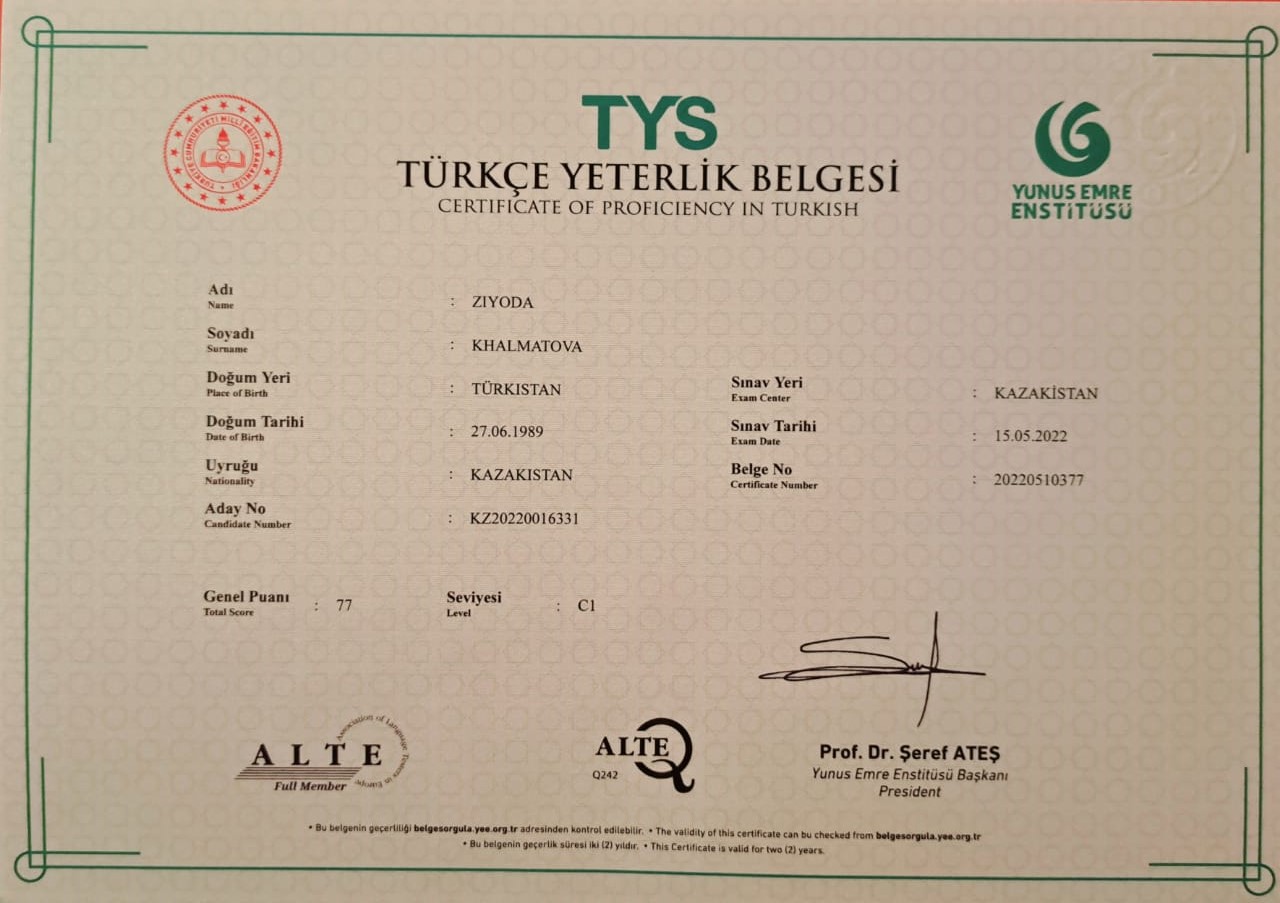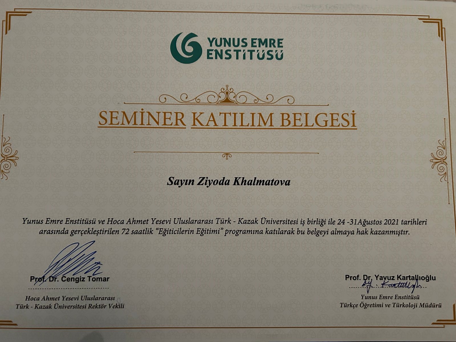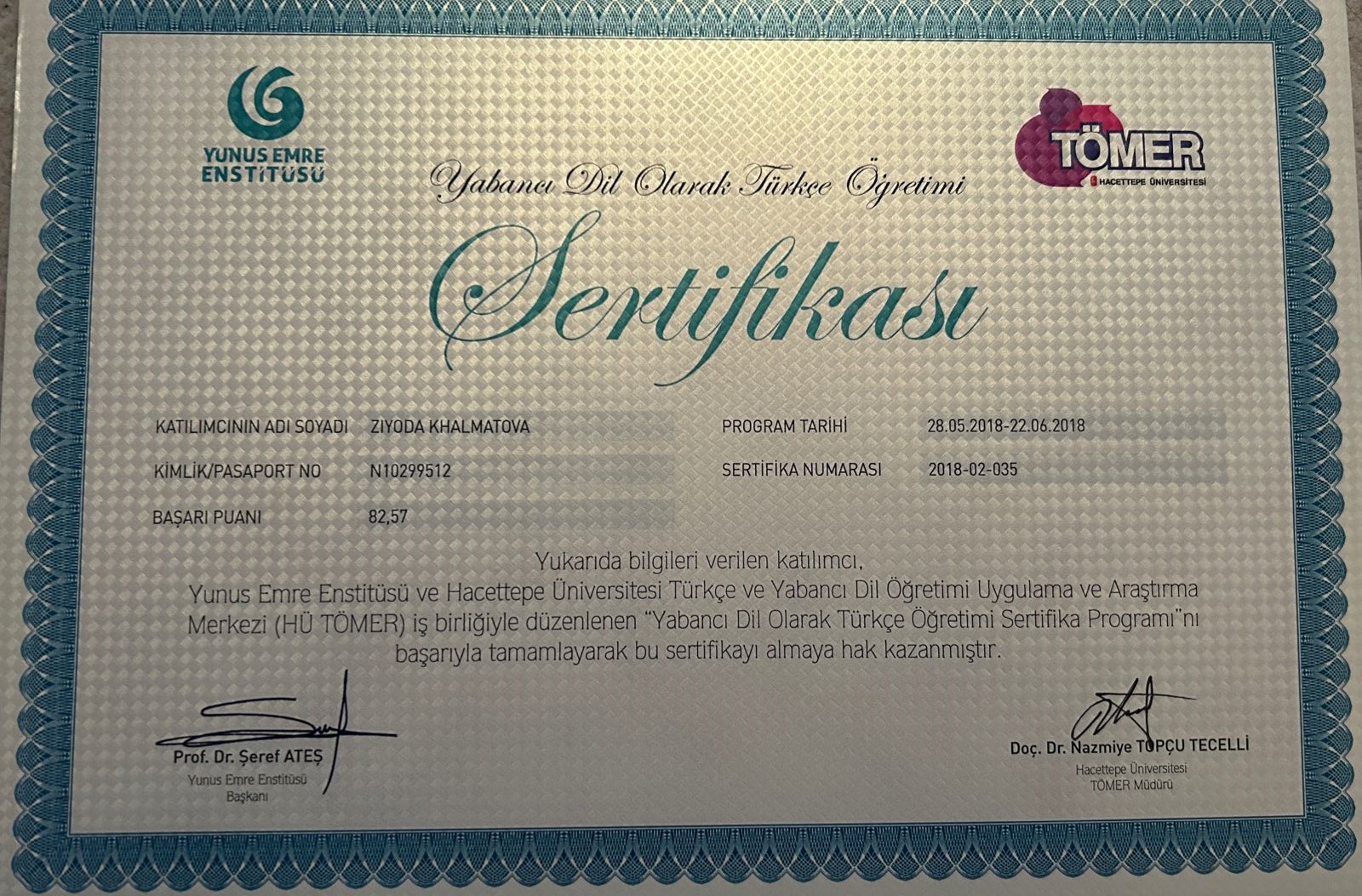Ad ve Soyad: Ziyoda KhalmatovaCep Telefonu: +77075727972WhatsApp: +77029181551E-mail: ziyoda.khalmatova@gmail.comDoğum Tarihi: 27 Haziran 1989Adres: Türkistan şehri, Amangeldi Sk. No75 Türkistan/KazakistanEğitimDoktora (Ekim 2016 – Ekim 2021)Hacettepe Üniversitesi, Ankara/TürkiyeEnstitü: Turkiyat AraştırmalarıBölüm: Yabancı Dil olarak Türkçe ÖğretimiSertifika Programı (Mayıs 2018 – Haziran 2018)Yunus Emre Enstitüsü, Ankara/TürkiyeYabancı Dil olarak Türkçe Öğretiminin Sertifika ProgramıYüksek Lisans (Eylül 2011 – Ocak 2013)A. Yesevi Uluslararası Kazak-Türk Üniversitesi, Türkistan/KazakistanFakülte: FilolojiBölüm: İki yabancı diller: İngilizce-TürkçeLisans (Eylül 2007 – Haziran 2011)A. Yesevi Uluslararası Kazak-Türk Üniversitesi, Türkistan/KazakistanFakülte: FilolojiBölüm: İki yabancı diller: İngilizce-Türkçeİş DeneyimiTürkçe Öğretmeni (15/05/2017 - 10/07/2021)Uluslararası Gençlik Aktiviteleri Merkezi Derneği (IYACA), Ankara/TürkiyeErasmus ESC programı kapsamında Türkiye’ye gelen Avrupalı gönüllülere Türkçe öğretimiRektör Vekili Asistanı (01.04.2014 - 30.09.2016)A. Yesevi Uluslararası Kazak-Türk Üniversitesi, Türkistan/KazakistanKazakça, Rusça, Türkçe ve İngilizce belgelerin kayıt işlemleri, anlaşma ve mektup yazma işlemleriTercüman (04.04.2013 - 10.02.2014)Alsim Alarko Sanayi Tesisleri ve Ticaret A.S., Aktau/KazakistanTürkçe-Kazakça sinkronik çeviriler ve İngilizce-Rusça yazılar ve sözleşmelerin tercümeleriOffice Manager (28.09.2012 - 03.12.2012)JV COPRI Construction Enterprises, Çimkent/KazakistanŞirket organizasyonunun ofisi içinde bir iş sürecini kontrol etmek için evrak işlemlerinin kayıtları ile sorumluStaj ve ProjelerGönüllü (07/05/2019 - 07/07/2019)Erasmus EVS Programı, Branesti/RomanyaLise öğrencilerinin demokrasi ve oylama hakkında bilgi sahibi olmalarına yardımcı olma, Türkçe ve İngilizce dillerini öğrenmek için farklı etkinliklerTürkçe Konuşma Kulübü Düzenleyicisi (14/05/2019 - 05/07/2019)Yunus Emre Enstitüsü, Bükreş/RomanyaTürkçe konuşma ile ilgili farklı etkinlikleri organize etmek ve hazırlamaktan sorumluBilimsel YayınlarKHALMATOVA, Z., KARABAĞ, A. YABANCI/İKINCI DİL ÖĞRETİMİNDE YÖNTEM SONRASI (POST METOT) PEDAGOJİ STRATEJİLERİ: MAKRO VE MİKRO STRATEJİLER. Bilimsel Eksen ISSN: 1309-5811, 10 Ocak 2020, Ankara/Türkiye.KHALMATOVA, Z. YABANCI DİL OLARAK TÜRKÇE ÖĞRETİMİNDE MODERN YÖNTEM VE TEKNİKLERİN KULLANIMI: TERS-YÜZ SINIF MODELİ. Hacettepe Üniversitesi Yabancı Dil Olarak Türkçe Araştırmaları Dergisi, 2017 (3), 35-51. Ankara/Türkiye.URAZBAYEV, K., KHALMATOVA, Z. LINGUISTIC INVESTIGATIONS OF TECHNICAL TERMS. Scientific World of Kazakhstan 2012-(41)1, 61-63 pp. ISSN: 1815-9486 Almaty/Kazakistan.URAZBAYEV, K., KHALMATOVA, Z. STRUCTURAL FORMATION OF TECHNICAL TERMS. Monthly Journal of Yesevi International Kazakh-Turkish University 2012-(79)3, 36-42 pp. Türkistan/Kazakistan.