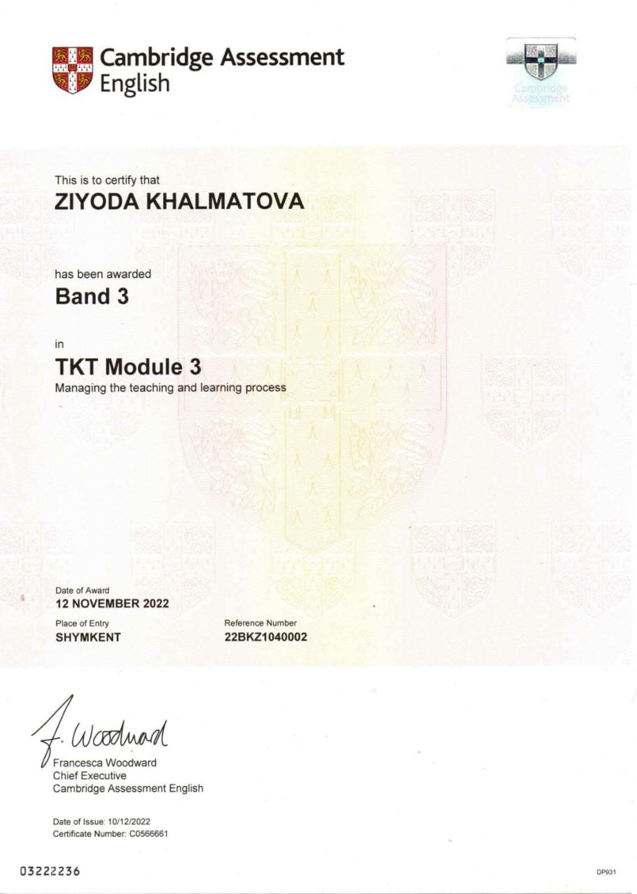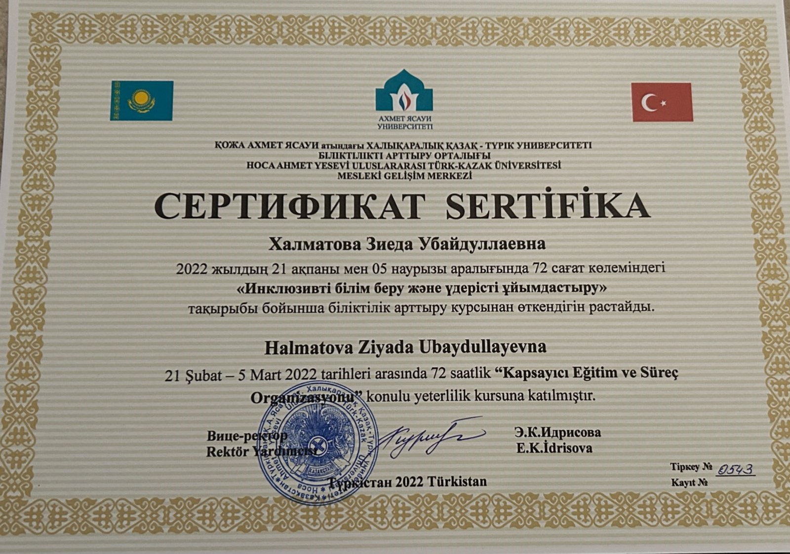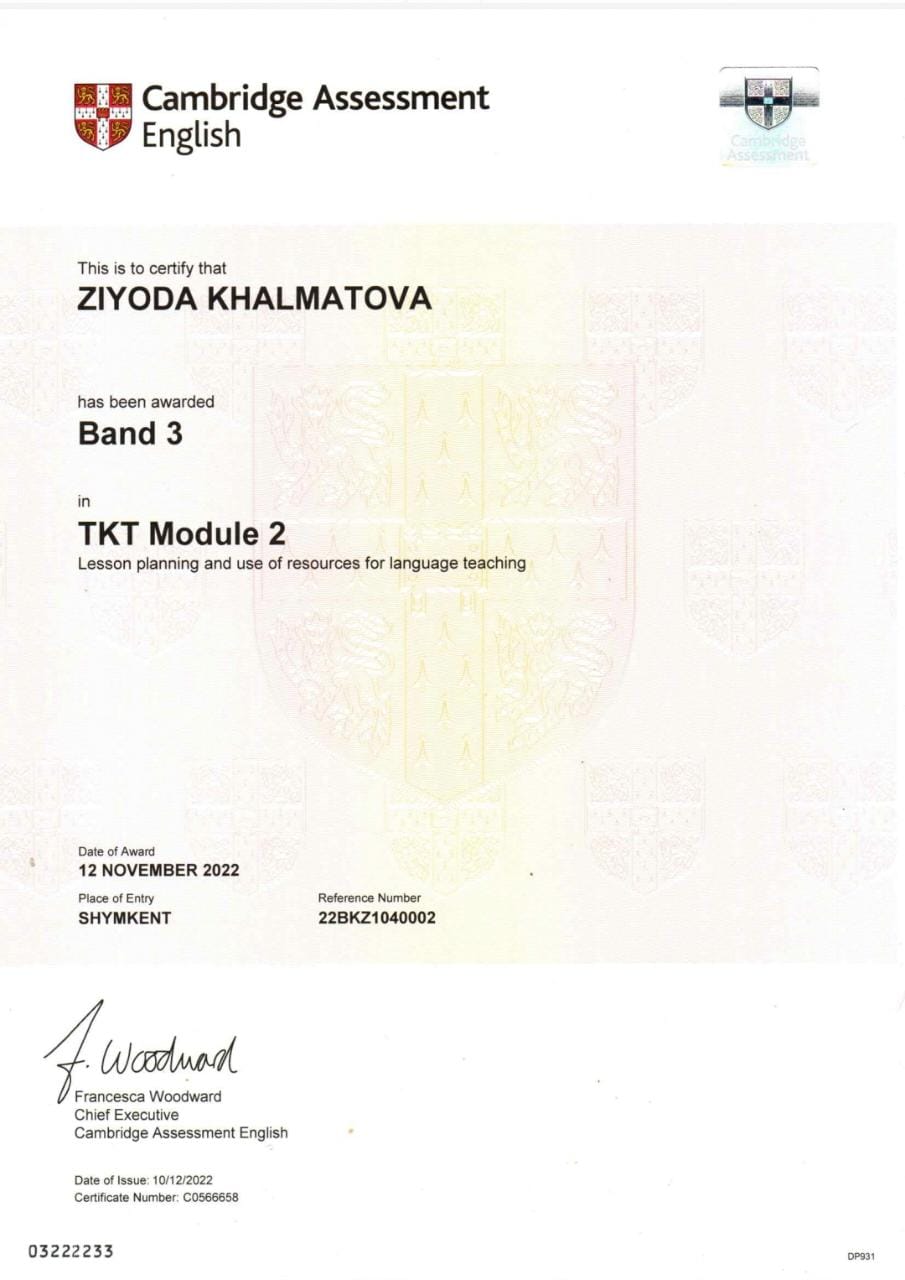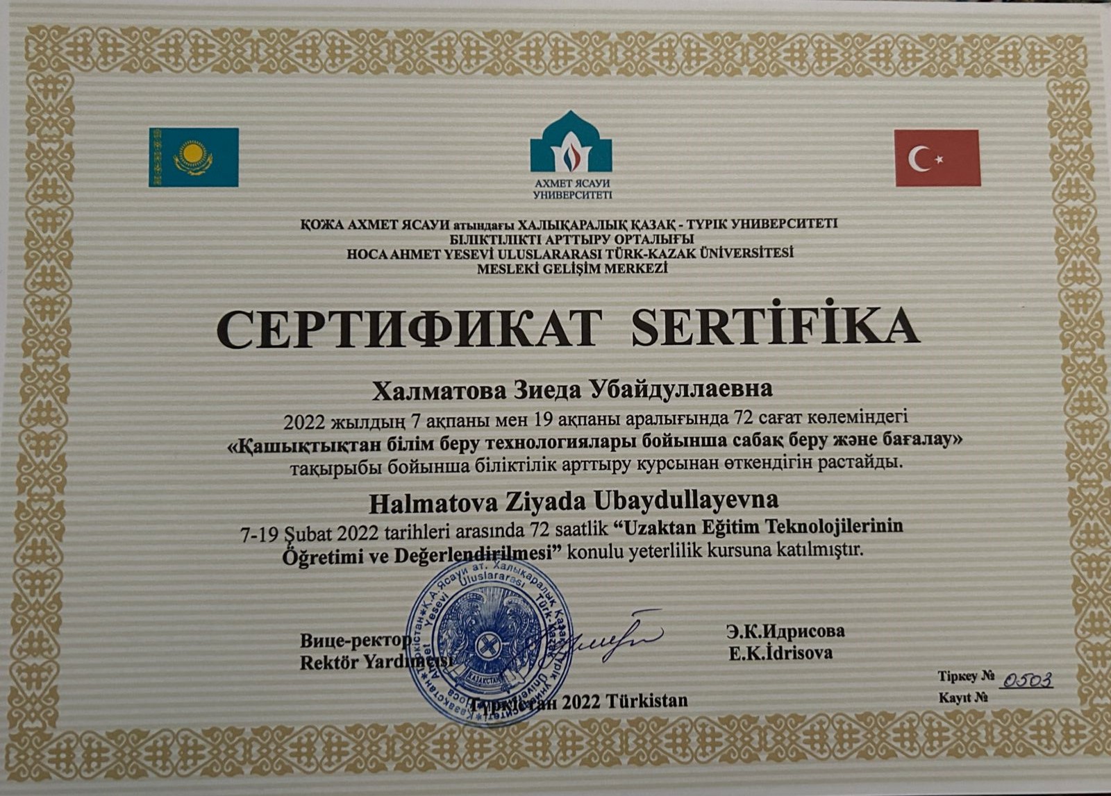 Ad ve Soyad: Ziyoda KhalmatovaCep Telefonu: +77075727972WhatsApp: +77029181551E-mail: ziyoda.khalmatova@gmail.comDoğum Tarihi: 27 Haziran 1989Adres: Türkistan şehri, Amangeldi Sk. No75 Türkistan/KazakistanEğitimDoktora (Ekim 2016 – Ekim 2021)Hacettepe Üniversitesi, Ankara/TürkiyeEnstitü: Turkiyat AraştırmalarıBölüm: Yabancı Dil olarak Türkçe ÖğretimiSertifika Programı (Mayıs 2018 – Haziran 2018)Yunus Emre Enstitüsü, Ankara/TürkiyeYabancı Dil olarak Türkçe Öğretiminin Sertifika ProgramıYüksek Lisans (Eylül 2011 – Ocak 2013)A. Yesevi Uluslararası Kazak-Türk Üniversitesi, Türkistan/KazakistanFakülte: FilolojiBölüm: İki yabancı diller: İngilizce-TürkçeLisans (Eylül 2007 – Haziran 2011)A. Yesevi Uluslararası Kazak-Türk Üniversitesi, Türkistan/KazakistanFakülte: FilolojiBölüm: İki yabancı diller: İngilizce-Türkçeİş DeneyimiTürkçe Öğretmeni (15/05/2017 - 10/07/2021)Uluslararası Gençlik Aktiviteleri Merkezi Derneği (IYACA), Ankara/TürkiyeErasmus ESC programı kapsamında Türkiye’ye gelen Avrupalı gönüllülere Türkçe öğretimiRektör Vekili Asistanı (01.04.2014 - 30.09.2016)A. Yesevi Uluslararası Kazak-Türk Üniversitesi, Türkistan/KazakistanKazakça, Rusça, Türkçe ve İngilizce belgelerin kayıt işlemleri, anlaşma ve mektup yazma işlemleriTercüman (04.04.2013 - 10.02.2014)Alsim Alarko Sanayi Tesisleri ve Ticaret A.S., Aktau/KazakistanTürkçe-Kazakça sinkronik çeviriler ve İngilizce-Rusça yazılar ve sözleşmelerin tercümeleriOffice Manager (28.09.2012 - 03.12.2012)JV COPRI Construction Enterprises, Çimkent/KazakistanŞirket organizasyonunun ofisi içinde bir iş sürecini kontrol etmek için evrak işlemlerinin kayıtları ile sorumluStaj ve ProjelerGönüllü (07/05/2019 - 07/07/2019)Erasmus EVS Programı, Branesti/RomanyaLise öğrencilerinin demokrasi ve oylama hakkında bilgi sahibi olmalarına yardımcı olma, Türkçe ve İngilizce dillerini öğrenmek için farklı etkinliklerTürkçe Konuşma Kulübü Düzenleyicisi (14/05/2019 - 05/07/2019)Yunus Emre Enstitüsü, Bükreş/RomanyaTürkçe konuşma ile ilgili farklı etkinlikleri organize etmek ve hazırlamaktan sorumluBilimsel YayınlarKHALMATOVA, Z., KARABAĞ, A. YABANCI/İKINCI DİL ÖĞRETİMİNDE YÖNTEM SONRASI (POST METOT) PEDAGOJİ STRATEJİLERİ: MAKRO VE MİKRO STRATEJİLER. Bilimsel Eksen ISSN: 1309-5811, 10 Ocak 2020, Ankara/Türkiye.KHALMATOVA, Z. YABANCI DİL OLARAK TÜRKÇE ÖĞRETİMİNDE MODERN YÖNTEM VE TEKNİKLERİN KULLANIMI: TERS-YÜZ SINIF MODELİ. Hacettepe Üniversitesi Yabancı Dil Olarak Türkçe Araştırmaları Dergisi, 2017 (3), 35-51. Ankara/Türkiye.URAZBAYEV, K., KHALMATOVA, Z. LINGUISTIC INVESTIGATIONS OF TECHNICAL TERMS. Scientific World of Kazakhstan 2012-(41)1, 61-63 pp. ISSN: 1815-9486 Almaty/Kazakistan.URAZBAYEV, K., KHALMATOVA, Z. STRUCTURAL FORMATION OF TECHNICAL TERMS. Monthly Journal of Yesevi International Kazakh-Turkish University 2012-(79)3, 36-42 pp. Türkistan/Kazakistan.