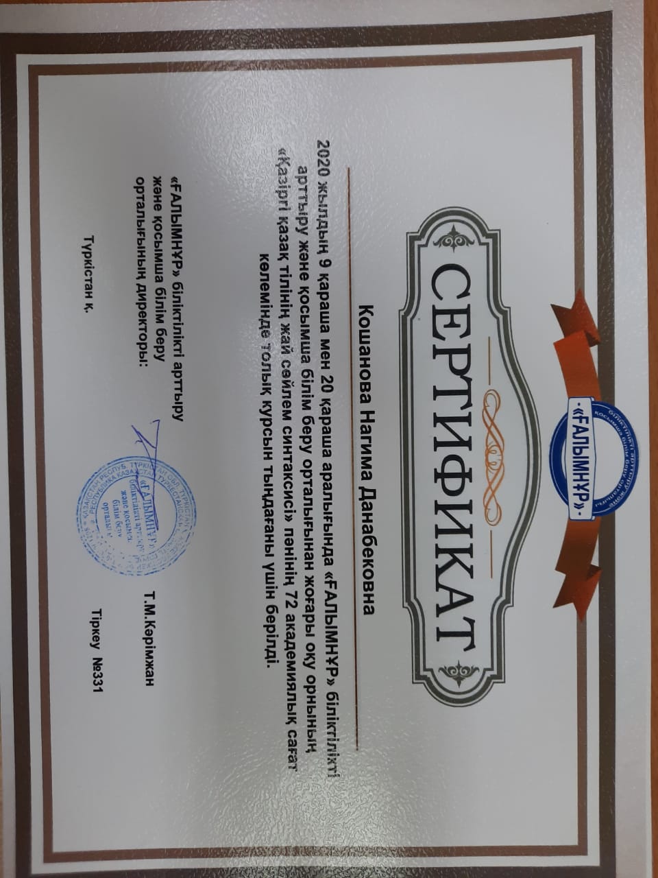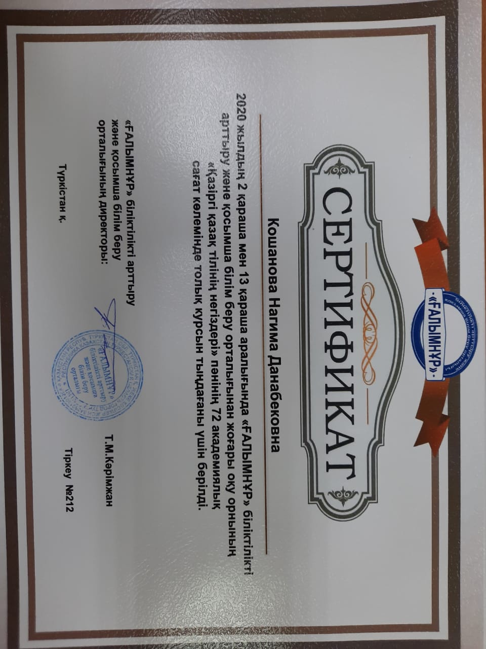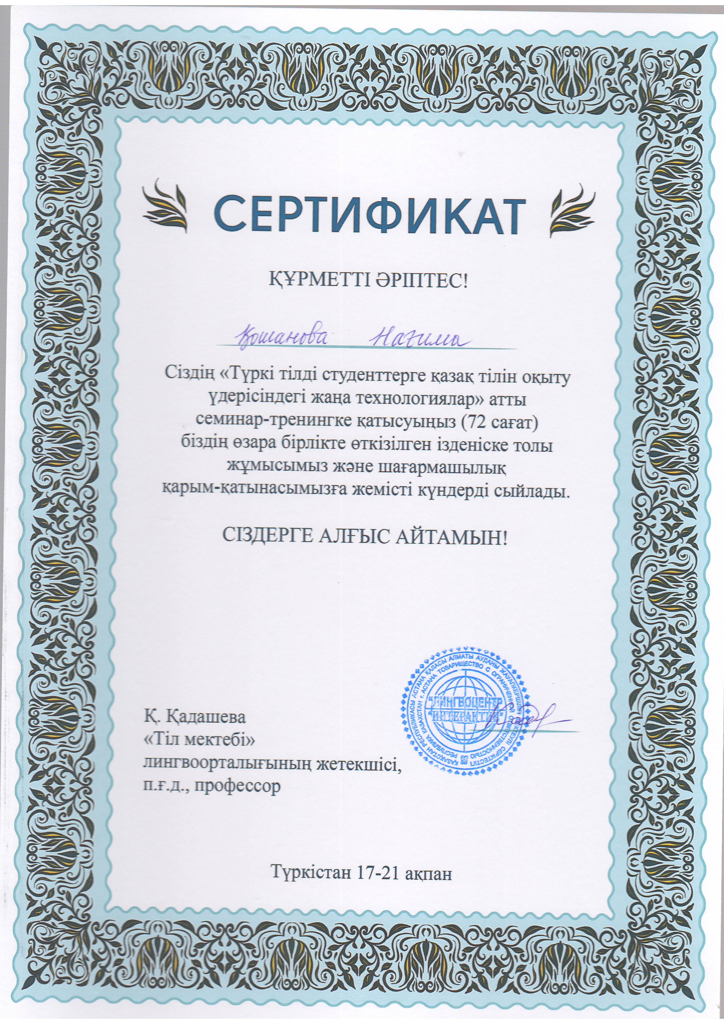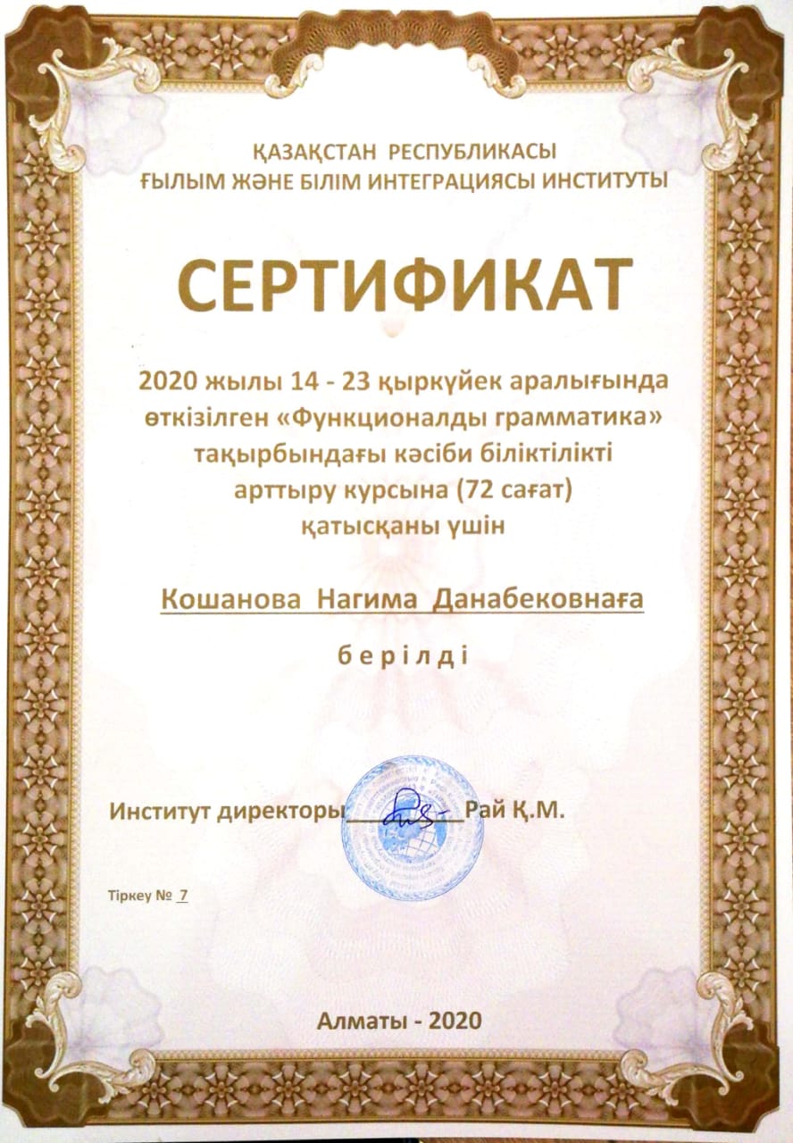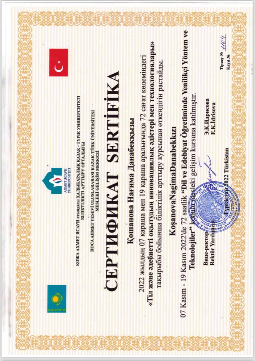 Өмірбаян Мен, Қошанова Нағима Данабековна, 12.08.1960 жылы Оңтүстік Қазақстан облысы (қазіргі Түркістан облысы), Алғабас ауданы, Шаян ауылында мұғалім отбасында дүниеге келдім. Ұлтым – қазақ. 1967 жылы Қ.Сыпатаев ауылында Қ.Сыпатаев мектебіне бастауышқа барып, 1975 жылы осы мектептің сегізжылдығын бітірдім. 1975-1979 жылдары Түркістан қаласында Ы.Алтынсарин атындағы педагогикалық училищесінде оқыдым. 1979-1984 жылдары әл-Фараби атындағы ҚазҰУ-дің Филология факультеті, «қазақ тілі мен әдебиеті» мамандығы бойынша оқып бітірдім. 1984-1985 жылдар арасында Алматы қаласында №1 Ғ.Мүсірепов атындағы орта мектептің қазақ тілі пәні мұғалімі болып қызмет атқардым.1985-1992 жылдар арасында Отырар ауданы Арыс елдімекенінде Т.Ибрагимов атындағы орта мектептің қазақ тілі мен әдебиеті пәнінің мұғалімі болып қызмет еттім.1992 жылдан бері Қ.А.Ясауи атындағы Халықаралық қазақ-түрік университетінің филология факультеті қазақ филологиясы кафедрасының оқытушысы, аға оқытушысы, доценті қызмет атқарып келемін. 1995 ж «Қазіргі қазақ тіліндегі тұрақты тіркестердің синтаксистік қызметі» тақырыбында филология ғылымының кандидаттығын ҚР ҰҒА А.Байтұрсынов атындағы Тіл білімі институтында қорғадым. 2006 ж тіл білімі мамандығы бойынша доценті ғылыми атағын алдым. Қазіргі қазақ тілінің синтаксисі, тұрақты тіркестерінің сөйлемдегі синтаксистік қызметі. Осы бағытта 70 шақты ғылыми мақалалары, екі монографиясы мен 4-5 оқу құралым барОтбасылық жағдайым: екі ұл, екі қыз тәрбиелеп отырған анамын.Қазіргі қазақ тілінің синтаксисі, тұрақты тіркестерінің сөйлемдегі синтаксистік қызметі тақырыптары ғылыми бағытым болып табылады. Қошанова Нағима Данабековна
