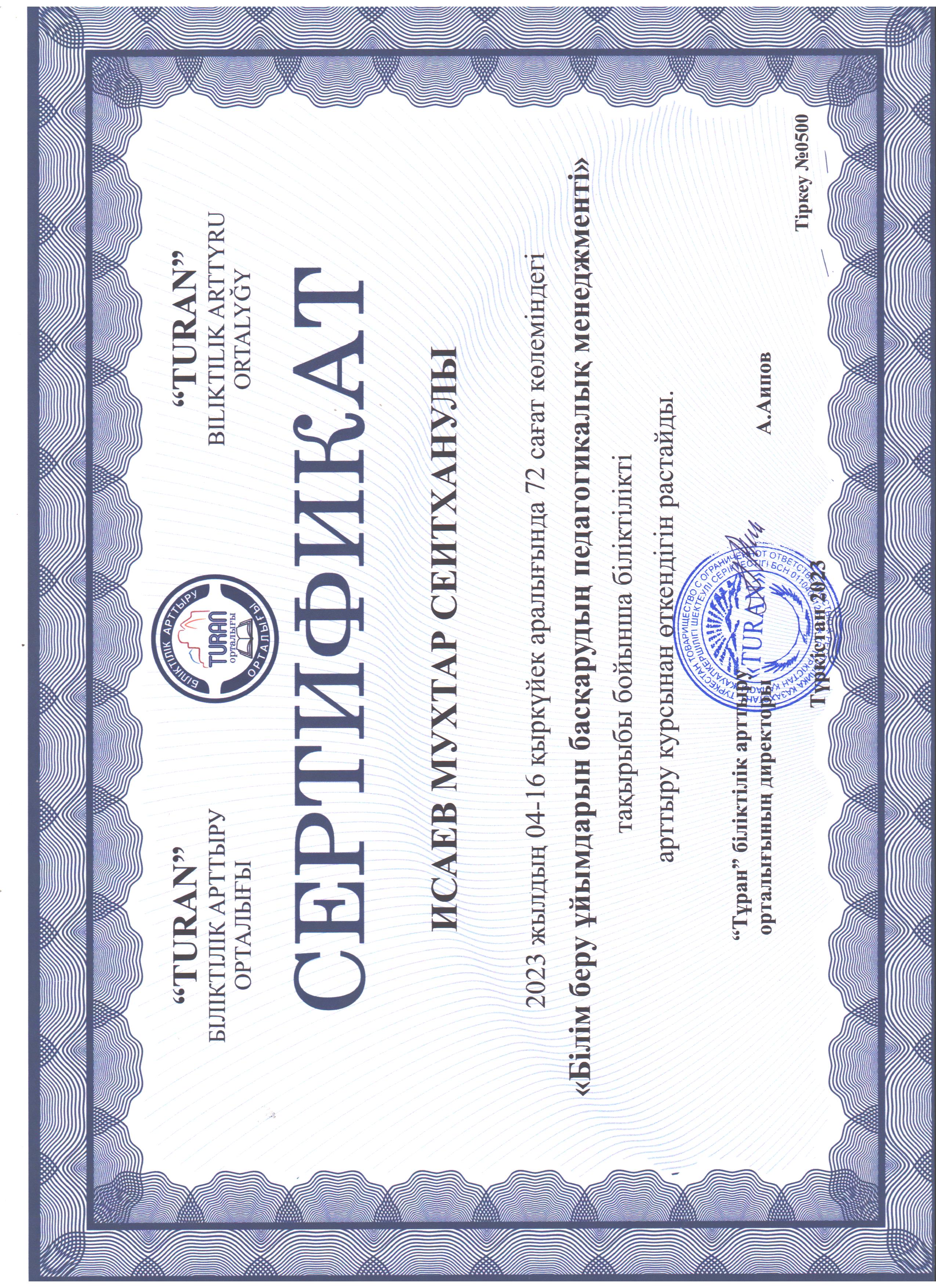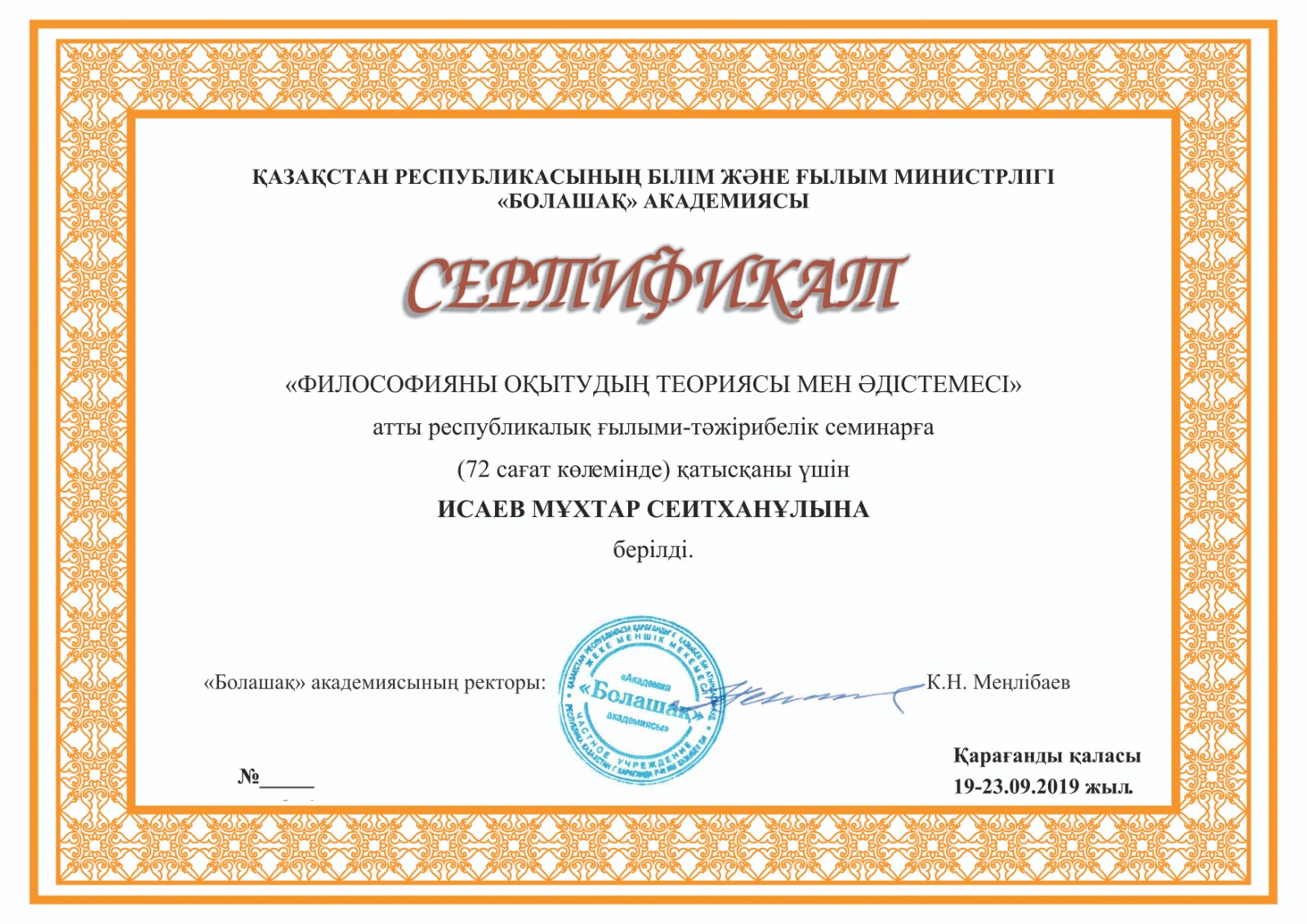 Өмірбаян Исаев Мухтар Сеитханулы - «Философия» кафедрасының меңгерушісі. Білімі - жоғары:1. Қожа Ахмет Ясауи атындағы Халықаралық қазақ-түрік университеті (2001-2005 жж). Мамандығы: философия бакалавры. 2. Қожа Ахмет Ясауи атындағы Халықаралық қазақ-түрік университеті (2006-2008 жж). Мамандығы: философия магистры3. Қожа Ахмет Ясауи атындағы Халықаралық қазақ-түрік университеті (2013-2016 жж). Мамандығы: 6D011400-Тарих мамандығы докторанты2016 жылы - 6D011400-Тарих мамандығы бойынша PhD (философия докторы) дәрежесін алды (ҒД №0001738). Еңбек жолын 2009-2013 жылдар аралығында Қожа Ахмет Ясауи атындағы Халықаралық қазақ-түрік университеті «Философия» кафедрасында оқытушы болып бастады. 2013-2016 жылдары Қожа Ахмет Ясауи атындағы Халықаралық қазақ-түрік университетінде 6D011400-Тарих мамандығы бойынша докторанты.2017-2019 жылдар аралығында «Әзірет Сұлтан» мемлекеттік тарихи-мәдени қорық-музейінде аға ғылыми қызметкер.2019-2023 қыркүйек айына дейін Қожа Ахмет Ясауи атындағы Халықаралық қазақ-түрік университетінде аға оқытушы. 2023 жылдың қыркүйек айынан бастап «Философия» кафедрасының меңгерушісі. Елуге жуық ғылыми, ғылыми-әдістемелік мақалалардың, оның ішінде 1 монография, 2 оқулық, 3 оқу құралы, оның ішінде ағылшын тілінде жазылған 1 оқулық, 1 электрондық оқу құралының авторы. Хирша индексі (һ) – 1.Орыс, түрік тілдерін жоғары деңгейде меңгерген. 2021-2023 жылдары Қазақстан Республикасы Мәдениет және спорт министрлігі қаржыландыратын «BR10164268 – Қазақстандағы рухани жерасты мешіттерінің тарихы және «Қылует» жерасты мешітін музейлендіру гранттық жобасы бойынша орындаушы қызметін атқарды.Қазақстан Республикасы Ғылым және жоғары білім министрлігі қаржыландыратын AP19679946 «Болашақ тарих мұғалімдеріне «Қазақстан тарихы» пәнін оқыту әдістемесін ақпараттық және цифрлық технологияларды пайдалану арқылы дамыту» атты гранттық жобасының жетекшісі қызметін атқарып келеді. «Әзірет Сұлтан» мемлекеттік тарихи-мәдени қорық-музейінің 40-жылдық мерекелік медалімен марапатталған. №28. Директор Н.Ахметжанов. Түркістан, 2018ж.Түркістан қаласының мәдени өміріне қосқан үлесі үшін Түркістан қаласы әкімінің Алғыс хатымен мараптталған. Түркістан қаласының әкімі Ә.Өсербаев, 2018ж.Ғылым саласындағы жетістіктері үшін Қожа Ахмет Ясауи атындағы Халықаралық қазақ-түрік университеті ректорының Алғыс хатымен марапатталған. Түркістан, 2020 ж.