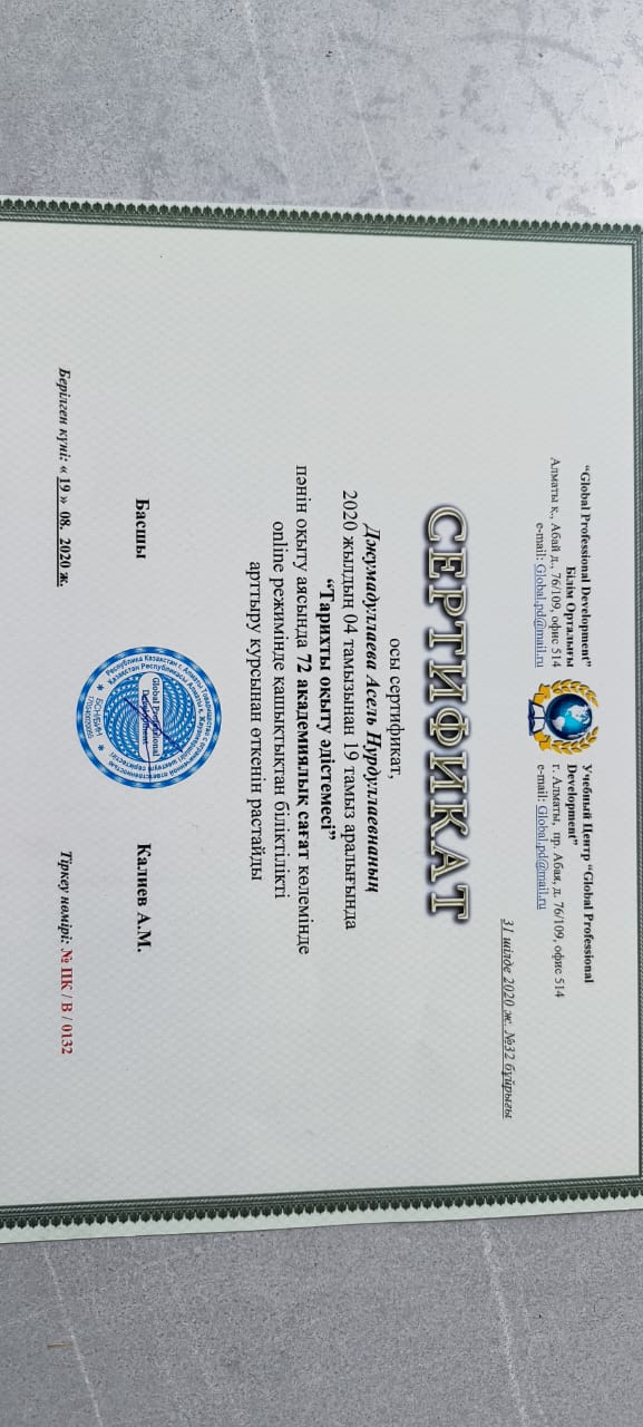 Мен, Джумадуллаева Асель Нурдуллаевна 22.12.1978 жылы Түркістан қаласында дүниеге келдім. 1985 -1995 №6 М.Маметова атындағы қазақ орта мектебін бітірдім. 1995ж Алматы қаласы Абай ат педагогикалық униерситетке 1 курска қабылдандым-1999 ж ХҚТУ ті бітіріп Тарихшы, тарих пәнінің оқытушысы деген біліктілік берілді. 01.09.1999-2003ж ж “Гуманитарлық техникалық колледж”( пед колледжде) тарих пәніні оұытушысы болып жұмысқа қабылдандым. 2003 жылы Қ.А.Ясауи ат.Халықаралық қазақ-түрік университетіне ауыстым. “Жалпы тарих” кафедрасында 2007 ж аға оқытушы болдым. 2009 ж тарих ғылымдарының кандидаты дәрежесі берілді. Қазіргі таңда “Тарих” кафедрасында доцент міндетін атқарушы. Әлеуметтік гуманитарлық ғылымдар факультетінде оқу-әдістемелік комитет төрағасы.