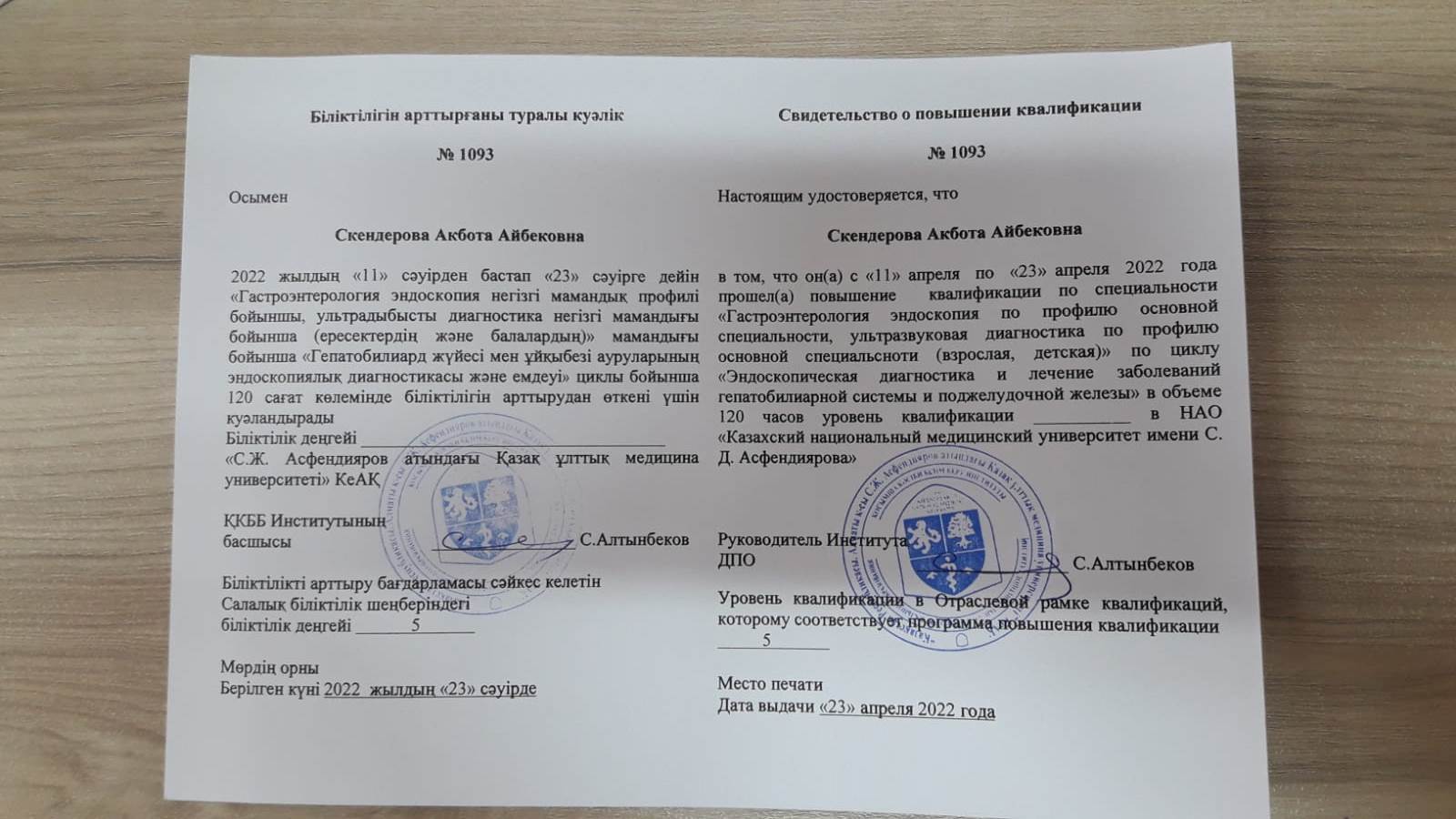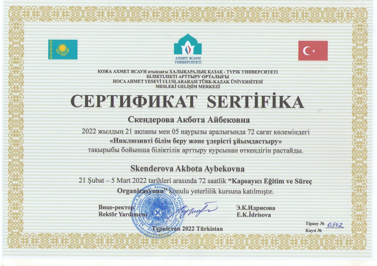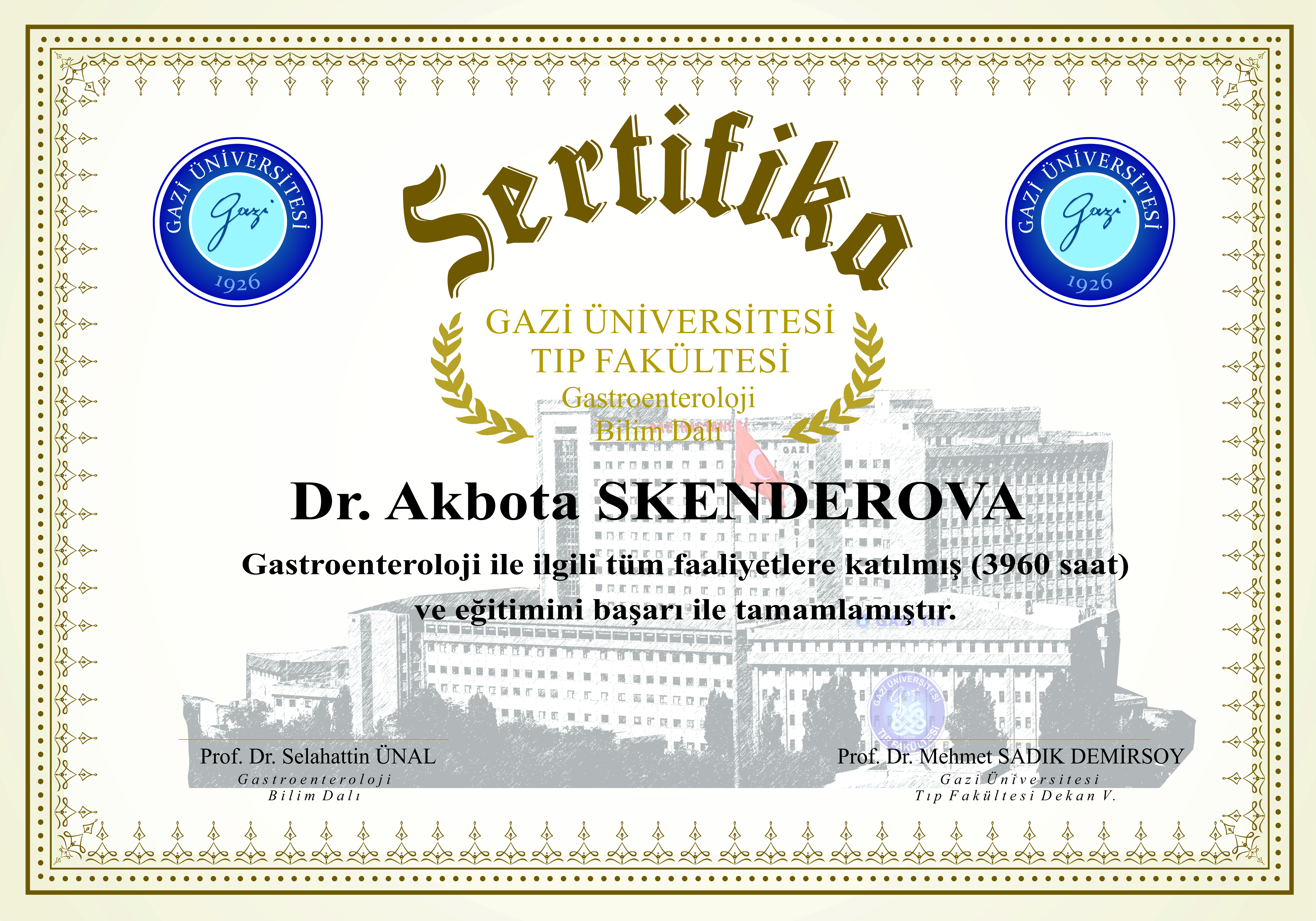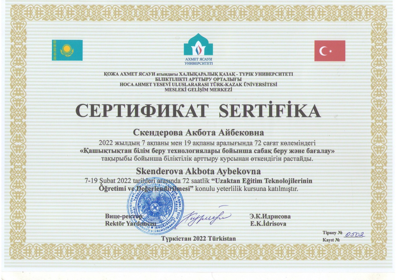Мен, Скендерова Акбота Айбековна, 22-қараша айында 1986 жылы Түркістан облысы, Кентау қаласында дүниеге келдім. 2004 жылы Кентау қаласында Әл-Фараби атындағы гимназия орта мектепті бітірдім. Еңбек жолы:-2004-2010 жылдары Қ.А.Ясауи атындағы ХҚТУ-да Медицина факультеті «Емдеу ісі» мамандығы студенті;-2010-2011 жылдары Қ.А.Ясауи атындағы ХҚТУ-да Медицина факультеті «Емдеу ісі» мамандығы интерн-дәрігері;-2011-2013 жылдары Түркістан қалалық ХҚТУ-да Медицина факультеті «Емдеу ісі» мамандығы резидент-дәрігері;-2013-2014 жылдары Қ.А.Ясауи атындағы ХҚТУ-да Медицина факультеті, «Пропедевтика және ішкі аурулар» кафедрасының резидент оқытушысы;-2015-2017 жылдары Түркия Гази университетінің Гастроэнтерология бөлімі, тәжірибе алмасу;2017-2022 жылдары Түркия Гази университетінің «Клиникалық фармокология» бөлімі, PhD докторанты;-2022 жылдан бүгінгі күнге дейін Қ.А.Ясауи атындағы ХҚТУ-да Медицина факультеті, «Жалпы хирургия» кафедрасында PhD, аға оқытушы, ХҚТУ КДО гастроэнтеролог. Жеткен жетістіктері:1. Түркия Республикасының Жоғары білім беру Кеңесінің 2022 жылдың 5-қаңтар күнгі шешімімен «Клиникалық фармакология» мамандығы бойынша ғылым докторы;2. Түркия Республикасы Гази университеті «Гастроэнтерология» 3080 сағаттық маман сертификаты (3.12.2014-26.10.2016); Жарияланымдар:Scopus индексті және WOS жоғары индексті журналдарда жарияланған мақалалар:Muhammed Cihan Güvel 1 , Akbota Skenderova 1,2, Canan Uluoğlu 1 ‘Melatonin ve Gastrointestinal Patolojilerdeki Rolü’ Derleme/ Review GMJ 2021; 32: 680-685. Халықаралық журналдарда жарияланған мақалалар:Даулетова М.Д., Баратова Г.М., Скендерова А.А. «Структура и особенности лечение атипичных пневмонии». ХҚТУ Хабаршысы, 1(76): 255-258 (2012). Даулетова М.Д., Скендерова А.А., Ермаханова Ж.А. «Актуальные проблемы хронической почечной недостаточности." ХҚТУ Хабаршысы, 1(88): 177-179 (2014). Халықаралық конференцияларда жарияланған постерлер:26. Ulusal ve 1. Uluslararası Farmakoloji Kongresi ‘Peptik ülser modelinde sıçan fundus şeritlerinin elektriksel alan uyarısına verdiği nörojenik kasılma yanıtlarında melatonin ve nitrik oksidin rolü’ Akbota SKENDEROVA, Derya SEBİLE KOÇ, Muhammed Cihan GÜVEL, Gökçe Sevim ÖZTÜRK FİNCAN, Canan ULUOĞLU/ Türk Farmakoloji Derneği, 4-6 Kasım 2021. Курстар:1. 26. Ulusal ve 1. Uluslararası Farmakoloji Kongresi/Türk Farmakoloji Derneği, 4-6Kasım 2021.2. Deney Hayvanları Uygulama ve Etik Kursu, 20173. Biyoteknolojik ilaç geliştirme süreçleri ve ekonomik boyut sempozyumu, 20194. Biyoteknolojik ilaçarın geliştirmesi ruhsatlandırılması ve kullanımı sempozyumu,20185. Akademik yaşamda bilimsel yayın yapmak konulu eğitim toplantısı, 2019. Қоғамдарға мүшелік: Türk Farmakoloji Derneği Тілдерді білуі: қазақша – өте жақсы, түрікше – өте жақсы, орысша – жақсы, ағылшынша – жақсы. Отбасылық жағдайы: тұрмыс құрған, 3-баланың анасы. Мекен жайы: Кентау қ, Қонаев даңғ 24-67пәтер Телефон: +7778-488-42-85 «____»__________2022 жыл _________________А.А. СкендероваМен, Скендерова Акбота Айбековна, 22-қараша айында 1986 жылы Түркістан облысы, Кентау қаласында дүниеге келдім. 2004 жылы Кентау қаласында Әл-Фараби атындағы гимназия орта мектепті бітірдім. Еңбек жолы:-2004-2010 жылдары Қ.А.Ясауи атындағы ХҚТУ-да Медицина факультеті «Емдеу ісі» мамандығы студенті;-2010-2011 жылдары Қ.А.Ясауи атындағы ХҚТУ-да Медицина факультеті «Емдеу ісі» мамандығы интерн-дәрігері;-2011-2013 жылдары Түркістан қалалық ХҚТУ-да Медицина факультеті «Емдеу ісі» мамандығы резидент-дәрігері;-2013-2014 жылдары Қ.А.Ясауи атындағы ХҚТУ-да Медицина факультеті, «Пропедевтика және ішкі аурулар» кафедрасының резидент оқытушысы;-2015-2017 жылдары Түркия Гази университетінің Гастроэнтерология бөлімі, тәжірибе алмасу;2017-2022 жылдары Түркия Гази университетінің «Клиникалық фармокология» бөлімі, PhD докторанты;-2022 