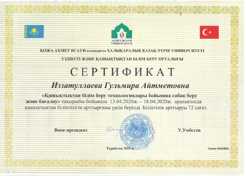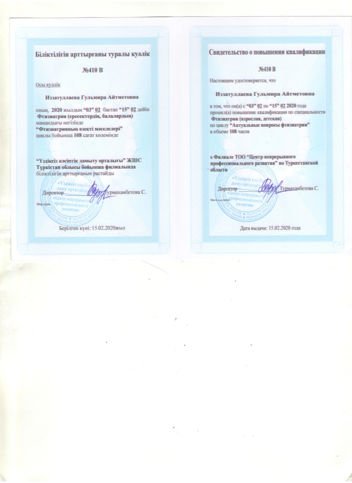 Автобиография Мен, Иззатуллаева Гульмира Айтметовна, 1972 жылы 18 маусымда Шымкент облысы, Тұркістан қаласында дүниеге келдім. 1989 жылы № 1 А.Науаи атындағы орта мектепті бітірдім.1989 жылдан 1995 жылға дейін Ташкент медицина педиатрия институтында оқыдым. Медициналық еңбек жолым 1995 -2005 жылдар аралығында Ташкент қаласында дәрігер- инфекционист болып жумыс жасаудан басталды.2005-2018 жылдар аралығында Тұркістан қаласы туберкулезге қарсы диспансерінде дәрігер фтизиатр болып жумыс жасадым . 2018 жылдан бастап Қ.А.Ясауи атындағы Халықаралық Қазақ-Түрік университетінде Пропедевтика және ішкі аурулар кафедрасында оқытуші қызметін атқарудамын. Жақын шетелдерде және отандық басылымдарда ғылыми медициналық мақалаларым жарық көрді. . Жанұялы, 3 қыз, 1 ұлдың анасімін. Жеке куәлік №040431851, ҚР ІІМ 25.07.2016 ж. берілген. Мекен-жайым: Тұркістан қаласы, Нурмаханов көшесі 14 үй. Тел: 8 (777) 402-34-54. E-mail: izzatullaeva.g@mail.ru ____________________ «____»___________ 2024 жыл.