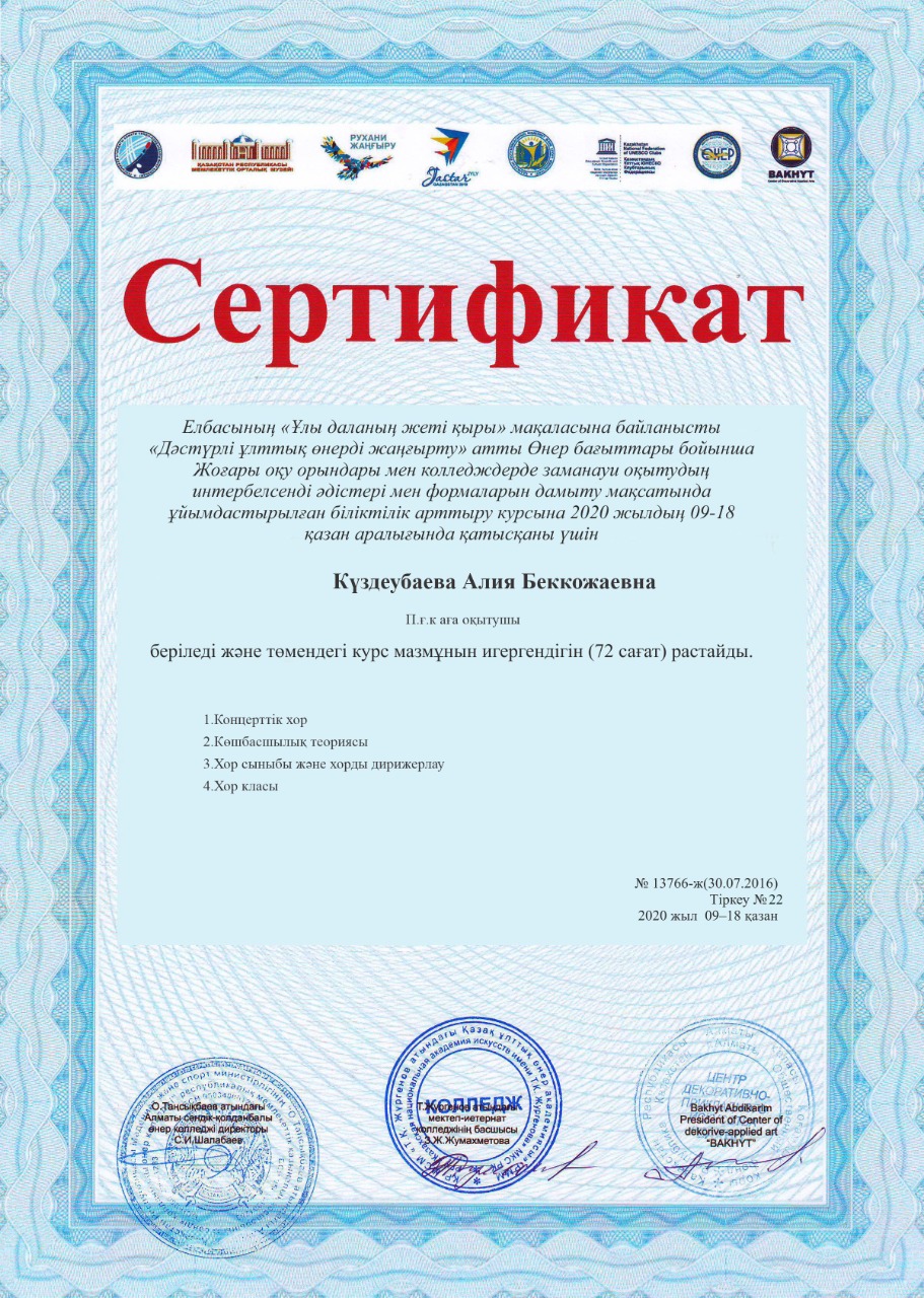 СВЕДЕНИЯ О СЕБЕ: Дата рождення:Национальность:Г ражданство:Семейное положение:Адрес:Сот.тел:e-mail:28.01.1964 г.р.казашкаРеспублика КазахстанзамужемЮКО. г. Шымкент, 194 квартал, уч. 40418 7013522033Alia_Kentau@mail. ruЦЕЛЬ:Перспективная работа, карьерный poст. Дальнейшееусовершенствование профессиональных качеств и навыков.ОБРАЗОВАНИЕ:Высшее: 1984-1989гг.Алматинская Государственная Консерватория имени Курмангазы, г. АлматыФакультет: «Вокально-хоровой»Специальность: «Дирижер хора, преподаватель дирижерско-хоровых дисциплин»Средне-специальное:1980-1984гг. Музыкальное училище имени П.И.Чайковского, г. АлматыОтделение: «Дирижерско-хоровое»Специальность: «Дирижер хора, преподаватель в ДМШ» преподаватель музыки в школе.2009ж. – Кандидат педагогических наук., 13.00.08 «Теория и методика профессионального обучения. 80-ге жуық ғылыми еңбектерім бар: соның ішінде – монография, электрондық-оқу құралы т.с.с. «Музыкалық білім» мамандығы бойынша, Білім Бағдарламасының әзірлеушісімін;Магистранттардың ғылыми-зерттеу жұмыстарына ғылыми жетекшілік жасаудамын;Жалпы педагогикалық өтілі – 33 жыл; ЖОО-да – 25 жыл;Халықаралық, Республикалық,Аймақтық деңгейінде бірталай шәкірттерді дайындадым. ДОПОЛНИТЕЛЬНАЯИНФОРМАЦИЯ:Более 80 научных трудов, в том числе монография, электроный учебник, более 10 учебных пособий и т.д. За последние годы 2019-2022 - 6 научных статей ККСОН, Подготовила несколько лауреатов Международных и Республиканских конкурсов: Алтынай Жорабаева, Сая Сейтимова, Даутов Тургынали и т.д.2021 год- обладатель гранта МОН РК на Грантовое финансирование: ИРН АР09561743 ( «Научно-теоретические основы толерантности как фактор развития личности в контексте современного педагогического образования» финансированиеОПЫТ РАБОТЫ: 1986-1995гг.- Преподаватель ДМШ, Преподаватель детской музыкально-хоровой студии при ДК «Горняков» г. Кентау, ЮКО;1995-1997гг. - МКТУ им. Х.А.Ясави, преподаватель кафедры «Актерское мастерство» г. Туркестан, ЮКО; 1997-2012гг.- МКТУ ШИ старший преподаватель кафедры «Искусство» г.Шымкент, ЮКО; 2012-2018жж.-Региональный социально-инновационный университет, проректор по учебно-методической, научно-исследовательской работе и инновационным технологиям, г. Шымкент, ЮКО;2018-2019гг.- декан факультета «Педагогики и филологии» Международного гуманитарно-технического университета, г. ШымкентС 2019 года по сегодняшний день – к.п.н. кафедры «Исполнительского искусства» МКТУ имени Х.А.Ясави, г.ТуркестанОбщий педагогический стаж: более 33 лет; стаж в ВУЗе – 25 лет.ВЛАДЕНИЕ ЯЗЫКАМИ:Казахский язык -100%Русский язык -100 %Английский язык - 70%КОМПЬЮТЕРНЫЕНАВЫКИ:Word, Internet, Excel, Е-mail. ЛИЧНЫЕ КАЧЕСТВА:Коммуникабельность, ответственностъ. пунктуальность, умение работать в команде, целеустремленность,опыт работы на руководящих должностях, честность, огромное желание. развиваться впрофессиональной сфере, Добиться своей поставленной цели икарьерного роста.