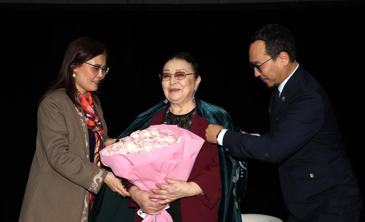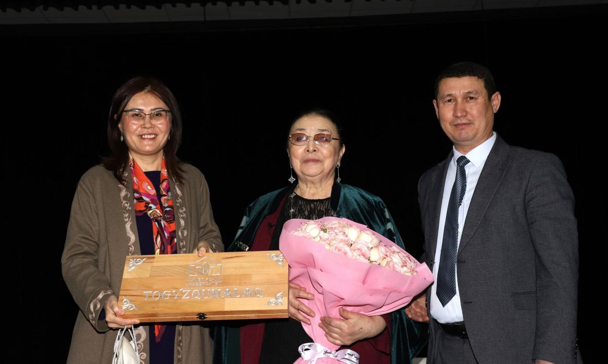 В завершение встречи Меруерт Утекешову, ставшую яркой звездой казахского искусства благодаря образу Кыз Жибек, поздравили с юбилеем и вручили подарки.