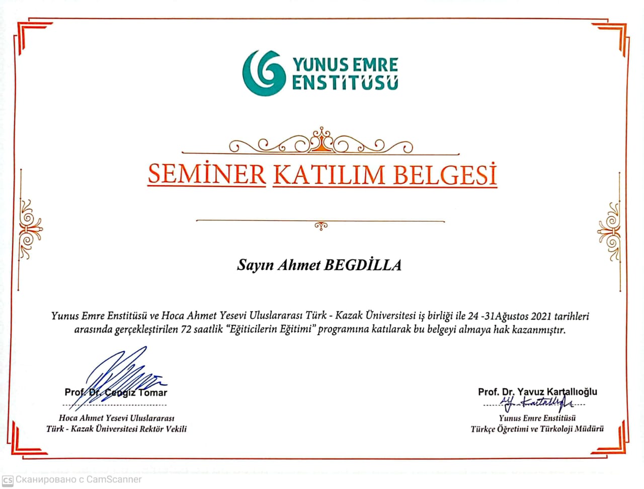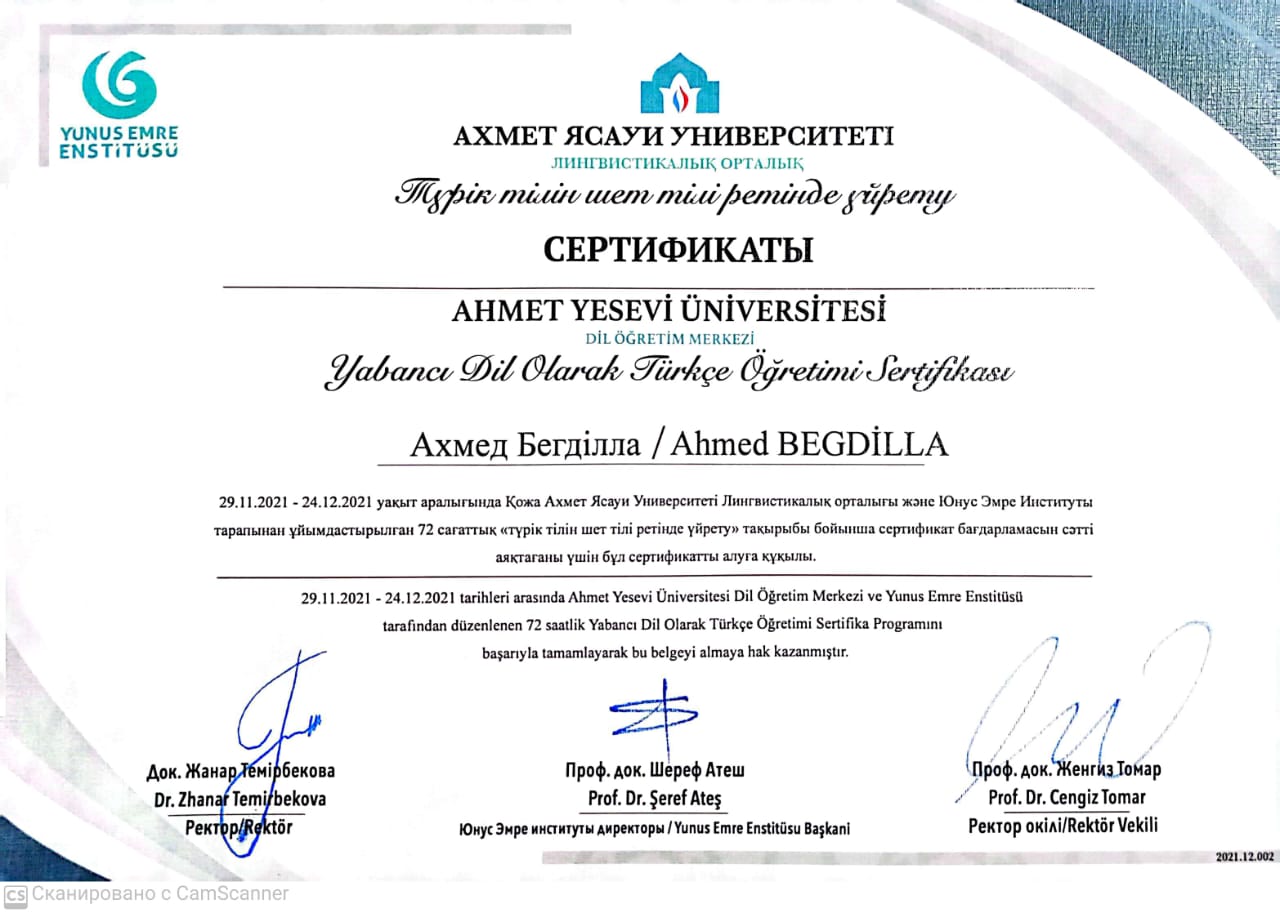 Ахмед Бегдилла родился 09.02.1977 году в городе Кентау1996-2000 Бакалавриат6 МКТУ имени Х.А.Ясави2000-2002 Магистрант Университета Сакария, Турция2002-2003 гг. Казахско-турецкий лицей им.Ататюрка. Х.А.Ясави, преподаватель Казахского языка и литературы, турецкого языка, Кентау2003-2006 МКТУ имени Х.А.Ясави преподаватель турецкого языка, Туркестан2006-2008гг. Сембол Иншаат. Переводчик, администратор Алматы2008-2010гг.Идил Аксу. Менеджер отдела кадров АлматыС 2010 по настоящее время МКТУ имени Х.А.Ясави преподаватель турецкого языкаС 2016 года по настоящее время Заместитель декана по воспитательной части довузовского подготовительного факультета в МКТУ имени Х.А.Ясави