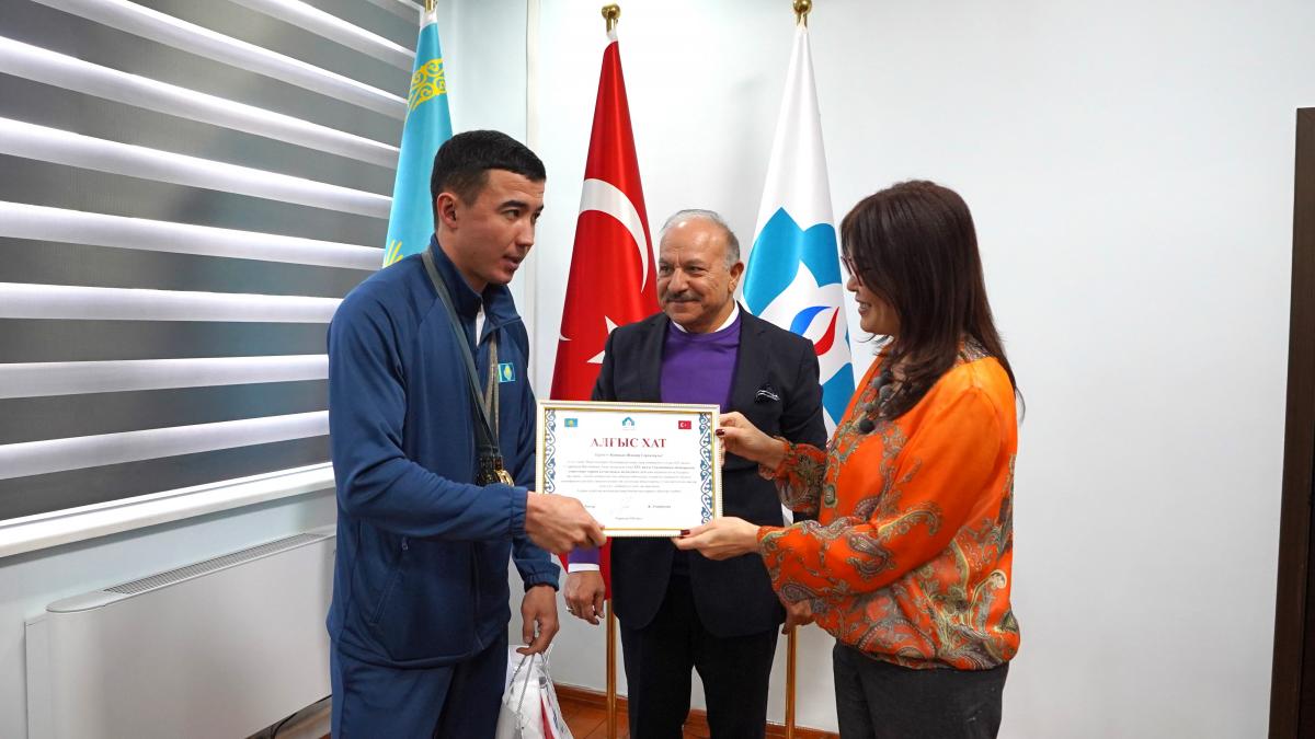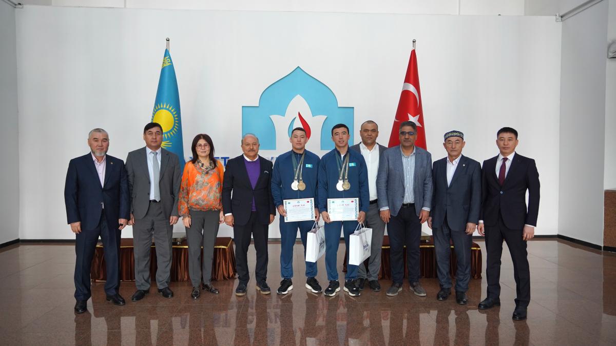 Şampiyon sporcularımız Şadiyar Kuandık ve Toktarbek Aydarbek, kendilerine gösterilen ilgi ve destek için üniversite yönetimine teşekkürlerini ifade etti.