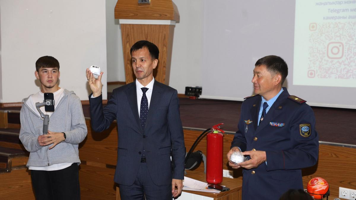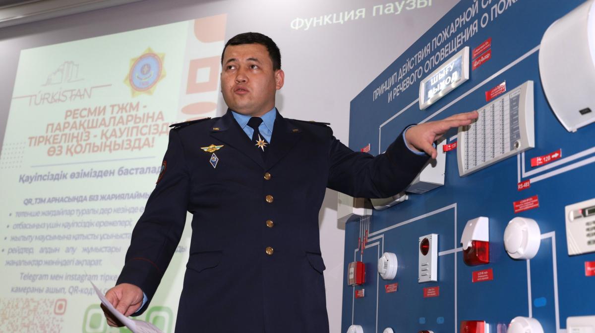 Ardından söz alan Türkistan İl Acil Durum Dairesi Devlet Yangın Denetimi Birimi Başkanı, Sivil Savunma alanında binbaşı Meyramhan Kemelhanov, öğrencilere yangından korunma yöntemleri hakkında kapsamlı bilgi verdi.