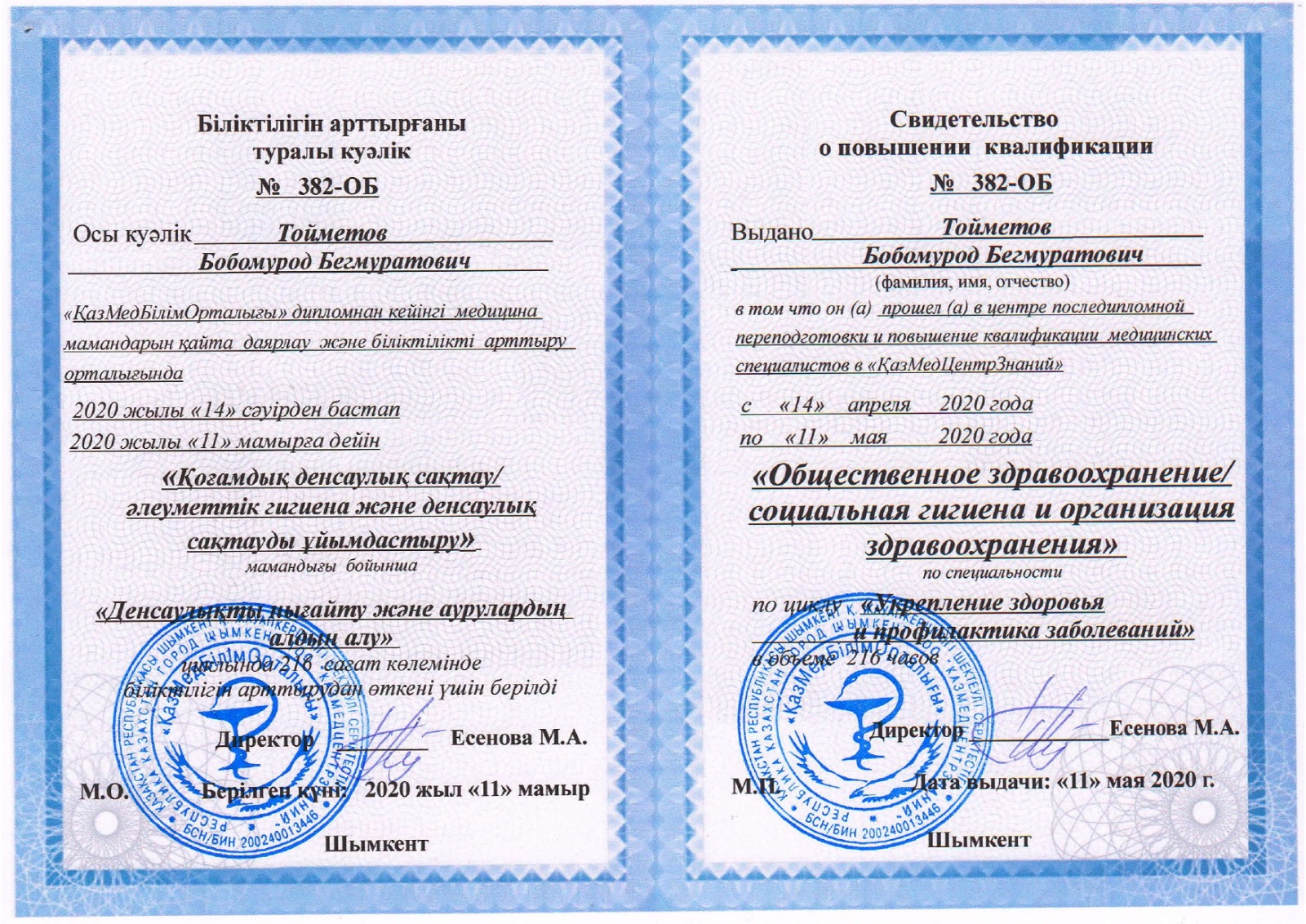 Тойметов Бобомурод Бегмуратович - 2001-2008г. Южно Казахстанская Государственная Медицинская Академия Специальность: Врач терапевт. 2008-2010 гг. Министерство Обороны РК, ГУ-Войсковая часть - врач бригады постоянной боевой готовности. 2011 год Преподаватель Медицинского колледжа «Сайрам». 2011 год Врач эксперт ГККП Сайрамской районной поликлиники «Сайрам» (Далее переименован) в ГККП Шымкентскую городскую поликлинику №12. С января 2017 года по октябрь-врач эксперт-совместно статист в ГККП «Областной детский реабилитационный центр». 2017-октябрь по май 2023г заместитель директора по УПР- в ТОО «Средне-Азиатский Высший медицинский колледж». 2020года февраль по август врач эксперт ГККП «Реабилитационный центр №1». С 2023года май месяця по 2024 год август-Врач эксперт- ГКП на ПХВ «ГП №12». Заместитель декана факультета ПДОВ в условиях МКТУ имени Х.А.Ясави (2 сентября 2024года).