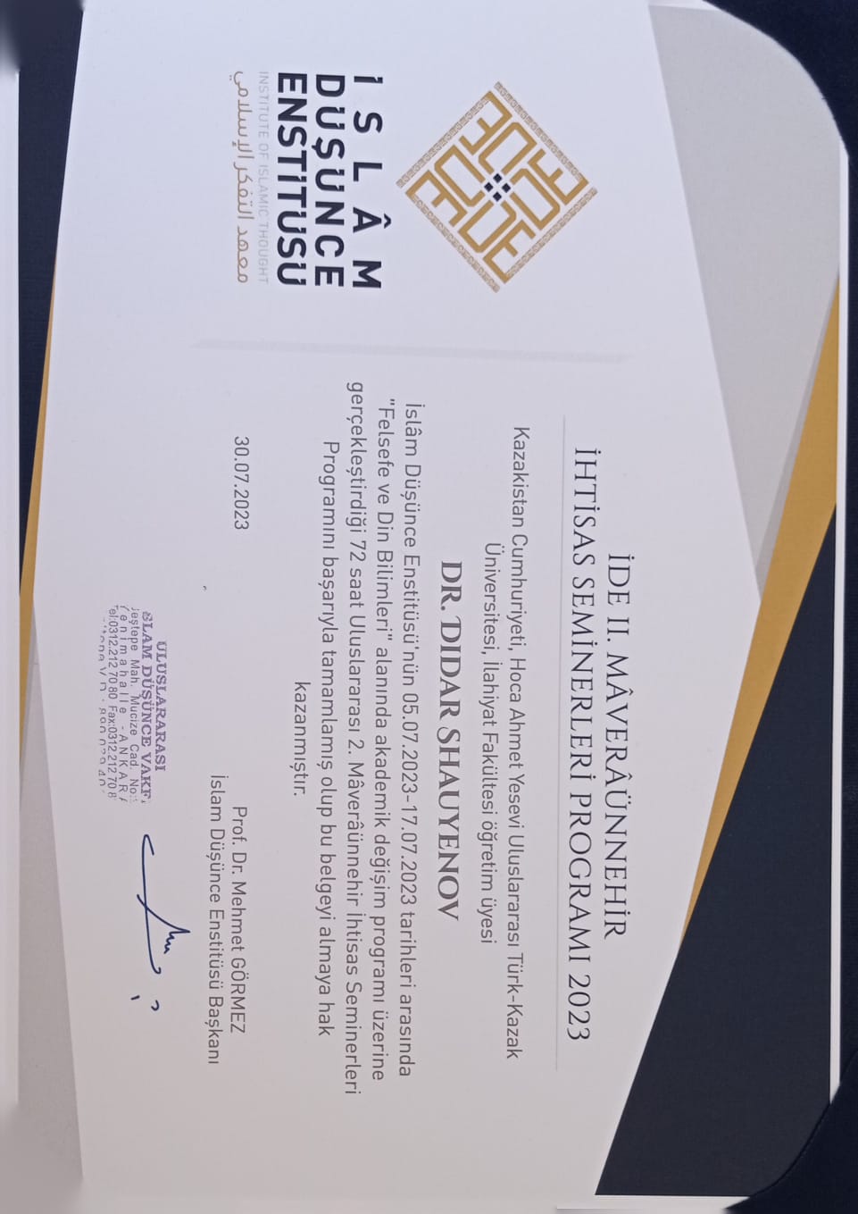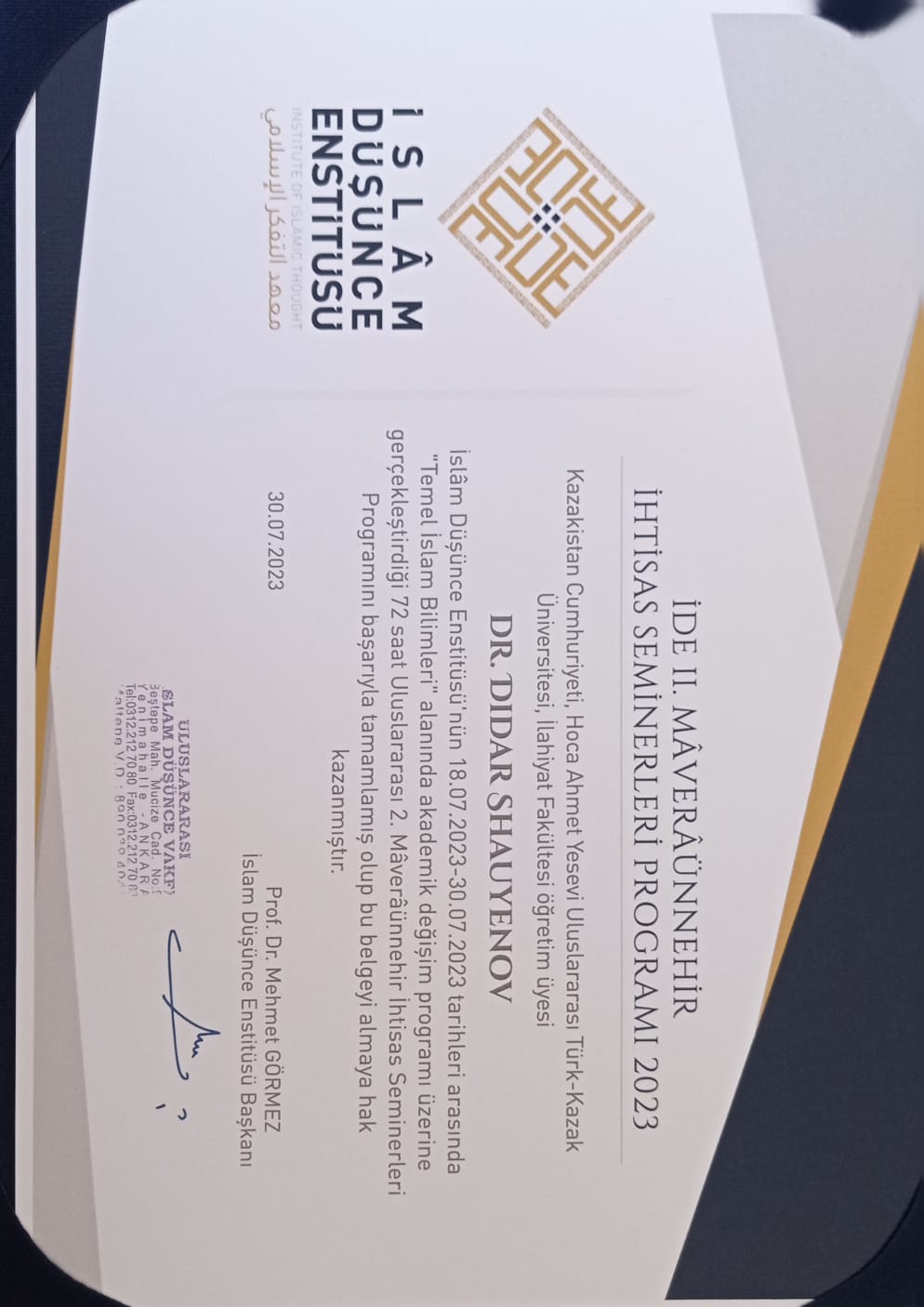 ШАУЕНОВ ДИДАР ШАУЕНҰЛЫ15.09.1976 ж. Шымкент қаласында дүниеге келген.1983-1993 ОҚО Түлкібас ауданы Ақбиік селосы В.И.Ленин атындағы орта мектеп1993-1997 жж. Қ.А.Ясауи атындағы ХҚТУ, Философия-дінтану мамандығының бакалавры1999-2002 Анкара университеті Әлеуметтік ғылымдар институты магистранты;2002-2003 Қ.А.Яссауи атындағы ХҚТУ-да жалпы бөлім референті2003-2006 Ясауитану ғылыми зерттеу орталығы ғылыми қызметкер2003-2011 Қ.А.Яссауи атындағы ХҚТУ-да Дінтану кафедрасы аға оқытушысы2008-2011 Дінтану зертханасы меңгерушісі2011-2018 жылы Эрджиес университеті Әлеуметтік ғылымдар институты докторанты.2018-2022 Қ.А.Яссауи атындағы ХҚТУ-да Дінтану кафедрасында аға оқытушы, PhD. 2022-2023 ж. Дінтану кафедрасының меңгерушісі2023 ж. бастап Теология кафедрасының меңгерушісі