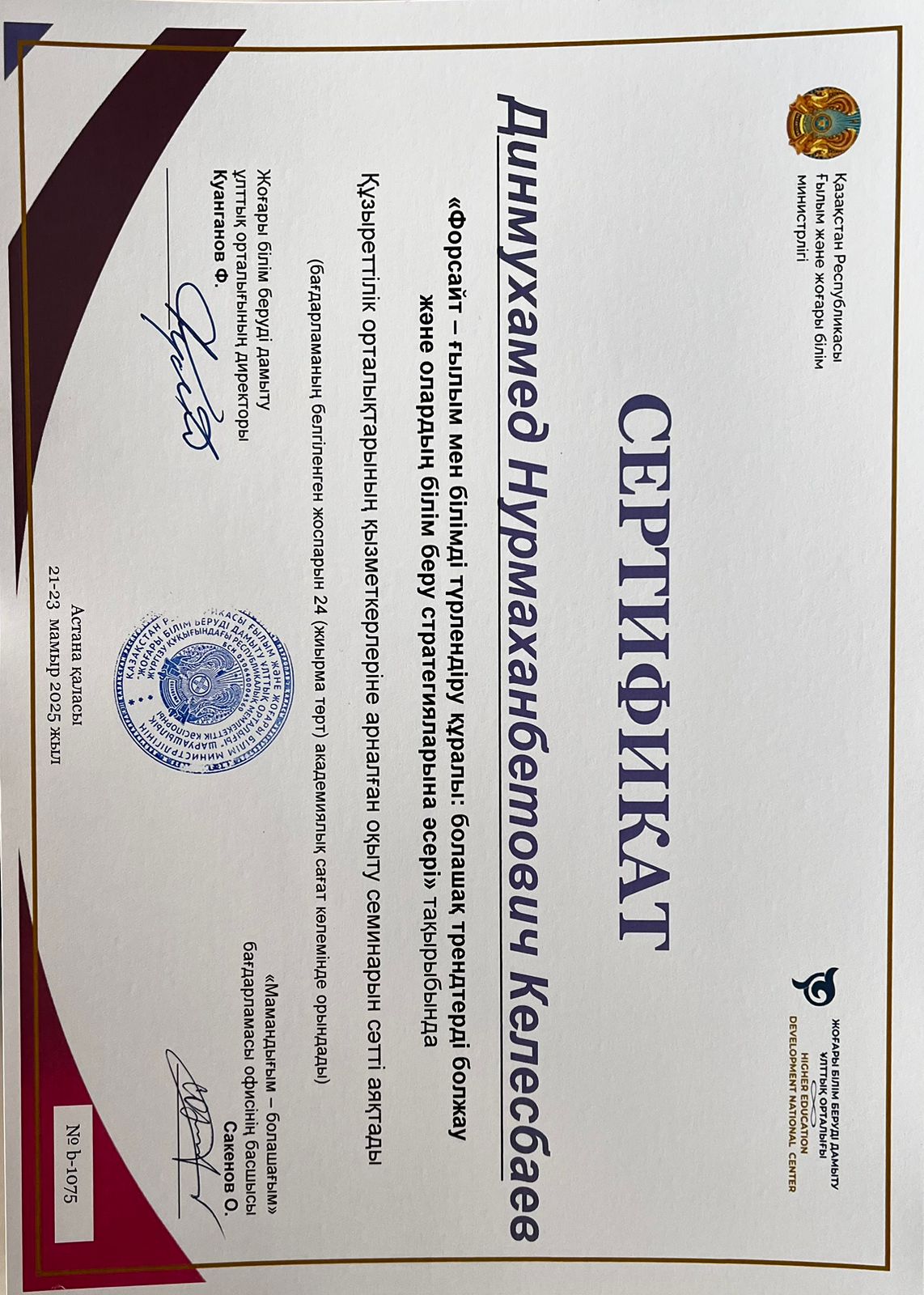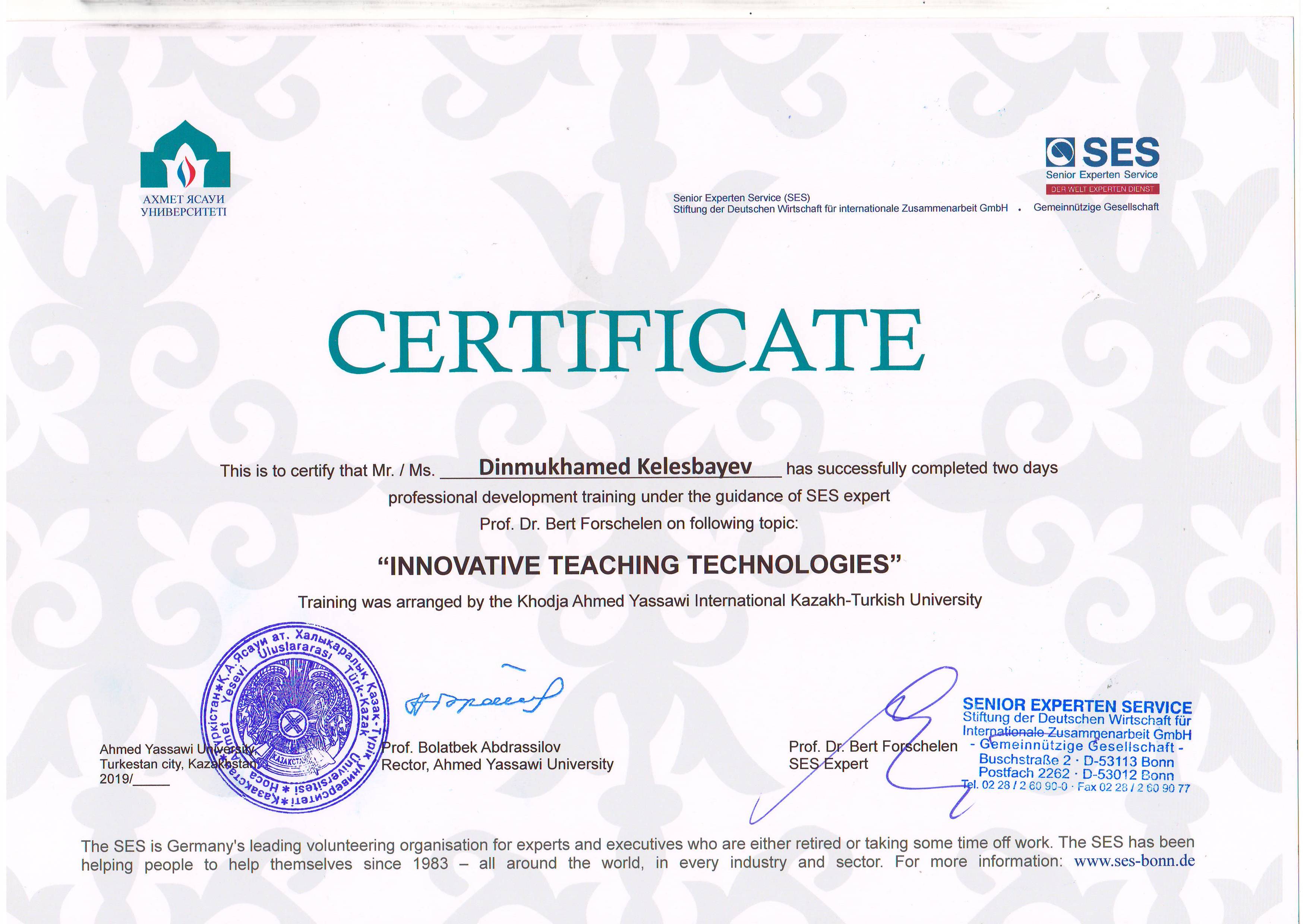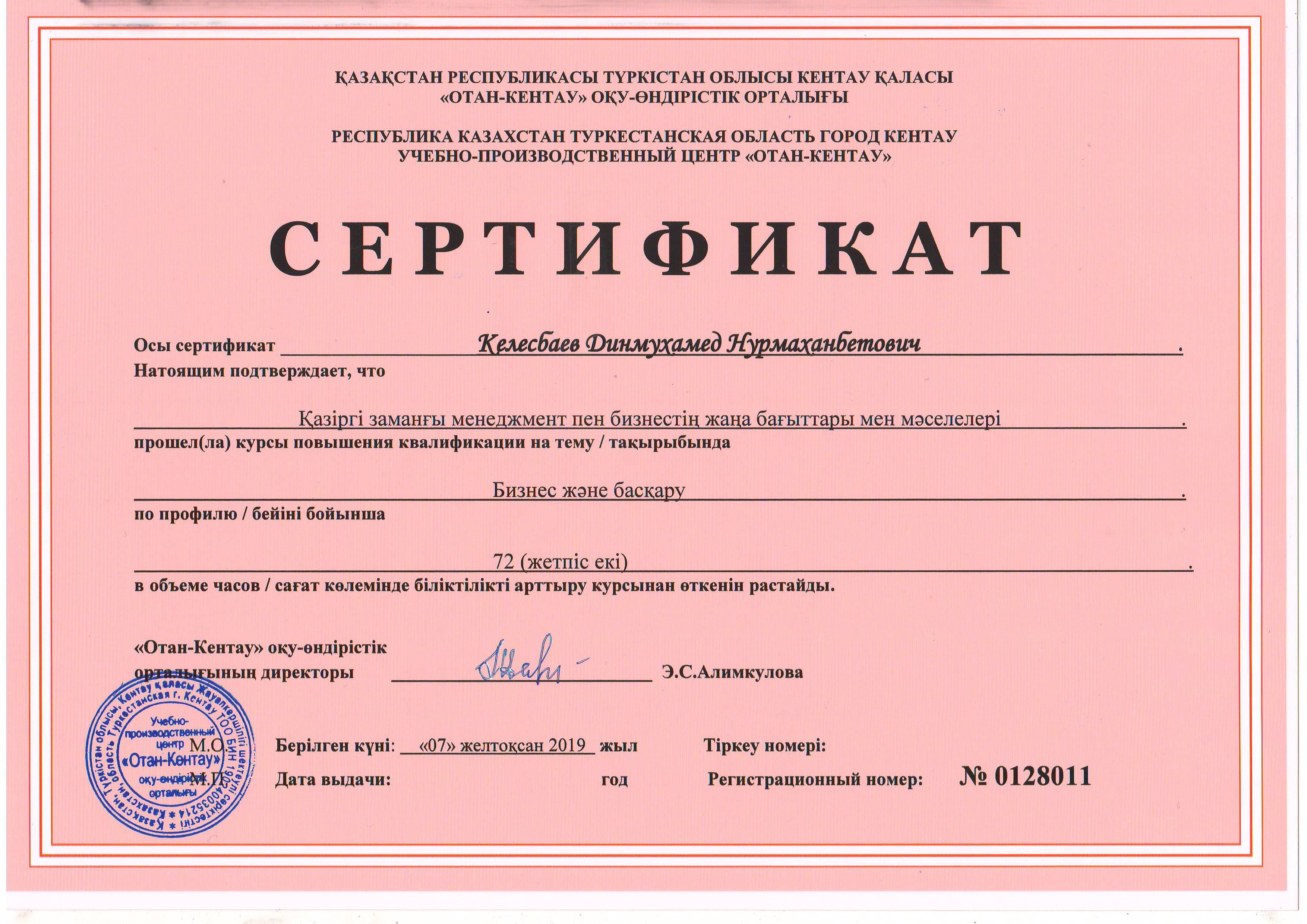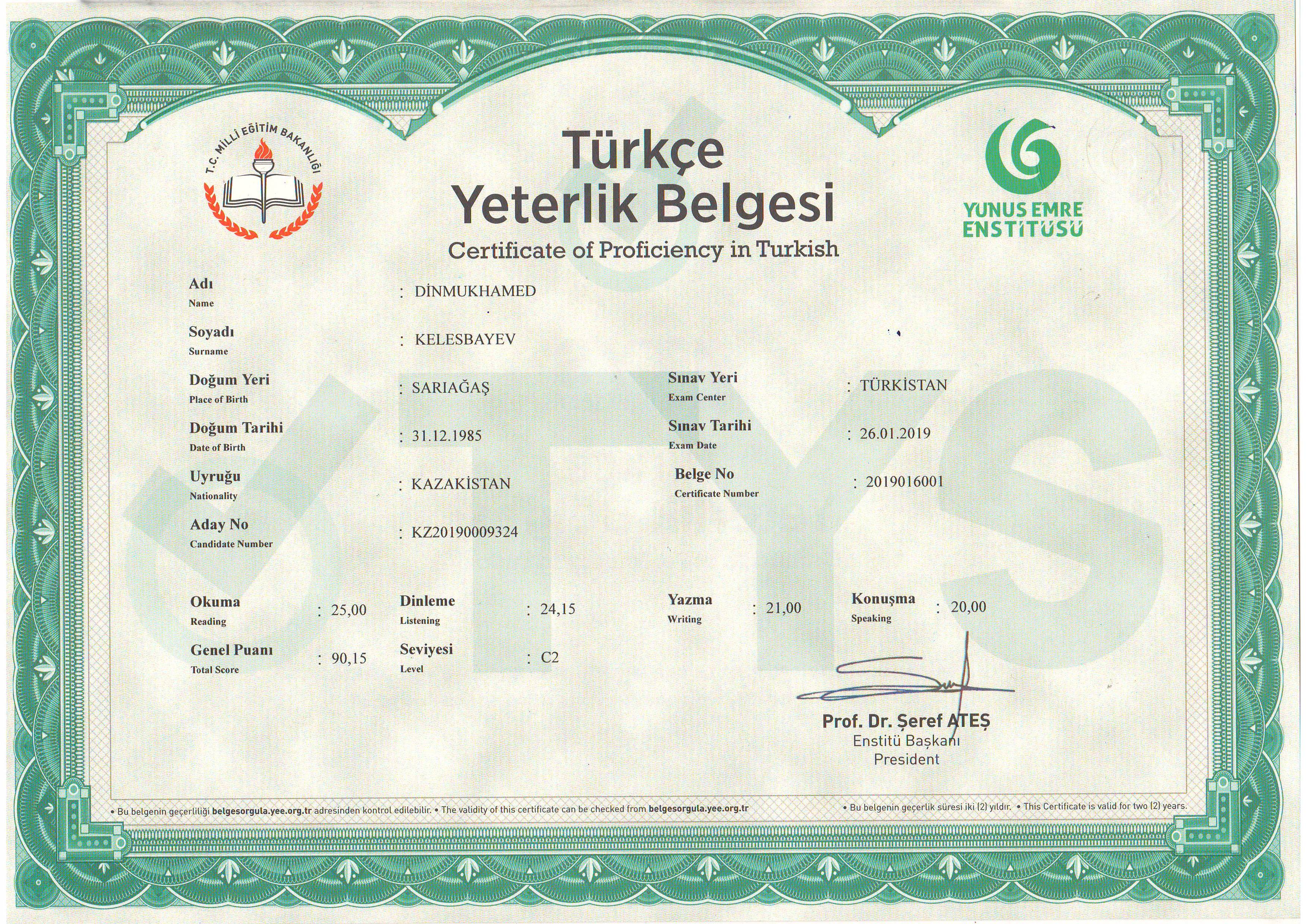 Келесбаев Динмухамед НурмаханбетұлыныңӨМІРБАЯНЫ 1. Туған жылы: 31.12.1985 ж.2. Қызметі: Қожа Ахмет Ясауи атындағы Халықаралық қазақ-түрік университеті Экономика, басқару және құқық факультеті Менеджмент және туризм кафедрасының профессоры3. Ғылыми дәрежесі және атағы: PhD Доктор, Профессор4. Мекен-жайы: Түркістан облысы, Түркістан қаласы, 161200, Б.Саттарханов даңғылы №29, Ректорат ғимараты, №215 кабинет, 5. Байланыс: 8 (725 33) 3-36-36 / 13-39, 8 747 046 23 77, dinmukhamed.kelesbayev@ayu.edu.kz6. Білімі: Жоғары- Бакалавриатура (2002-206): Мемлекеттік және жергілікті басқару / Қ.А.Яссауи атындағы ХҚТУ, үздік- Магистратура (2006-2008): Экономика / Қ.А.Яссауи атындағы ХҚТУ, үздік- Докторантура (2009-2014): Менеджмент / Түркия, Гази университеті- Тағылымдама (2022-2023): Жоғары білім беру саласындағы менеджмент және көшбасшылық / Джордж Вашингтон университеті (The George Washington University), АҚШ7. Еңбек жолы: Жалпы еңбек өтілі 17 жыл:- 2007-2009 жылдары Қ.А.Яссауи атындағы ХҚТУ-да Жастар ісінің маманы, Тәрбиеші, Референт, Ғылым бөлімінің инспекторы- 2009-2014 жылдары Түркия Гази университетінің PhD докторанты- 2014-2016 жылдары Қ.А.Яссауи атындағы ХҚТУ-да Ғылым бөлімінің басшысы- 2014-… Қ.А.Яссауи атындағы ХҚТУ-да «Менеджмент және туризм» кафедрасының PhD доктор, аға оқытушы, доцент, профессор.- 2016-2018 жылдары Қ.А.Яссауи атындағы ХҚТУ-да Әлеуметтік ғылымдар факультетінің оқу ісі жөніндегі декан орынбасары- 2018-2021 жылдары Қ.А.Яссауи атындағы ХҚТУ-да Мемлекеттік басқару және экономика жоғары мектебі Менеджмент және лидерлікті дамыту бағдарламасының жетекшісі- 2021-2024 жылдары Қ.А.Яссауи атындағы ХҚТУ-да Экономика, басқару және құқық факультетінің деканы- 2024 - … Қ.А.Яссауи атындағы ХҚТУ-да Экономика, басқару және құқық факультеті Менеджмент және туризм кафедрасының профессоры8. Жеткен жетістіктері:- Түркия Республикасының Жоғары білім беру Кеңесінің 2014 жылдың 2 шілдесі күнгі шешімімен Менеджмент мамандығы бойынша ғылым докторы, - Қазақстан Республикасы Білім және ғылым министрлігі Білім және ғылым саласындағы бақылау комитетінің «Ғылыми дәрежесі дипломының баламалығын тану және философия докторы (PhD) ғылыми дәрежесін беру туралы» 2015 жылдың 15 қазан күнгі №1374 Бұйрығымен Түркия Республикасында алынған ғылыми дәреженің баламалығы танылып, 6D050700-Менеджмент мамандығы бойынша философия докторы (PhD) ғылыми дәрежесі берілді.- «Ұлыбританияның Ньюкасл университетінде «Жоғары білім беруде үйрену мен үйрету» тақырыбындағы өткен 72 сағаттық біліктілік арттыру курсының сертификаты (24.11.-03.12.2015).- ҚР БҒМ «ӨРЛЕУ» Біліктілікті арттыру Ұлттық орталығының 240 сағаттық сертификаты (06.11.-05.12.2015).- Түркия Республикасының Экономика министрлігінің ұйымдастырумен өткен 48 сағаттық семинардың сертификаты (13-18.11.2017).- Қазақстан Республикасы Білім және ғылым Министрінің «2018 жылғы ғылым саласындағы атаулы сыйлықтарды және мемлекеттік ғылыми стипендияларды тағайындау туралы» 2018 жылғы 6 желтоқсандағы №672 Бұйрығымен Дарынды жас ғалымдарға арналған «Мемлекеттік ғылыми стипендия» берілді.- Қазақстан Республикасы Білім және ғылым министрлігі Білім және ғылым саласындағы бақылау комитеті Төрағасының «Ғылыми атақ беру туралы» 2018 жылғы 14 желтоқсандағы №1996 Бұйрығымен «08.00.00 – Экономика» мамандығы бойынша Қауымдастырылған профессор (доцент) ғылыми атағы берілді.- Республикалық комиссияның 08.09.2021 ж. шешімі бойынша “Болашақ” Халықаралық стипендиясының иегері (АҚШ, Д