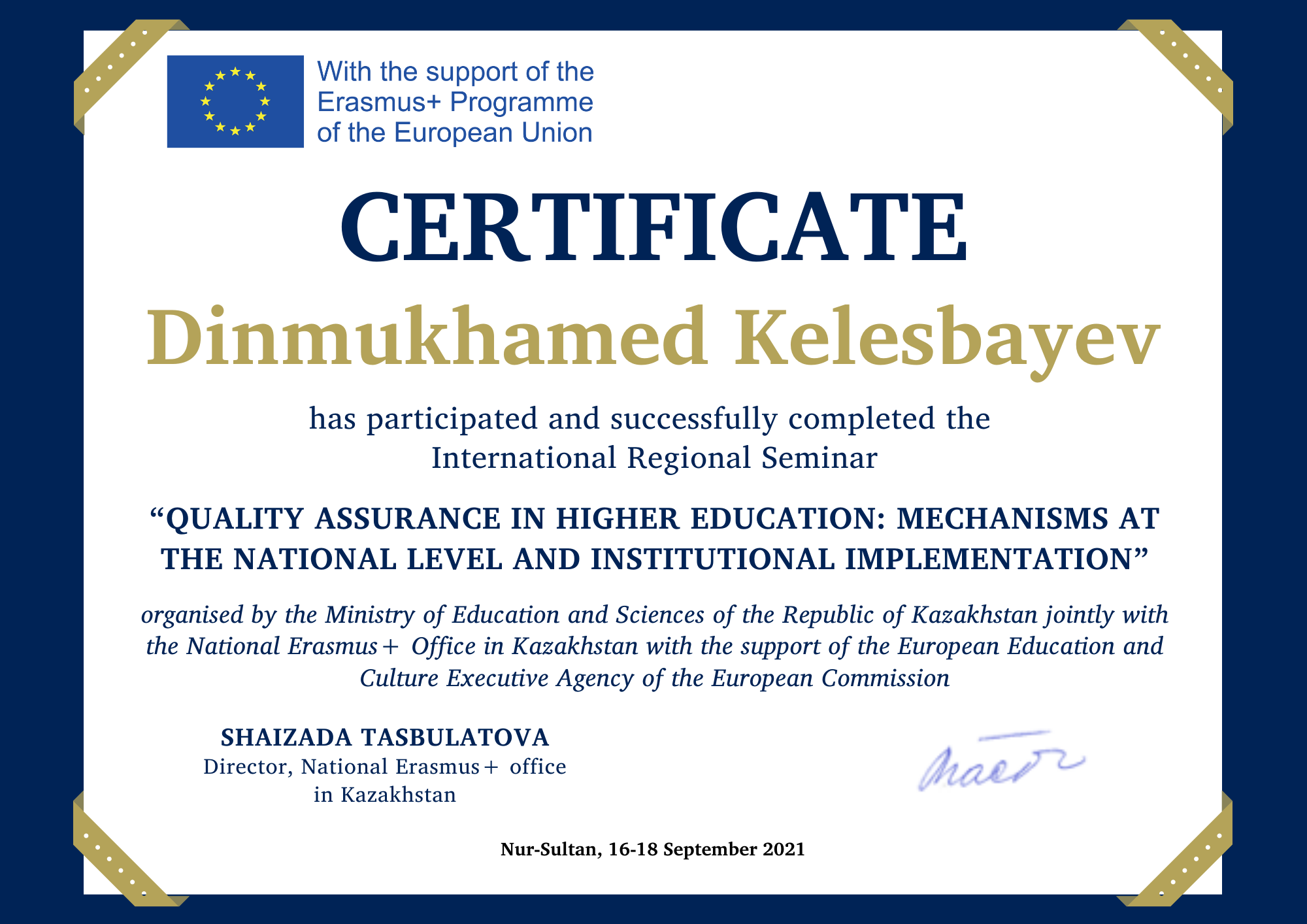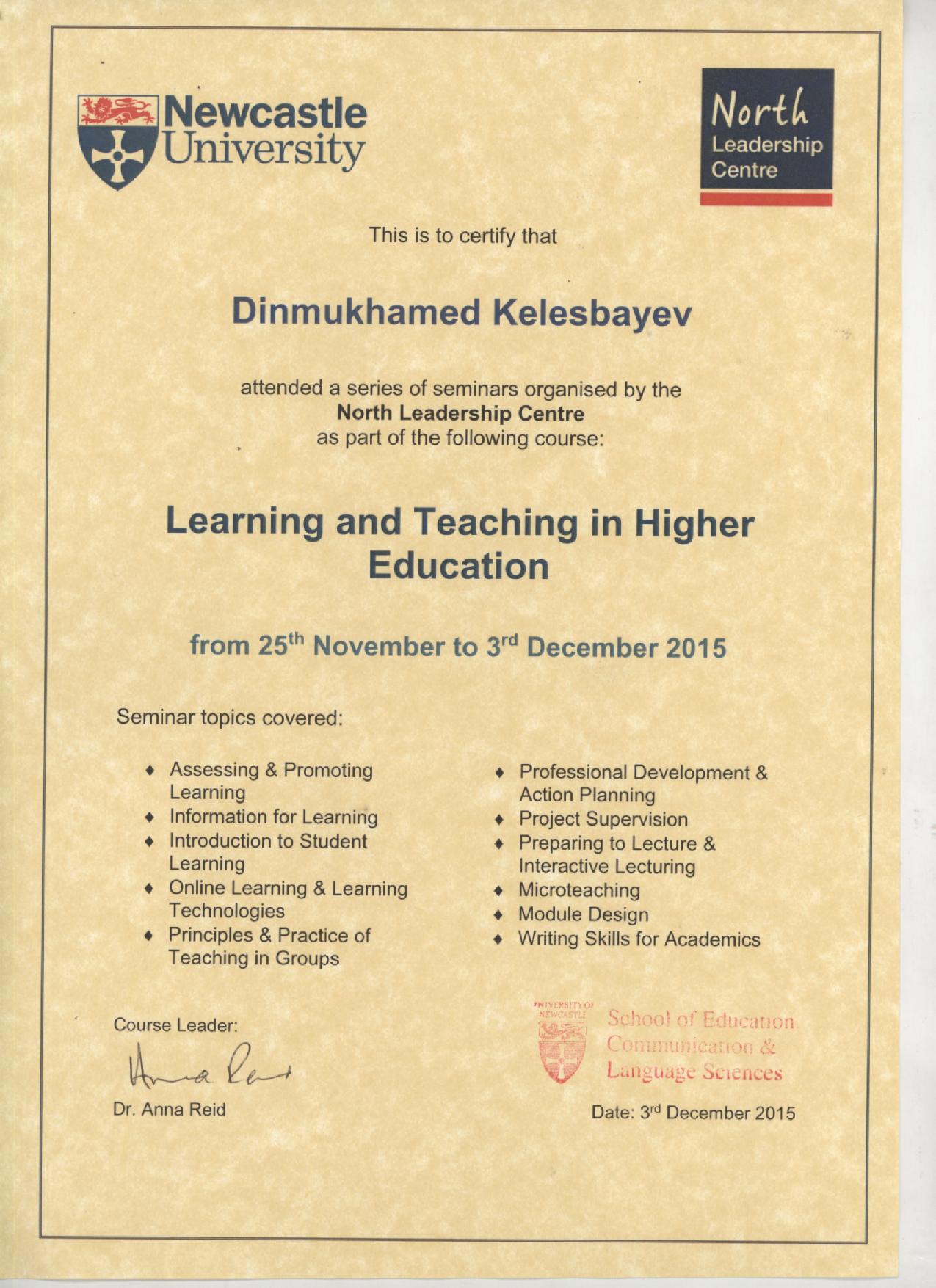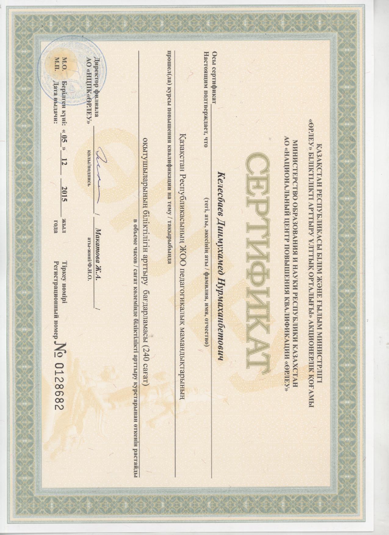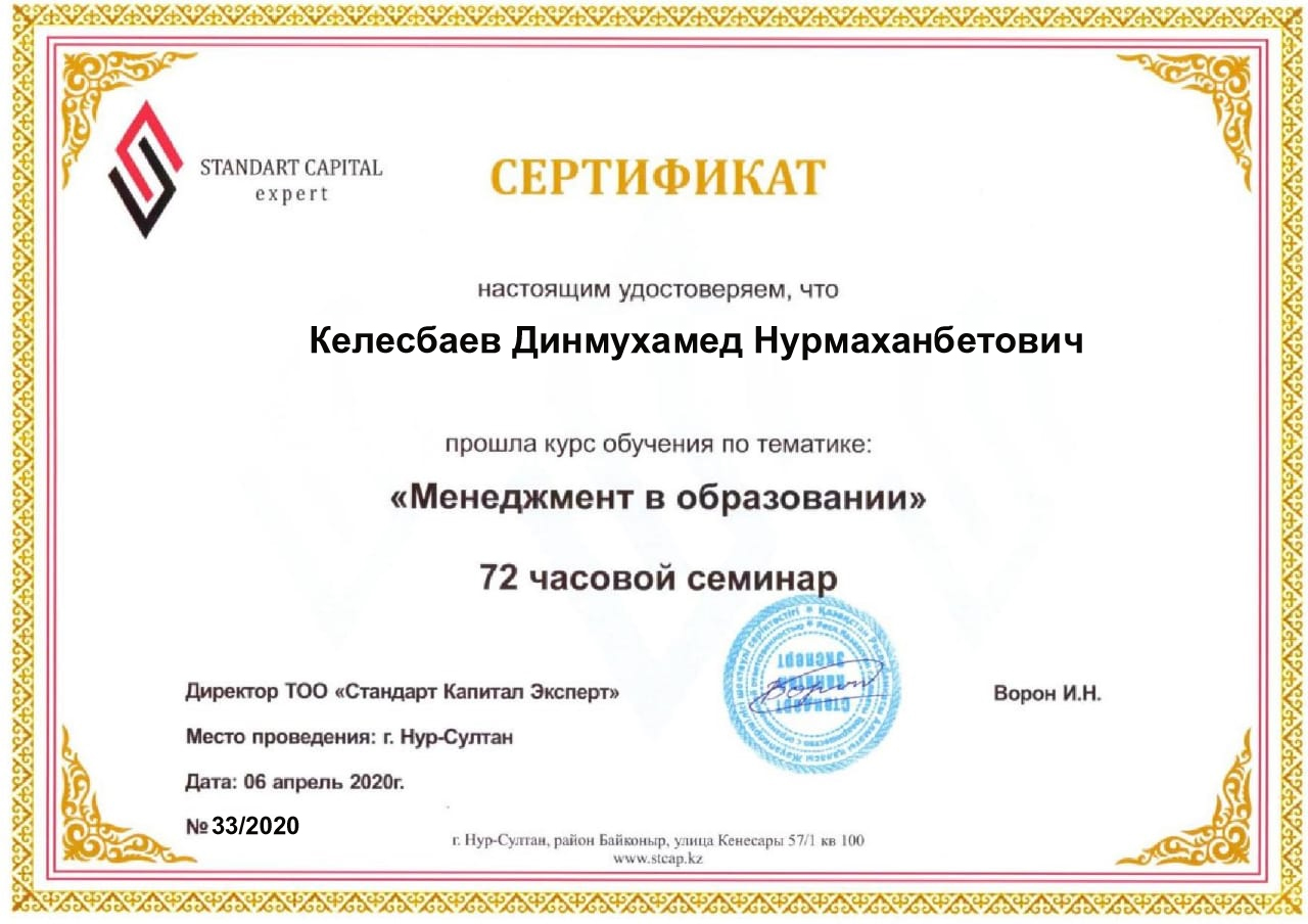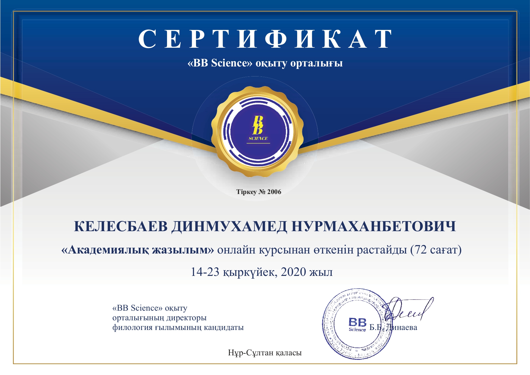 Келесбаев Динмухамед НурмаханбетұлыныңӨМІРБАЯНЫ 1. Туған жылы: 31.12.1985 ж.2. Қызметі: Қожа Ахмет Ясауи атындағы Халықаралық қазақ-түрік университеті Экономика, басқару және құқық факультеті Менеджмент және туризм кафедрасының профессоры3. Ғылыми дәрежесі және атағы: PhD Доктор, Профессор4. Мекен-жайы: Түркістан облысы, Түркістан қаласы, 161200, Б.Саттарханов даңғылы №29, Ректорат ғимараты, №215 кабинет, 5. Байланыс: 8 (725 33) 3-36-36 / 13-39, 8 747 046 23 77, dinmukhamed.kelesbayev@ayu.edu.kz6. Білімі: Жоғары- Бакалавриатура (2002-206): Мемлекеттік және жергілікті басқару / Қ.А.Яссауи атындағы ХҚТУ, үздік- Магистратура (2006-2008): Экономика / Қ.А.Яссауи атындағы ХҚТУ, үздік- Докторантура (2009-2014): Менеджмент / Түркия, Гази университеті- Тағылымдама (2022-2023): Жоғары білім беру саласындағы менеджмент және көшбасшылық / Джордж Вашингтон университеті (The George Washington University), АҚШ7. Еңбек жолы: Жалпы еңбек өтілі 17 жыл:- 2007-2009 жылдары Қ.А.Яссауи атындағы ХҚТУ-да Жастар ісінің маманы, Тәрбиеші, Референт, Ғылым бөлімінің инспекторы- 2009-2014 жылдары Түркия Гази университетінің PhD докторанты- 2014-2016 жылдары Қ.А.Яссауи атындағы ХҚТУ-да Ғылым бөлімінің басшысы- 2014-… Қ.А.Яссауи атындағы ХҚТУ-да «Менеджмент және туризм» кафедрасының PhD доктор, аға оқытушы, доцент, профессор.- 2016-2018 жылдары Қ.А.Яссауи атындағы ХҚТУ-да Әлеуметтік ғылымдар факультетінің оқу ісі жөніндегі декан орынбасары- 2018-2021 жылдары Қ.А.Яссауи атындағы ХҚТУ-да Мемлекеттік басқару және экономика жоғары мектебі Менеджмент және лидерлікті дамыту бағдарламасының жетекшісі- 2021-2024 жылдары Қ.А.Яссауи атындағы ХҚТУ-да Экономика, басқару және құқық факультетінің деканы- 2024 - … Қ.А.Яссауи атындағы ХҚТУ-да Экономика, басқару және құқық факультеті Менеджмент және туризм кафедрасының профессоры8. Жеткен жетістіктері:- Түркия Республикасының Жоғары білім беру Кеңесінің 2014 жылдың 2 шілдесі күнгі шешімімен Менеджмент мамандығы бойынша ғылым докторы, - Қазақстан Республикасы Білім және ғылым министрлігі Білім және ғылым саласындағы бақылау комитетінің «Ғылыми дәрежесі дипломының баламалығын тану және философия докторы (PhD) ғылыми дәрежесін беру туралы» 2015 жылдың 15 қазан күнгі №1374 Бұйрығымен Түркия Республикасында алынған ғылыми дәреженің баламалығы танылып, 6D050700-Менеджмент мамандығы бойынша философия докторы (PhD) ғылыми дәрежесі берілді.- «Ұлыбританияның Ньюкасл университетінде «Жоғары білім беруде үйрену мен үйрету» тақырыбындағы өткен 72 сағаттық біліктілік арттыру курсының сертификаты (24.11.-03.12.2015).- ҚР БҒМ «ӨРЛЕУ» Біліктілікті арттыру Ұлттық орталығының 240 сағаттық сертификаты (06.11.-05.12.2015).- Түркия Республикасының Экономика министрлігінің ұйымдастырумен өткен 48 сағаттық семинардың сертификаты (13-18.11.2017).- Қазақстан Республикасы Білім және ғылым Министрінің «2018 жылғы ғылым саласындағы атаулы сыйлықтарды және мемлекеттік ғылыми стипендияларды тағайындау туралы» 2018 жылғы 6 желтоқсандағы №672 Бұйрығымен Дарынды жас ғалымдарға арналған «Мемлекеттік ғылыми стипендия» берілді.- Қазақстан Республикасы Білім және ғылым министрлігі Білім және ғылым саласындағы бақылау комитеті Төрағасының «Ғылыми атақ беру туралы» 2018 жылғы 14 желтоқсандағы №1996 Бұйрығымен «08.00.00 – Экономика» мамандығы бойынша Қауымдастырылған профессор (доцент) ғылыми атағы берілді.- Республикалық комиссияның 08.09.2021 ж. шешімі бойынша “Болашақ” Халықаралық стипендиясының иегері (АҚШ, Д